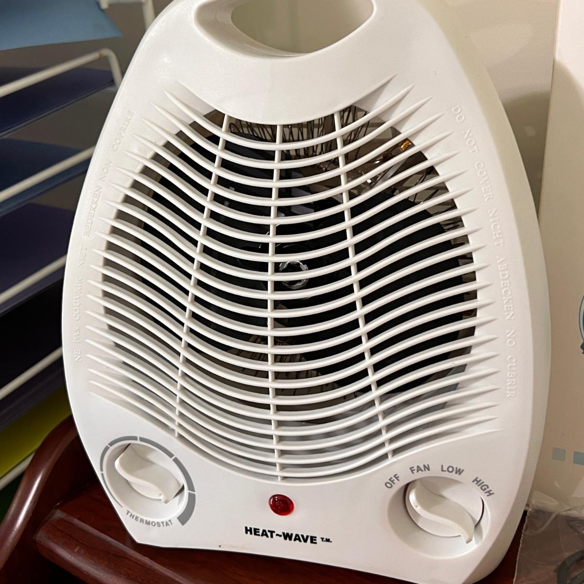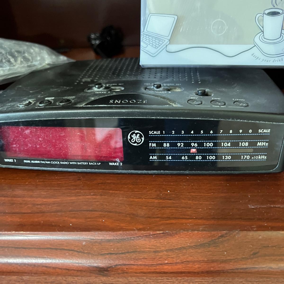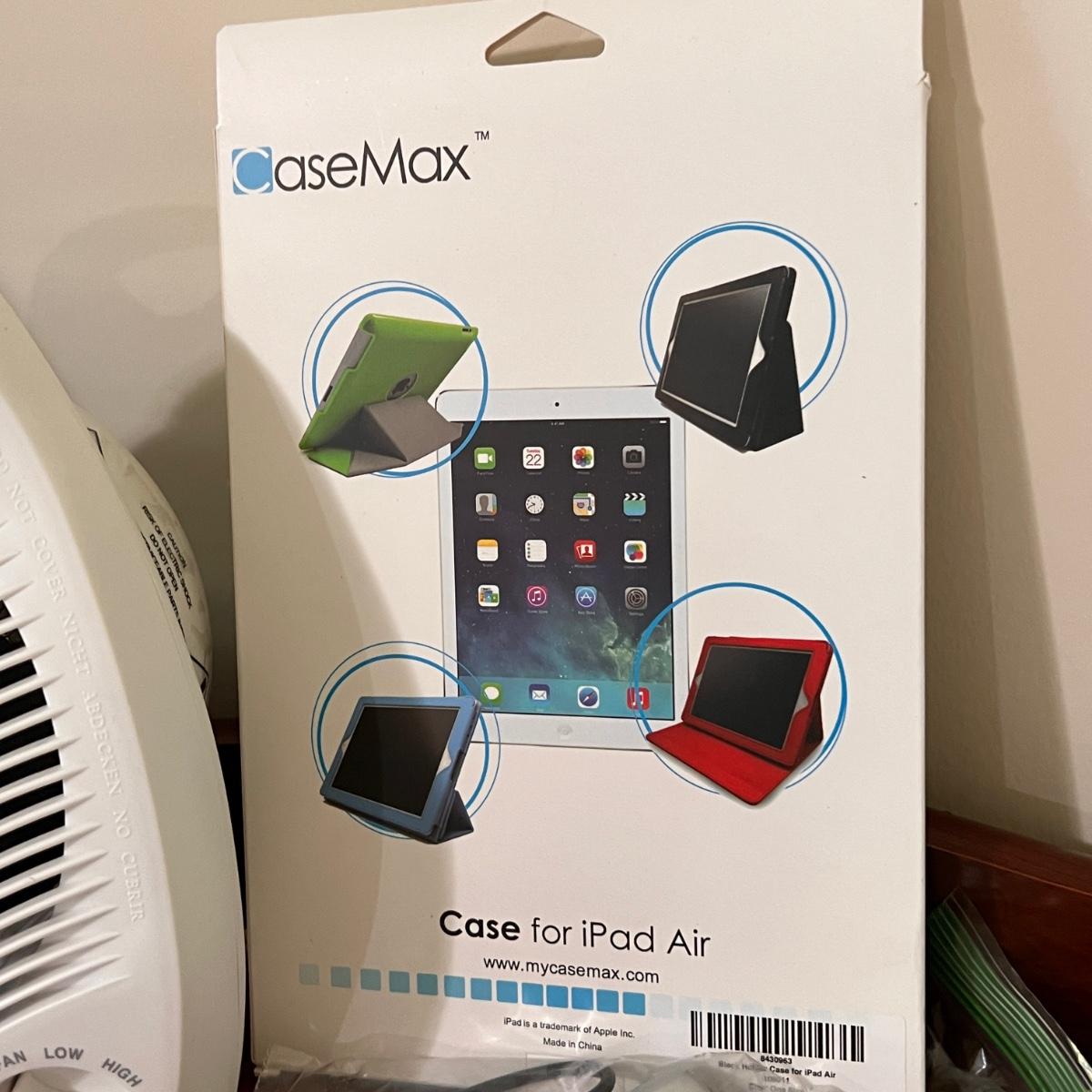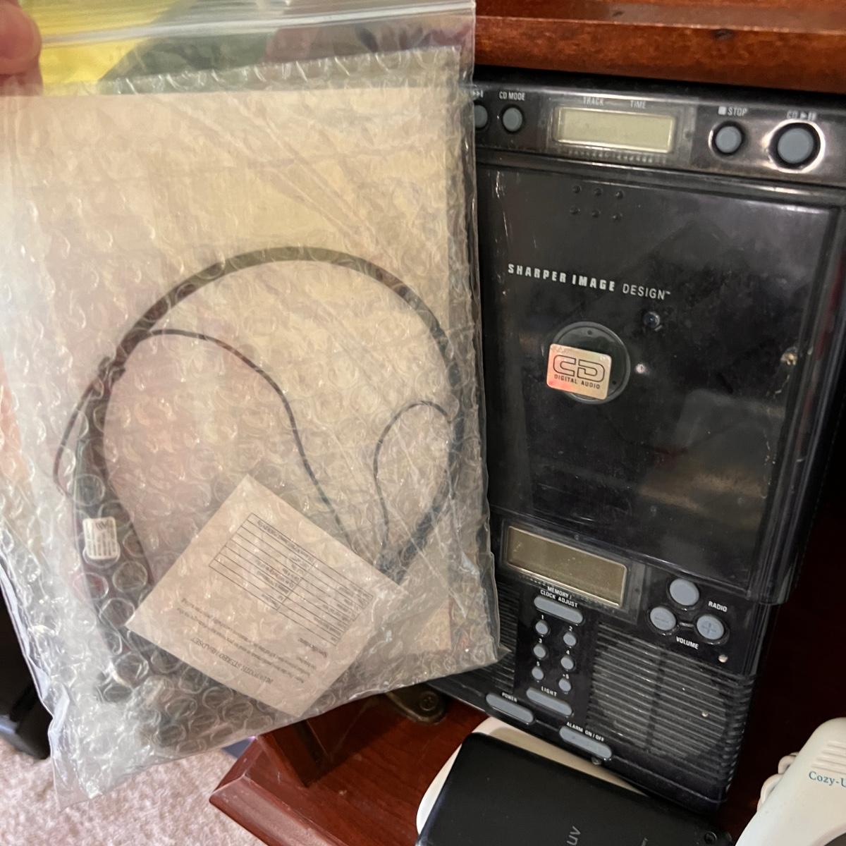 Portable office space heater, 2 portable battery chargers, Garmin GPS, 3 pairs earbuds, new wireless bluetooth headphones, wireless bluetooth over ear headset, new case for iPad Air, apple phone charger cables, usb powered mug warmer, sharper image shower cd player untested, GE radio alarm clock.