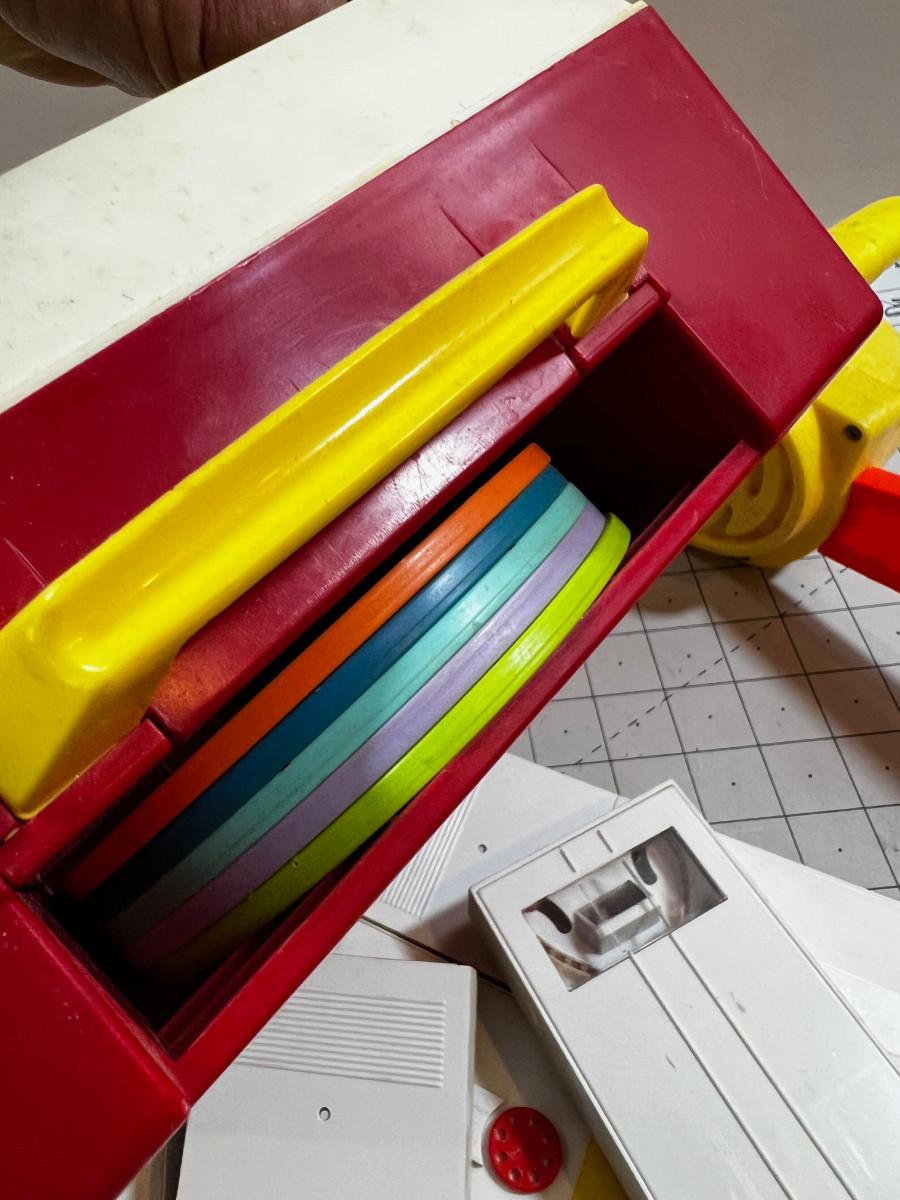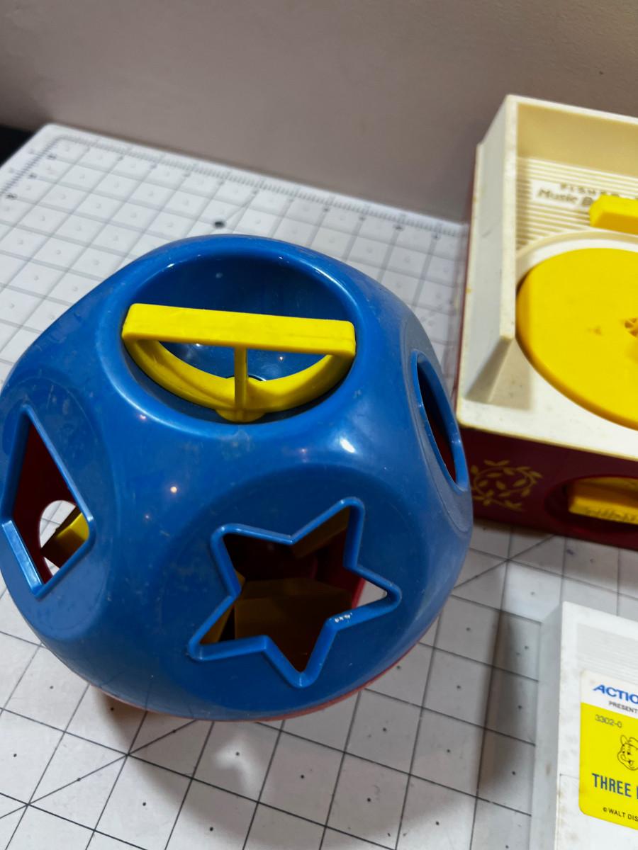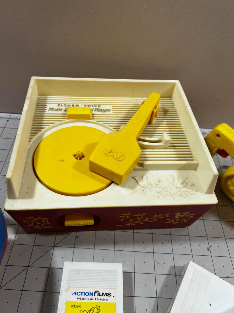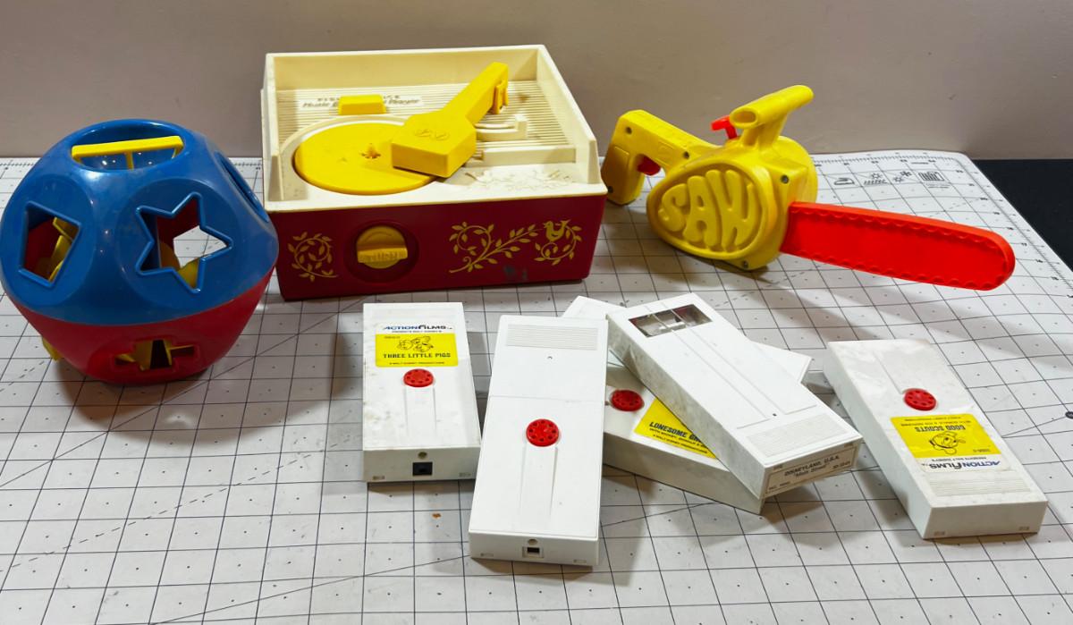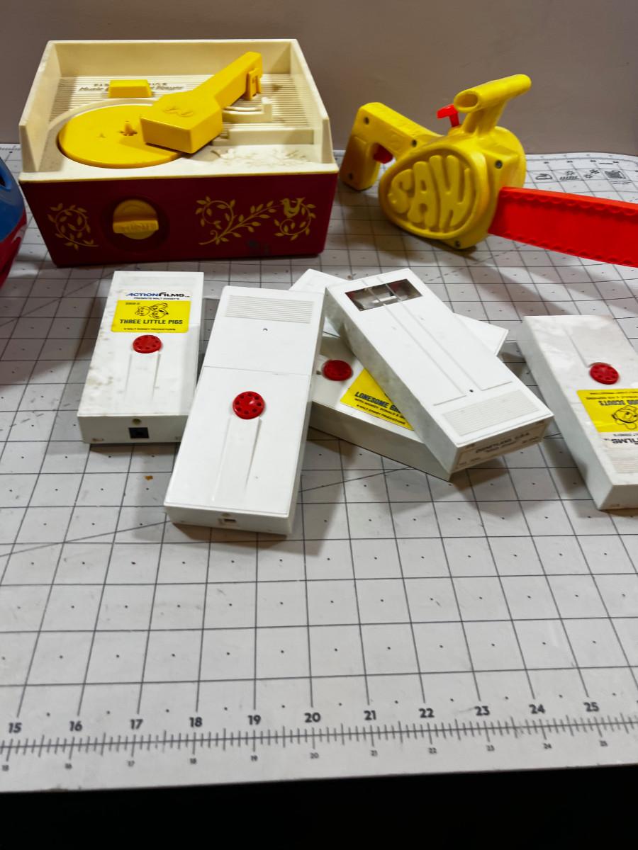 Mixed Lot Fisher Price Action Films and Record Player,  Chain Saw and a shape Ball