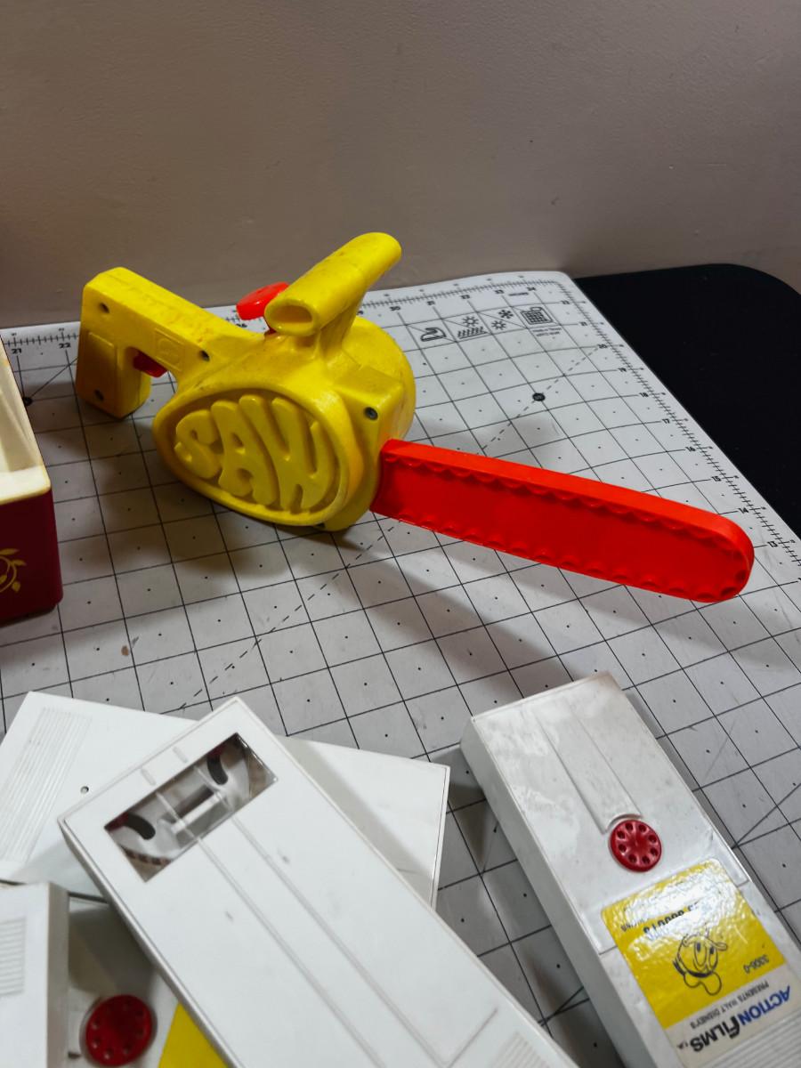 Mixed Lot Fisher Price Action Films and Record Player, Chain Saw and a shape Ball