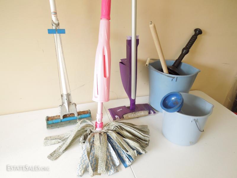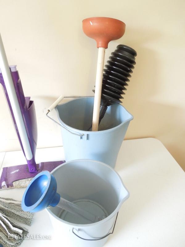 3 mops, 2 buckets, 3 toilet or drain plungers. 2 mops very dirty. Plungers and buckets are clean.