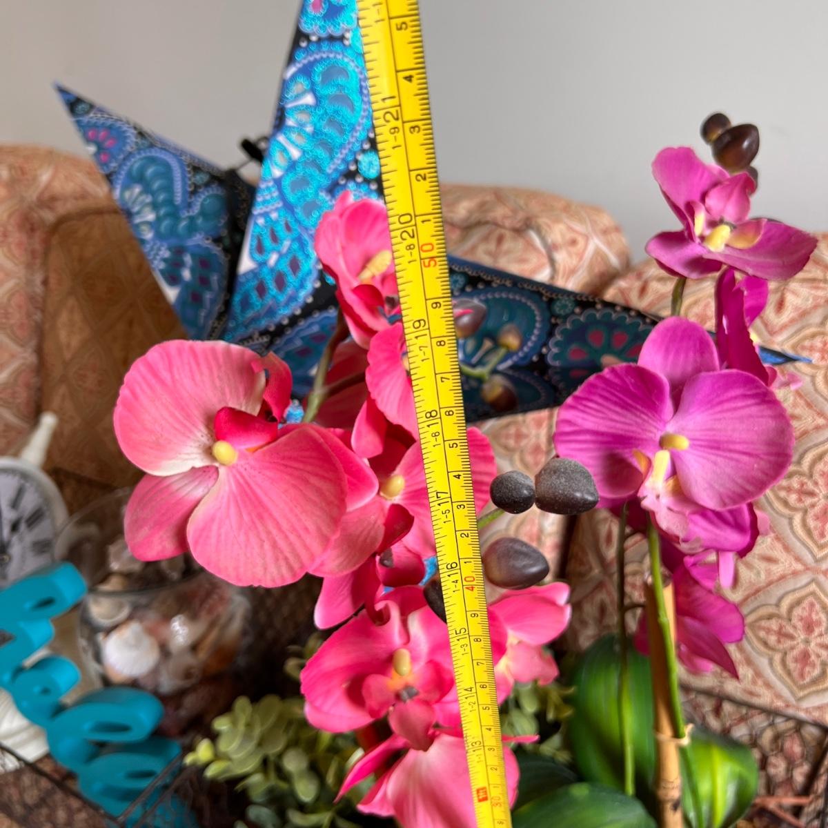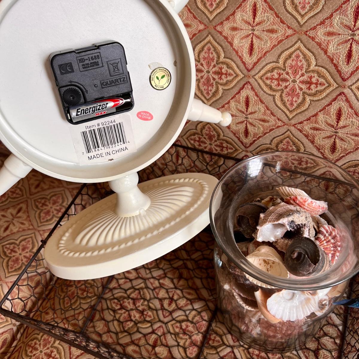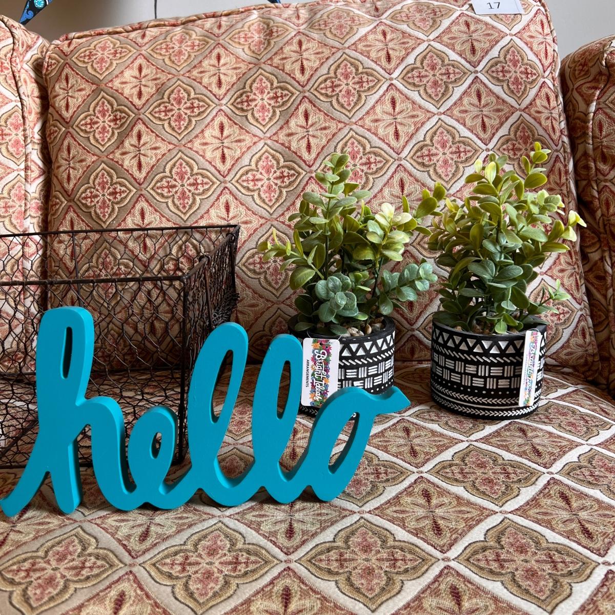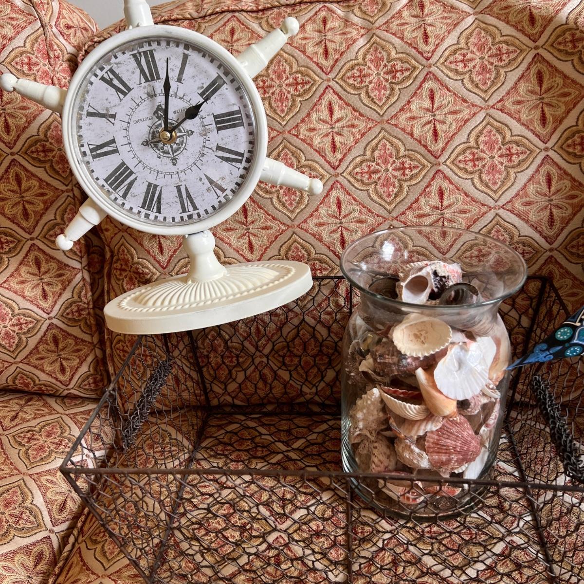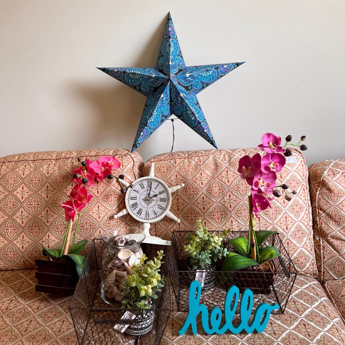 2 fake orchards, 2 fake potted plants, nautical themed vintage looking batter operated clock, 2 decorative wire baskets, wooden hello wall art, blue paper hanging star.