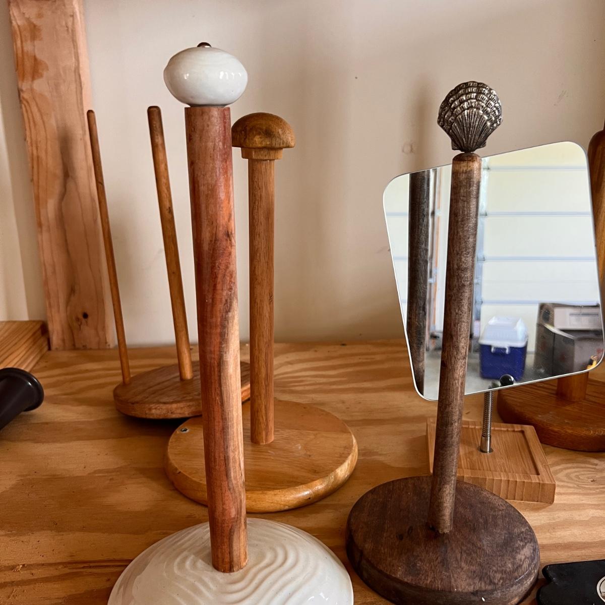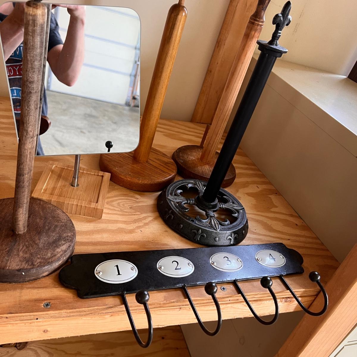 The valet is in good shapw. The stool has some paint marks on it. Lot of wooden and metal decorative paper towel holders, hooks, table mirror.