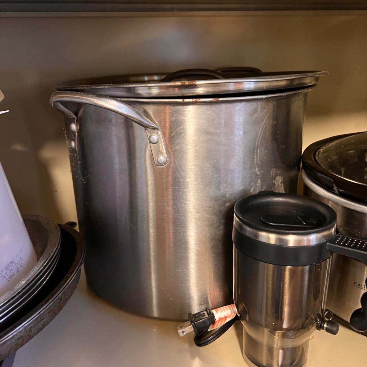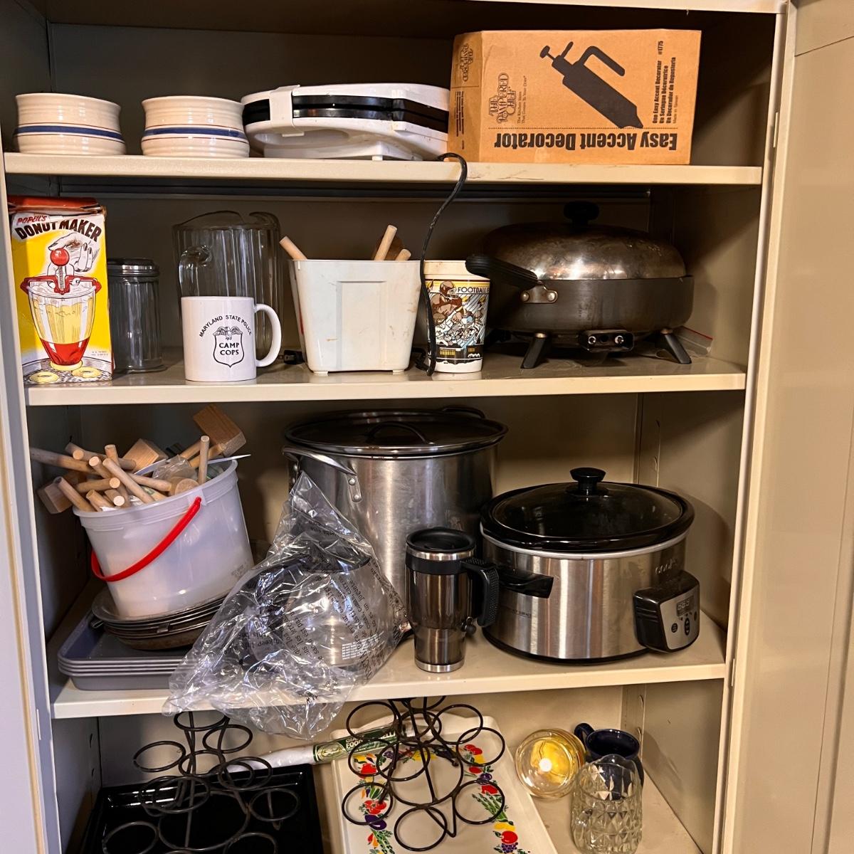 Large crab cooking pot, crockpot, crab utensils, decorative trays, etc. Appliances are untested.