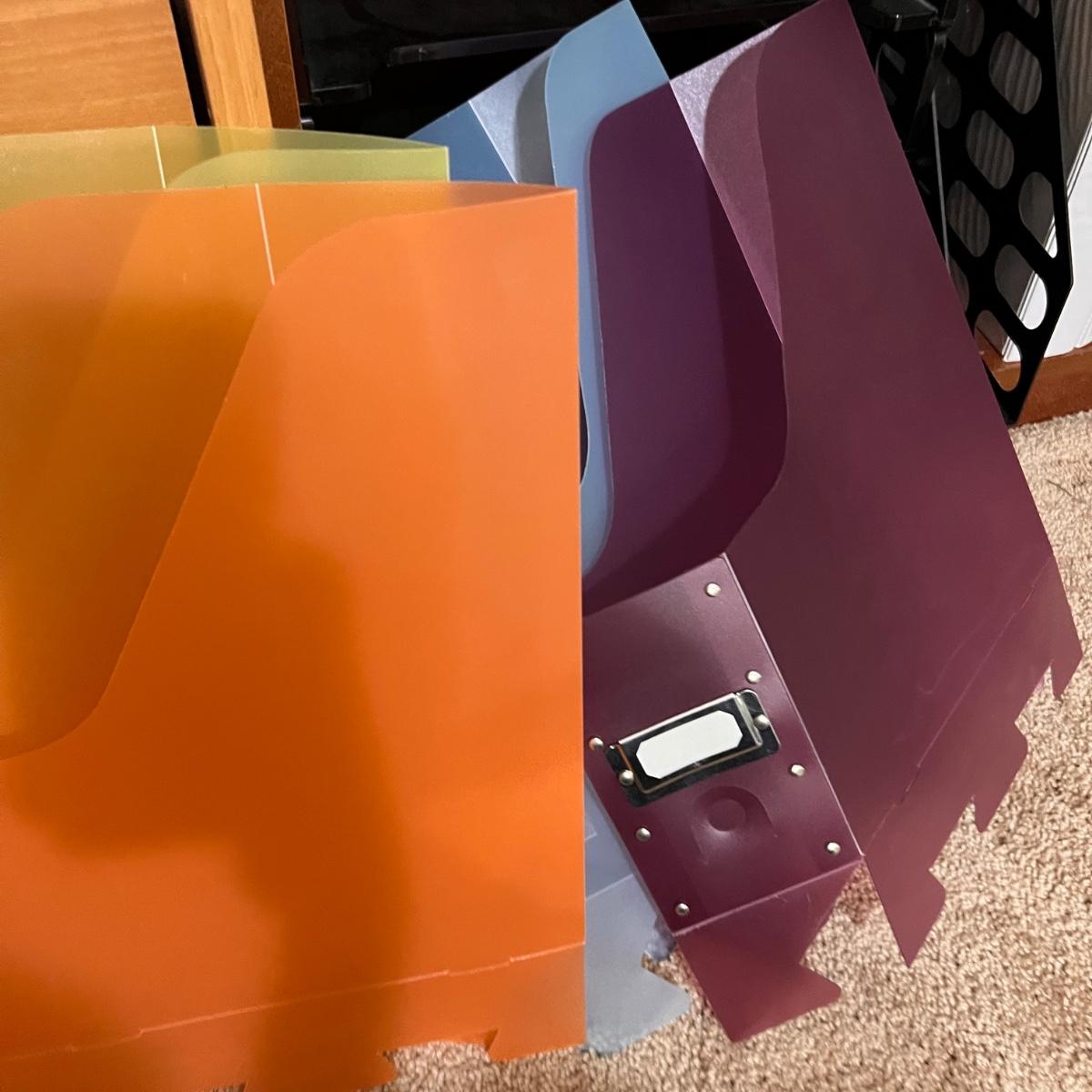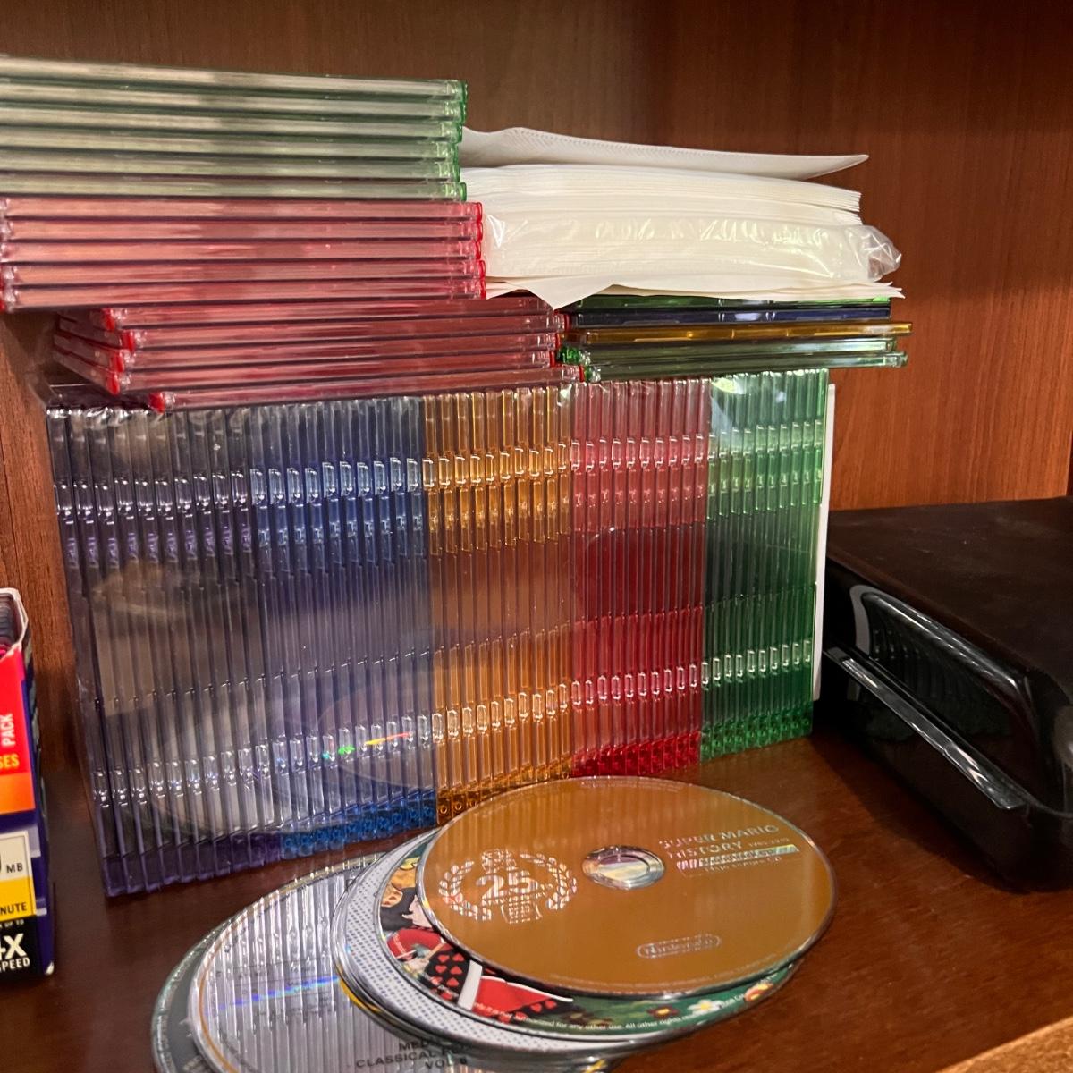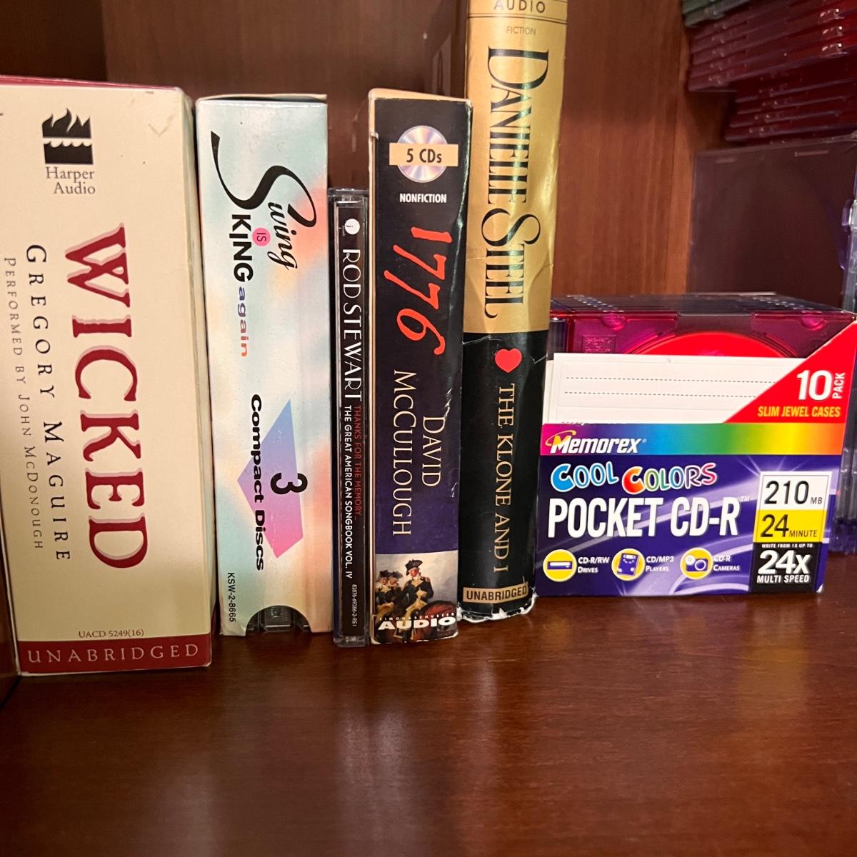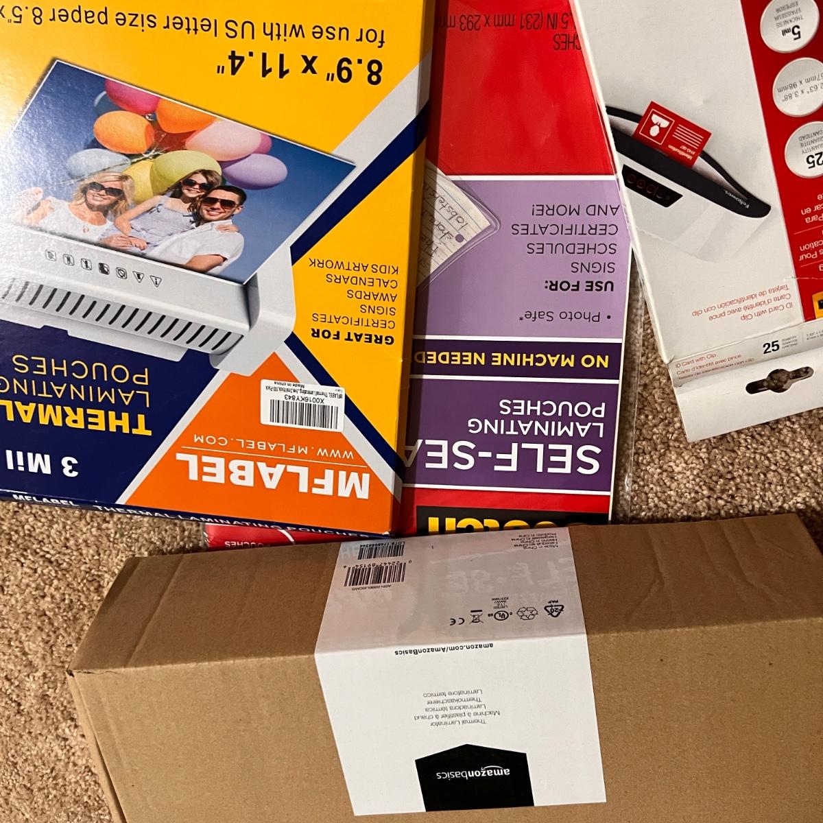 Memorex cool colors pocket cd-r opened package, amazon thermal laminating machine with pouches/sheets, foldable storage holder, desktop trays, binders, cd and cassette audio books, etc.