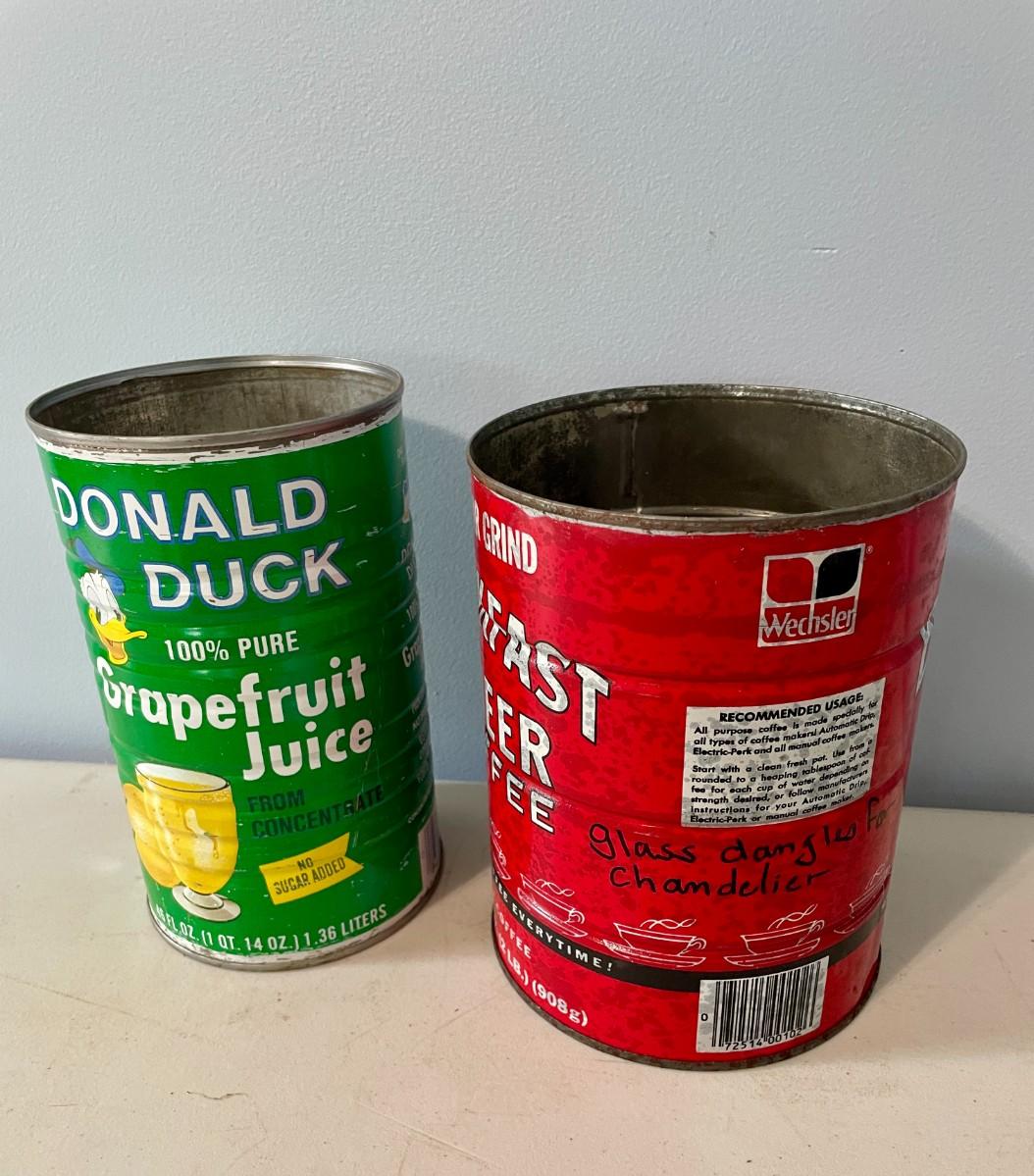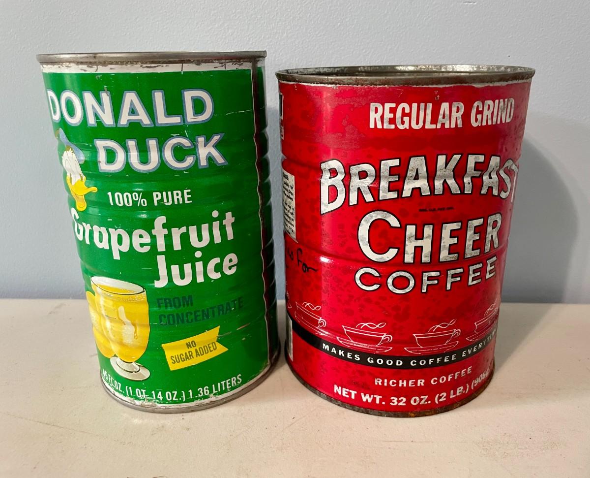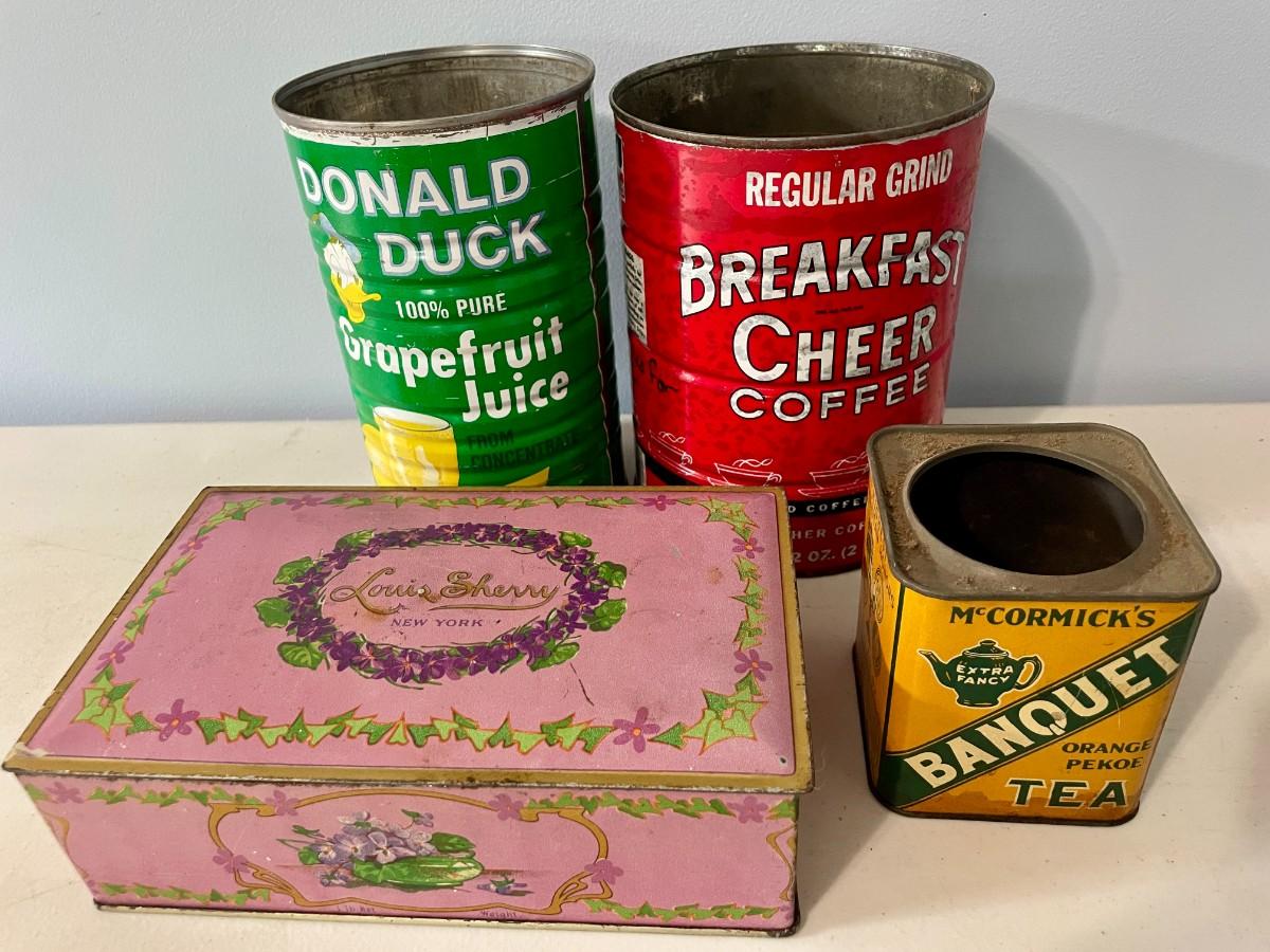 Includes juice, coffee, tea and candy tins.