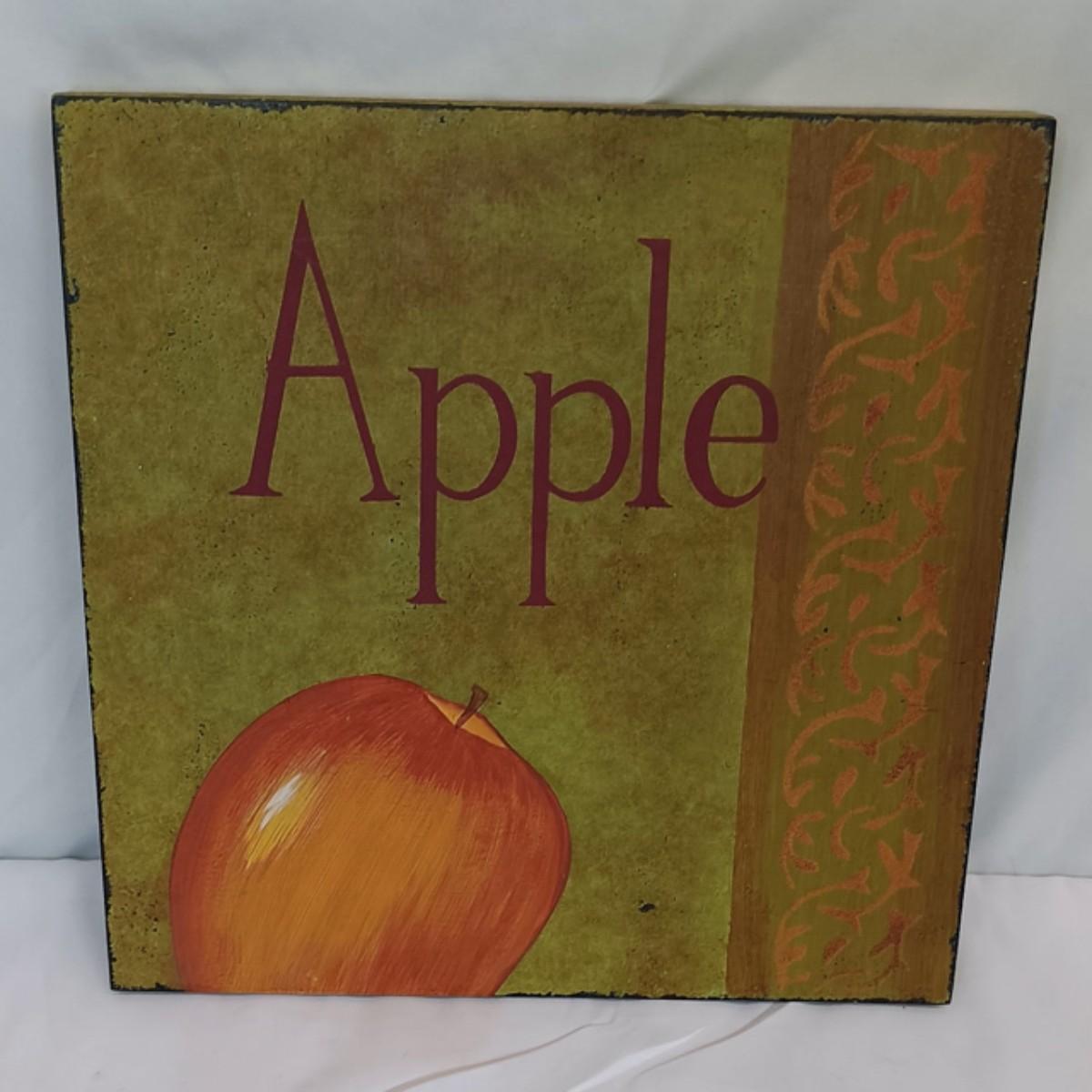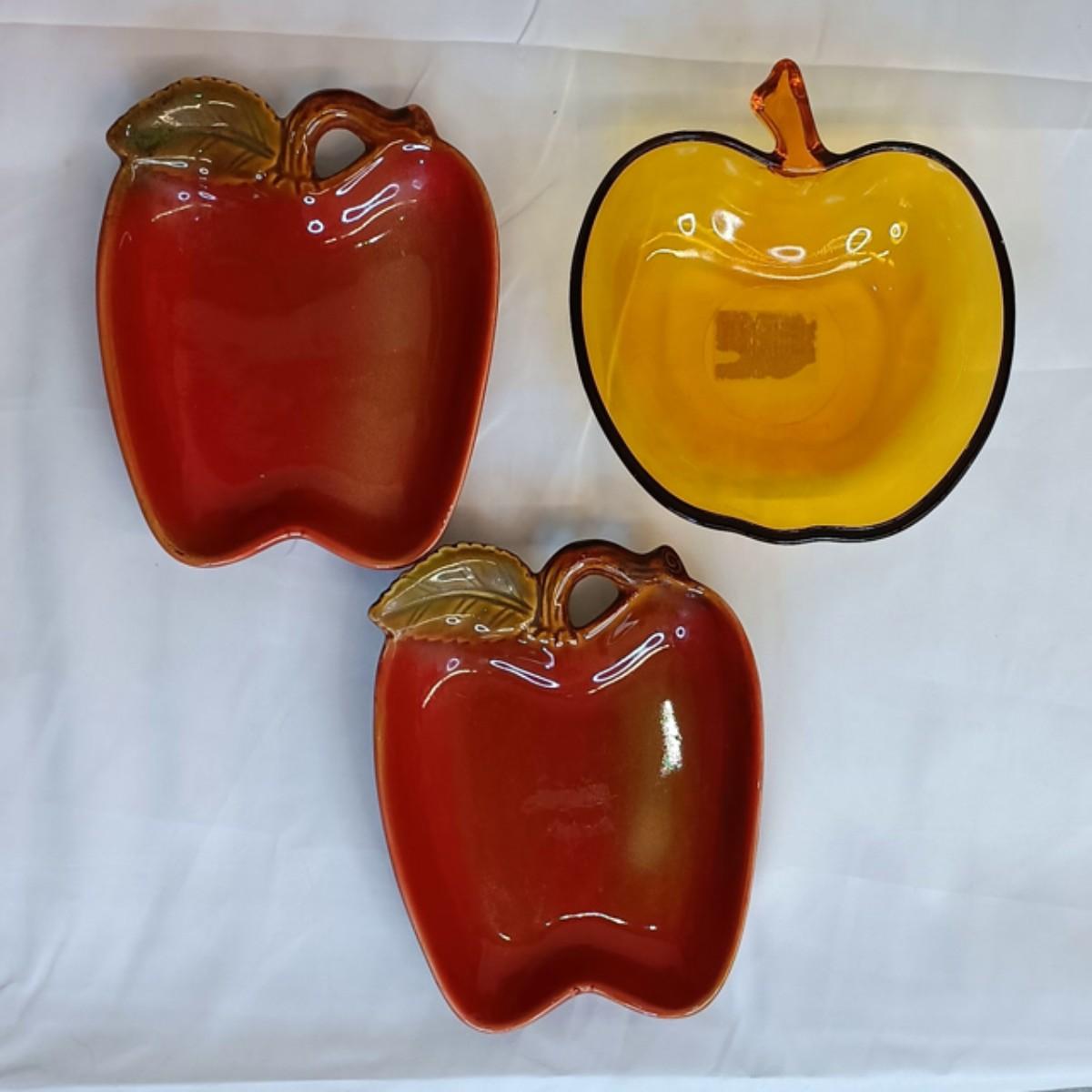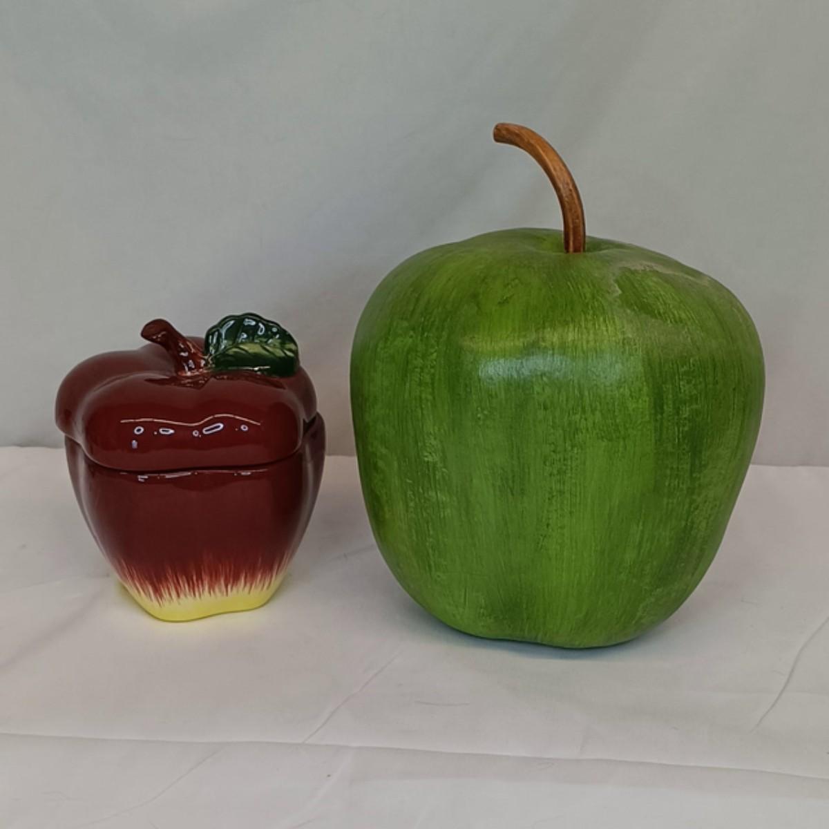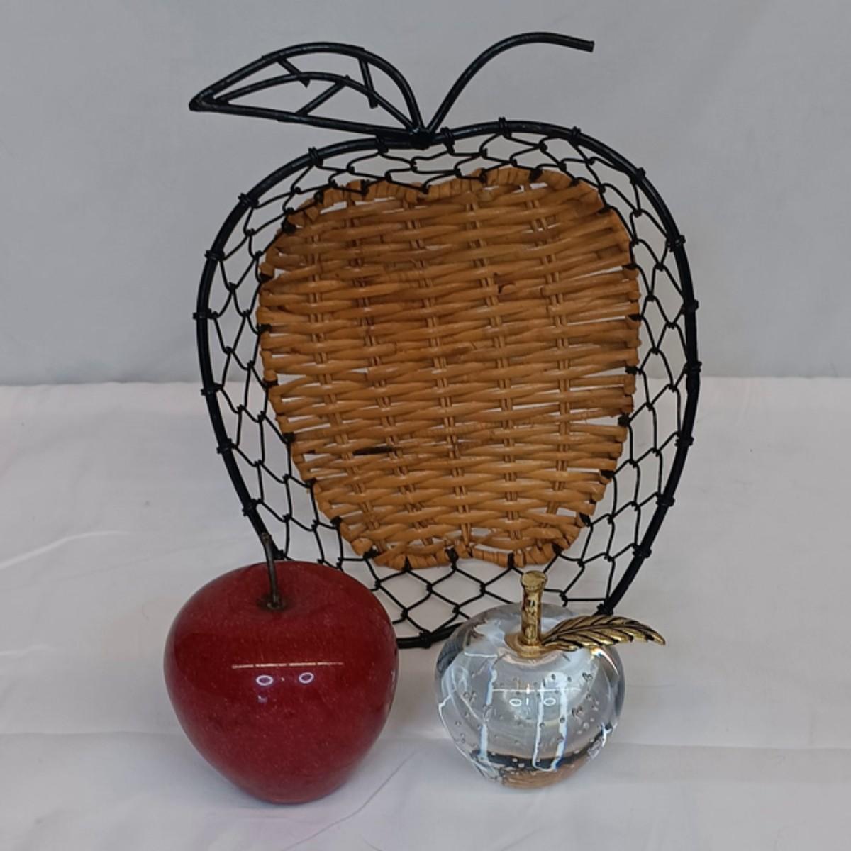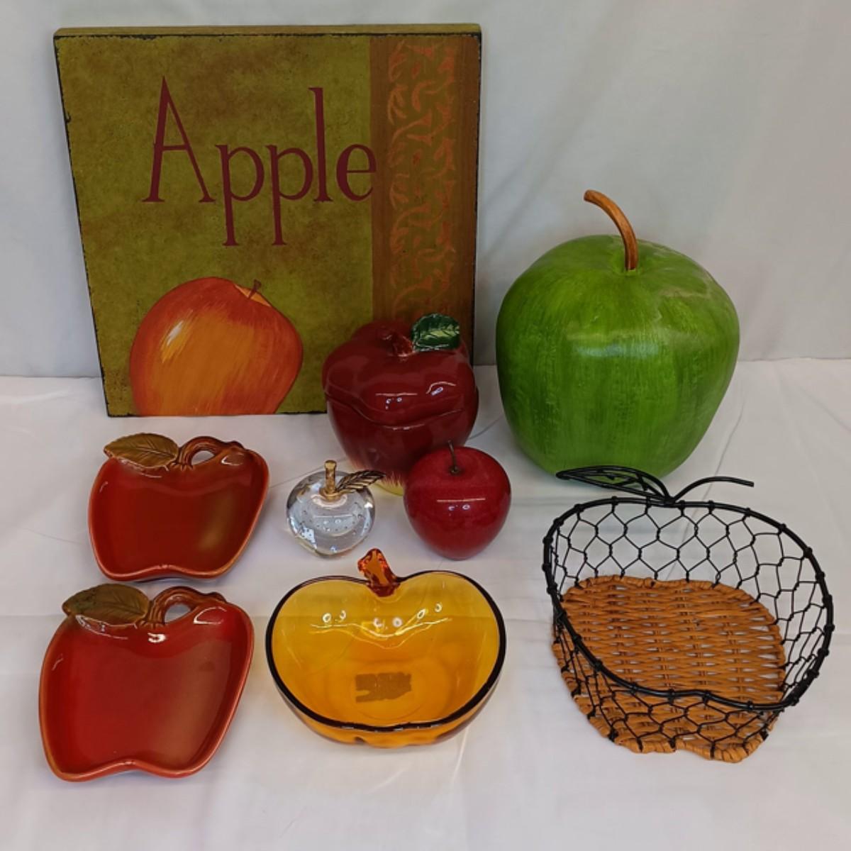 This mix lot of apple home decor includes two glass apple paperweights, an apple basket, an amber glass apple dish, a ceramic apple canister among other items as pictured.