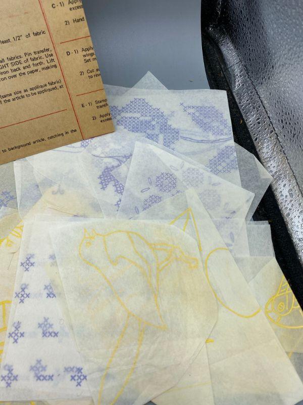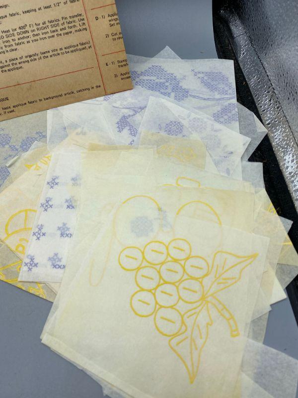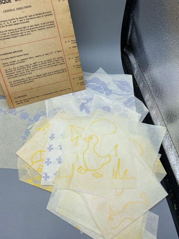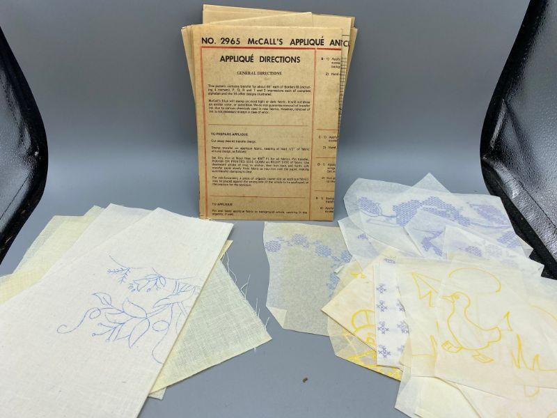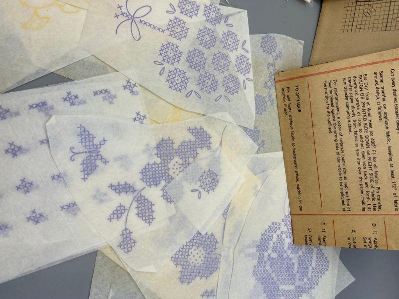 Mixed lot of appliques and transfer patterns. Vintage designs, great for tea towels and pillow cases. They were all together in one envelope.