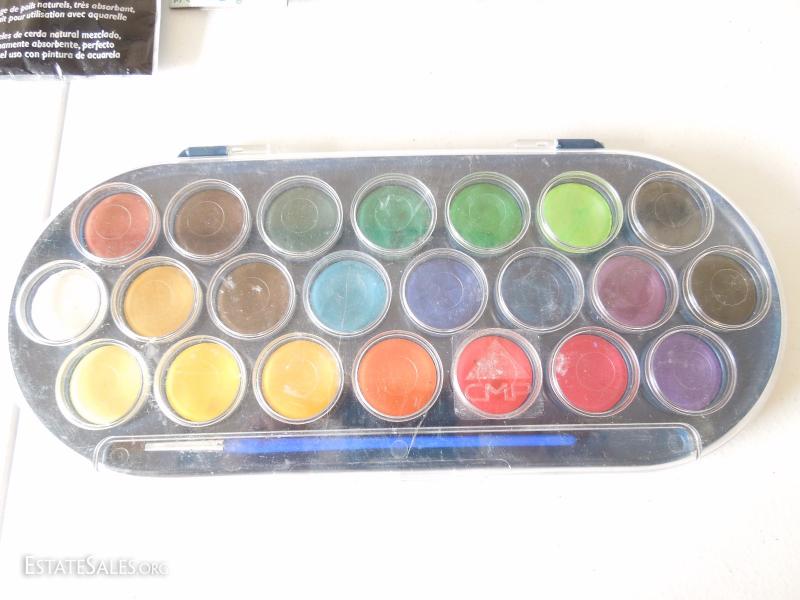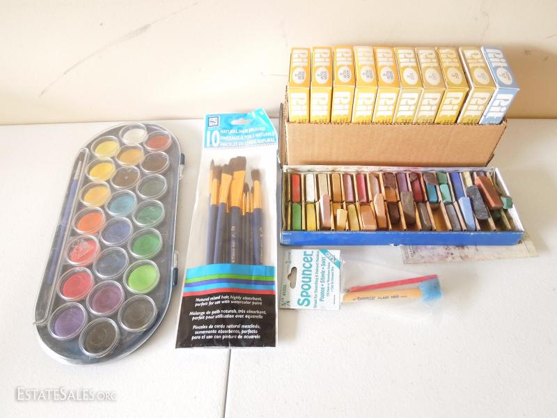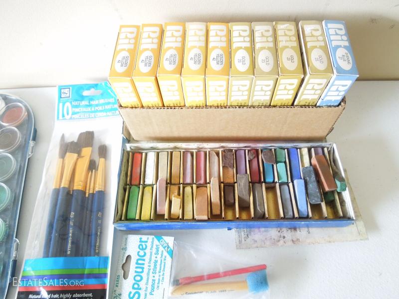 Water colors, brushes, pastel chalk, unused boxes of Rit dye