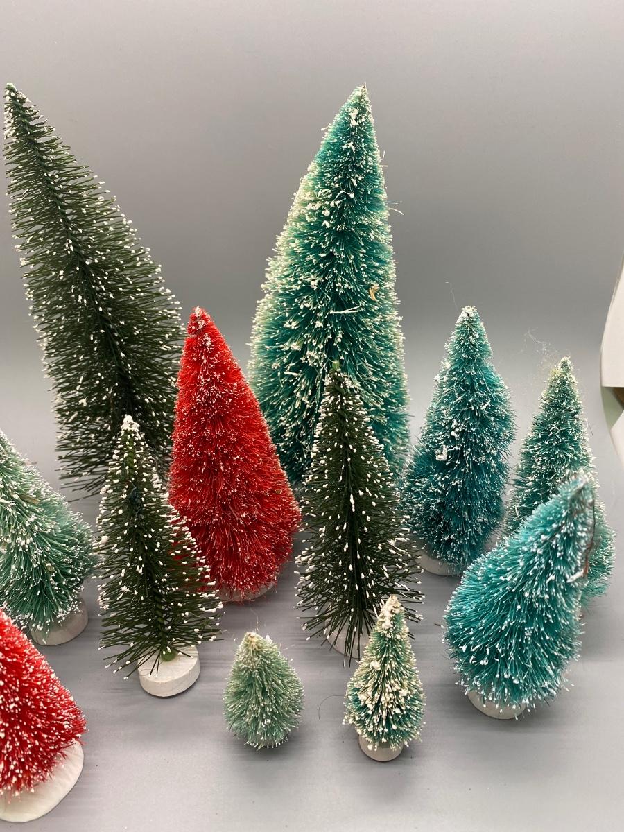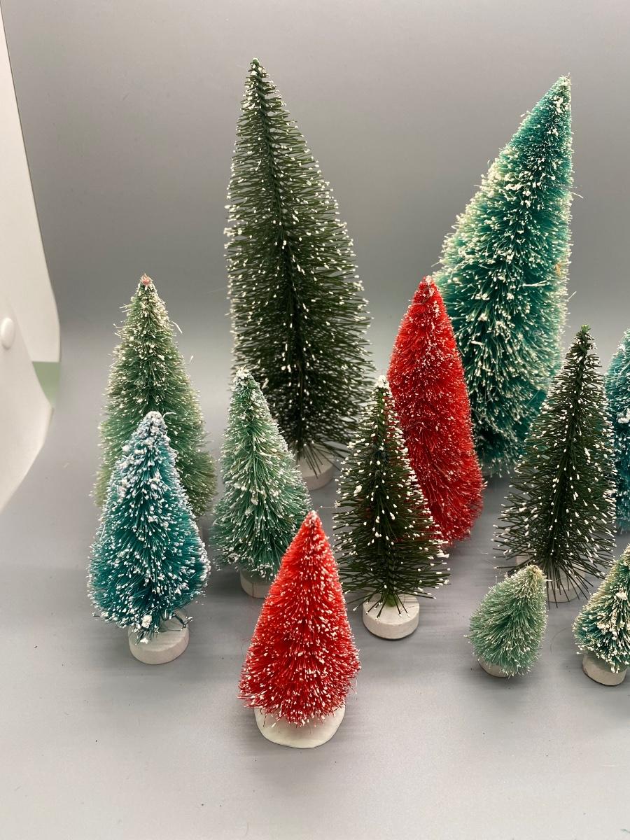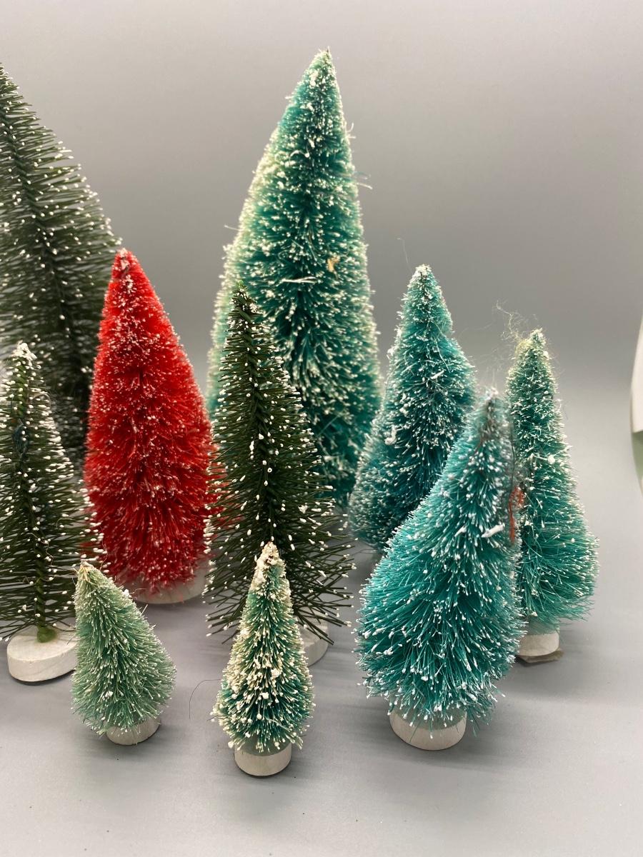 Mixed lot of bottle brush Christmas trees. Various sizes, colors, and bristles. All in good condition. Great for holiday decor and crafts.