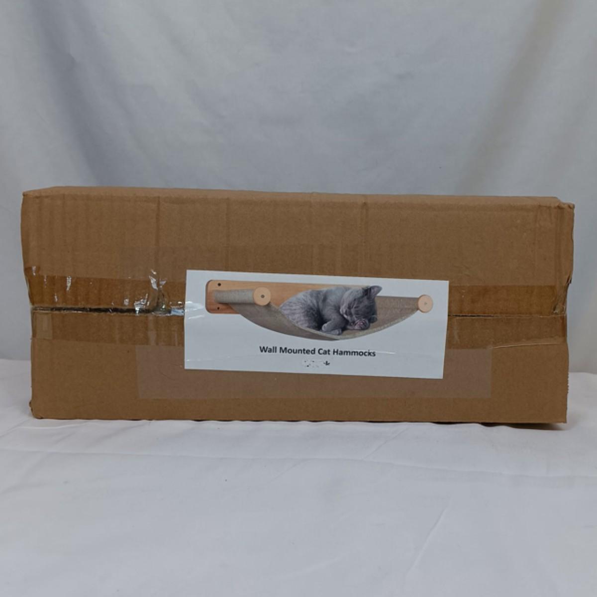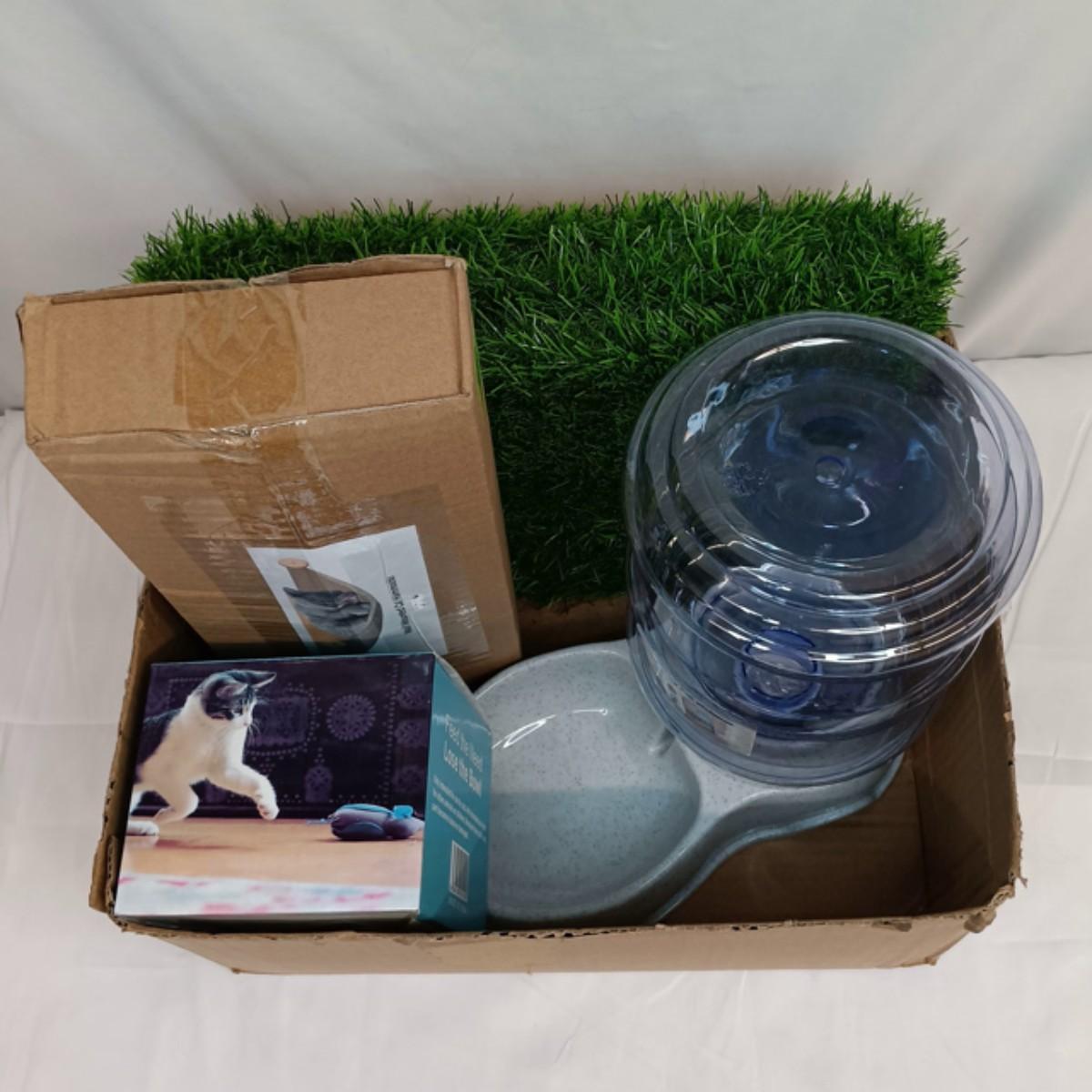 This lot includes a new in box mouse puzzle feeding toy, new in box wall mounted cat hammock, new self dispensing gravity pet waterer and an artificial grass cat scratching pad.