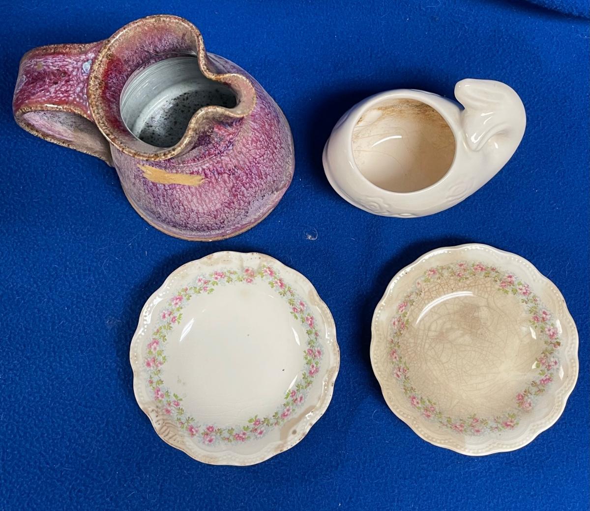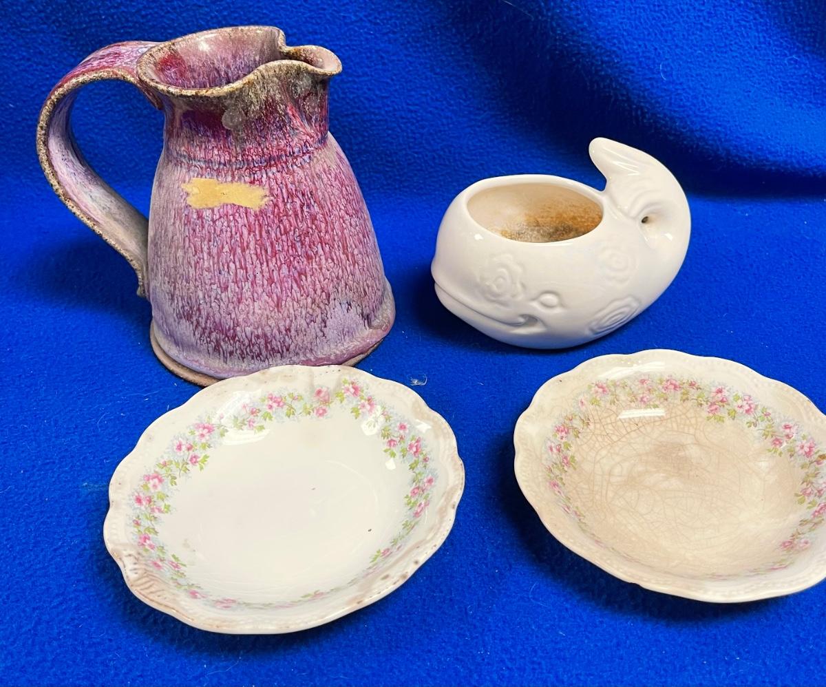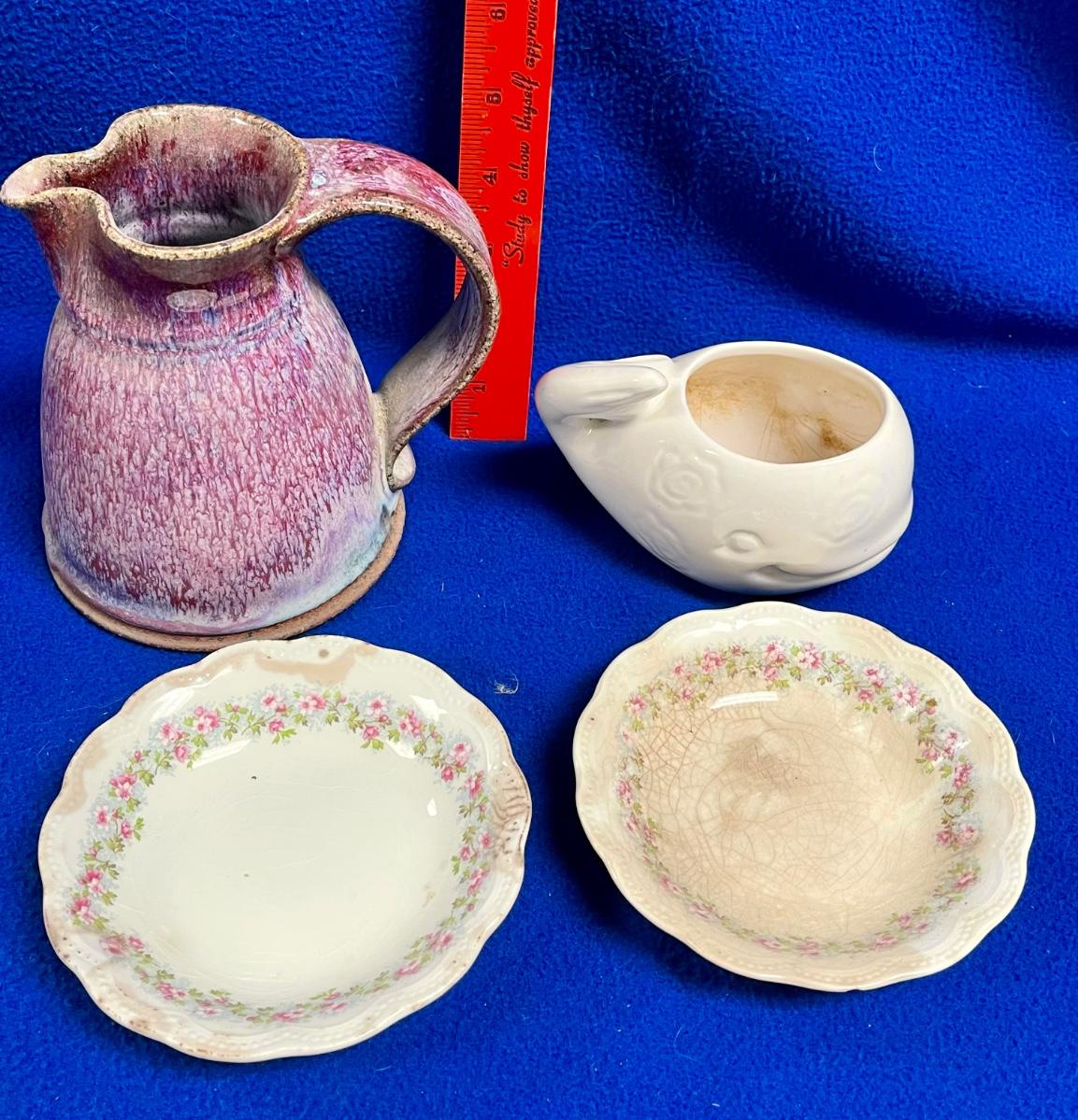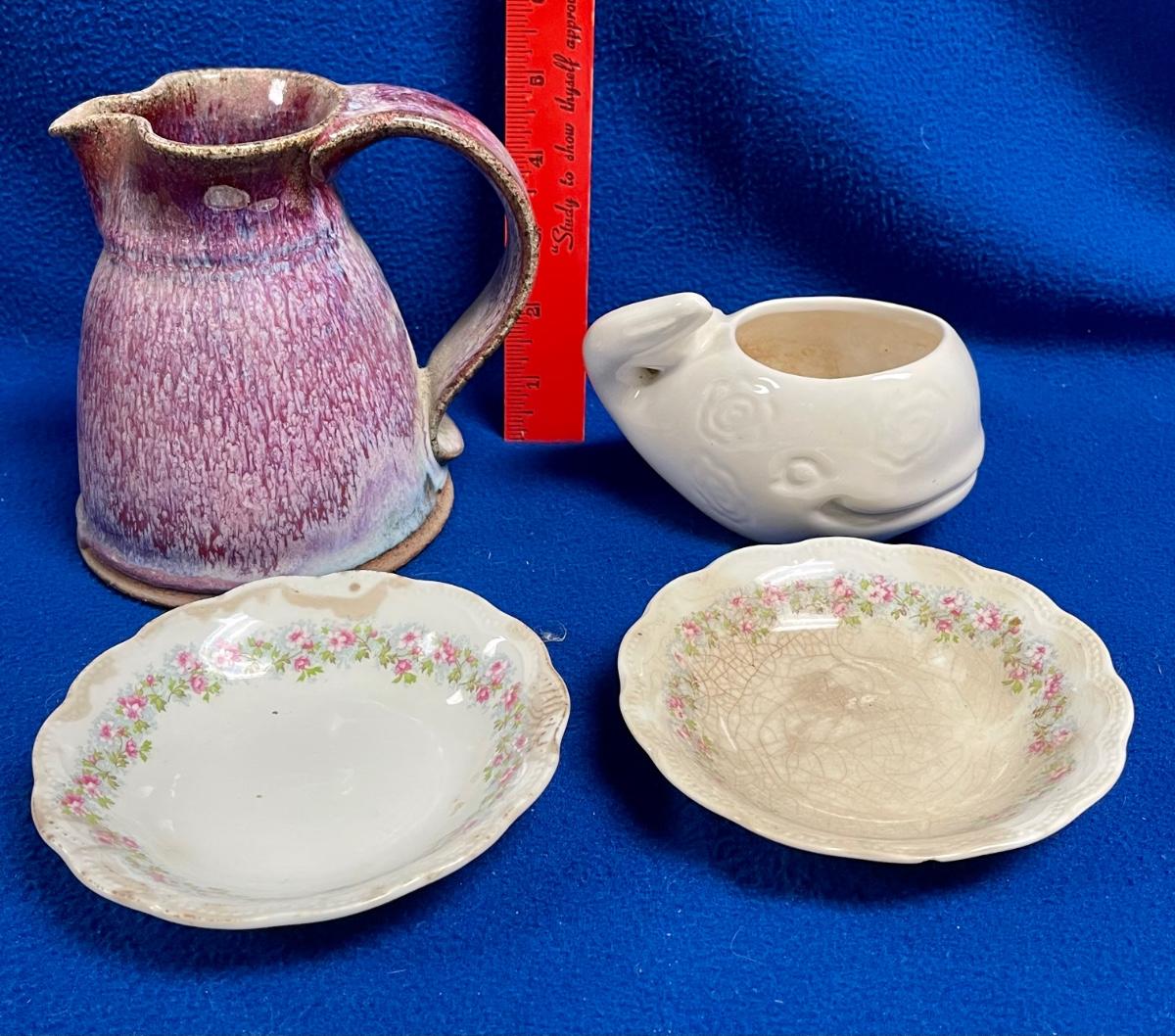 4-piece lot of different vintage ceramics. Thrown pottery pitcher, a small white whale planter, and two shallow saucer like plates. Saucers have signs of age. Pitcher is in good condition, there is a paper/tape piece stuck to it that needs a little elbow grease to get off probably. Whale is in vintage condition as well.