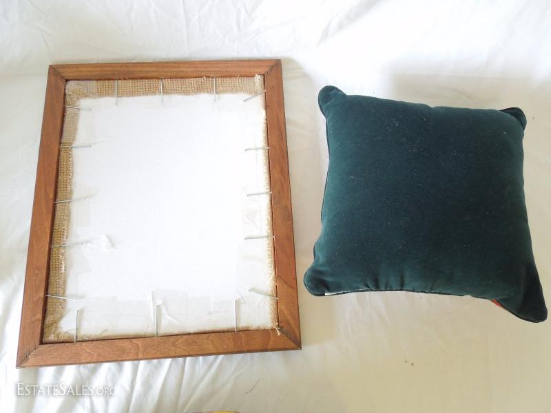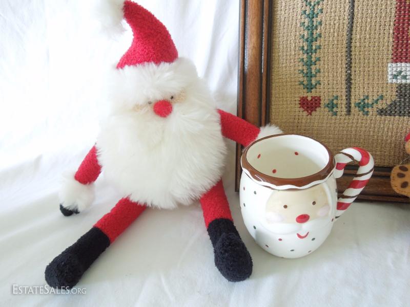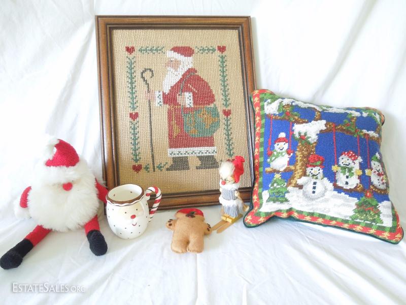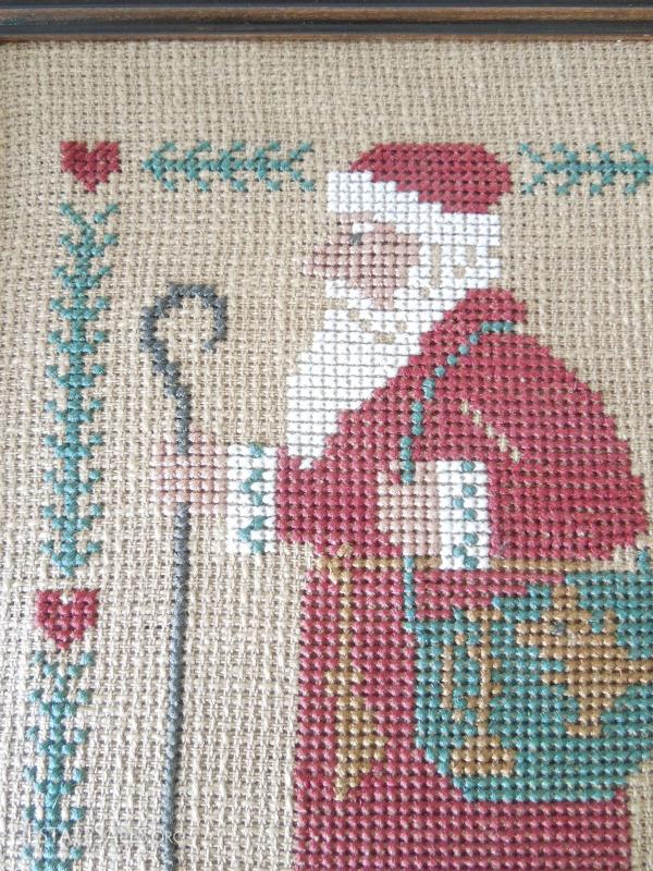 Awesome cross stitched framed Father Christmas. Embroidered pillow, Norwegian christmas ornament, ceramic cocoa mug, fabric santa, felt bear