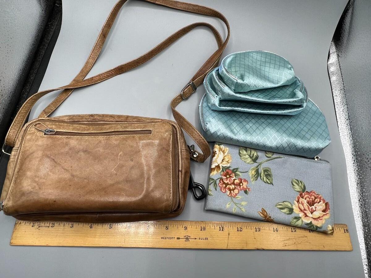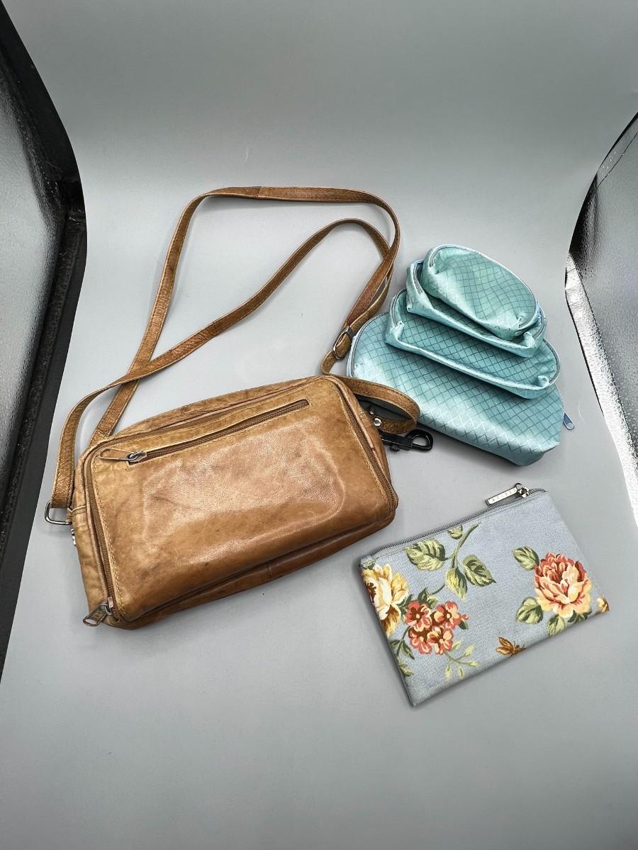 Mixed lot of bags. Zipper cosmetic bags and a crossbody purse. All in good condition.
