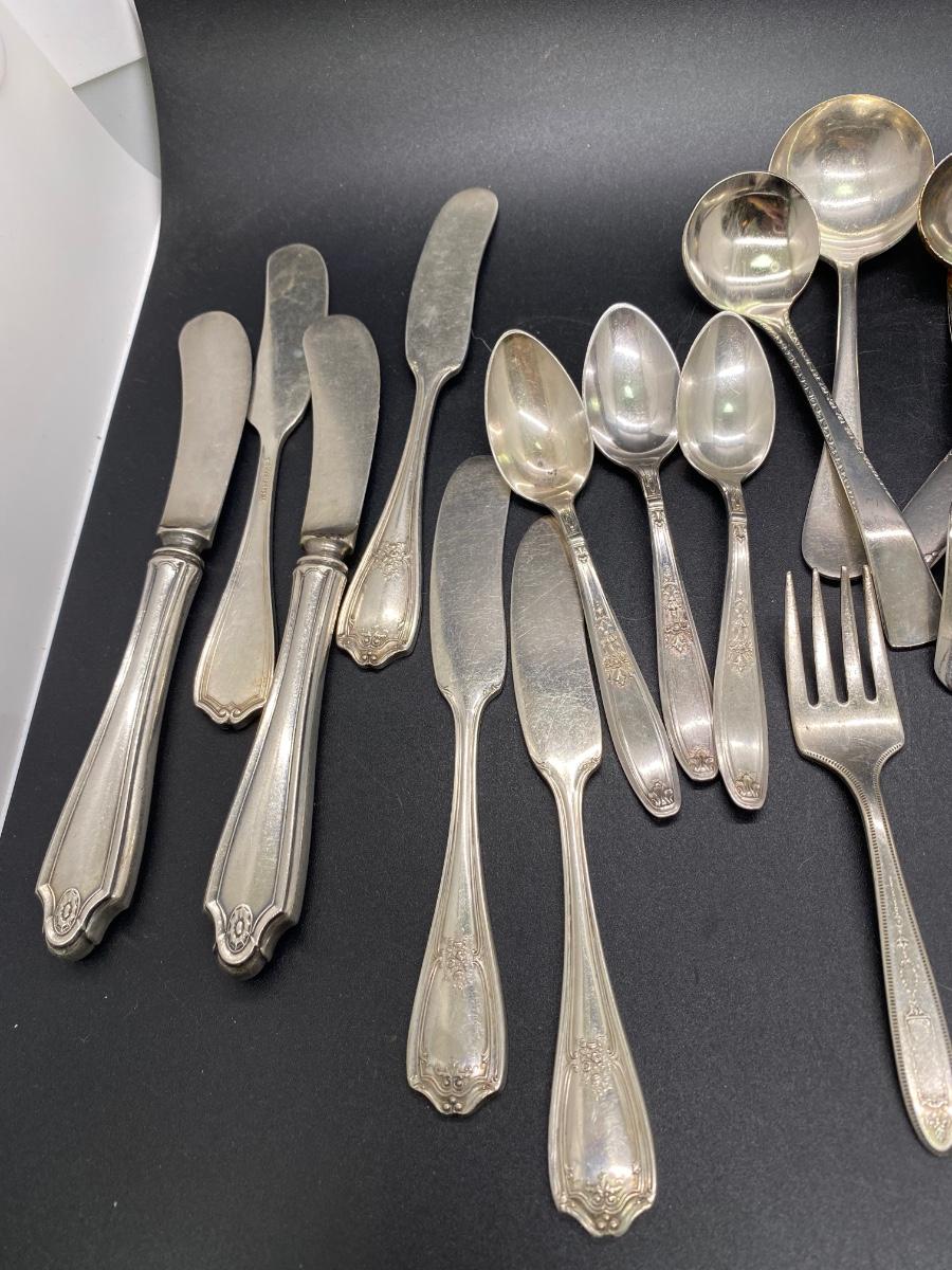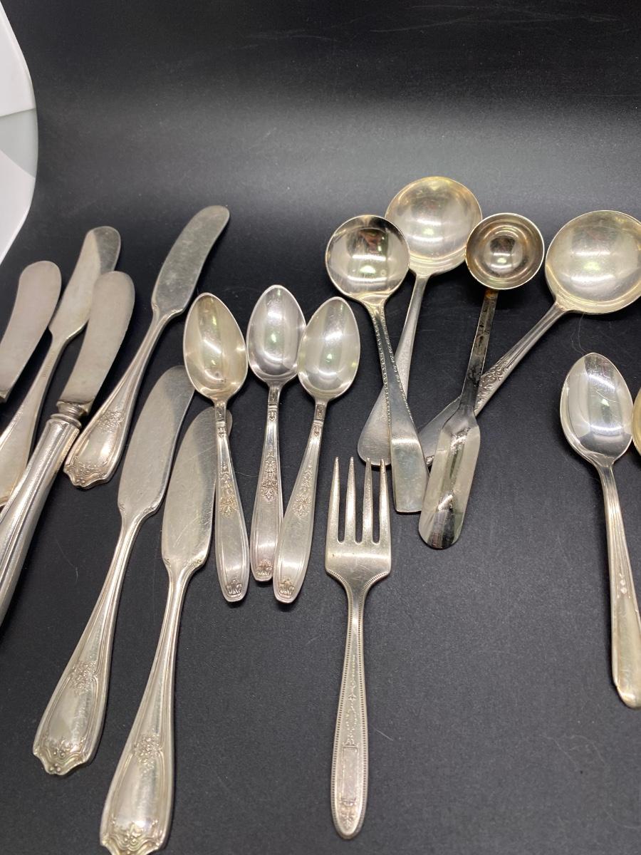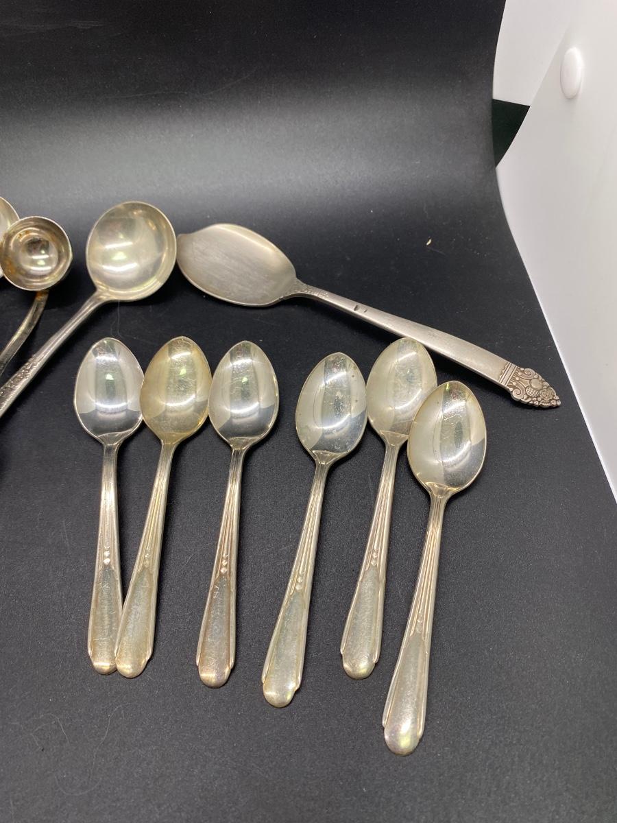 Mixed lot of silver plate flatware. Demitasse spoons, sugar spoons, butter knives, and other small utensils. Pieces are either silver plate or stainless, no sterling in the lot. Good previously used condition.