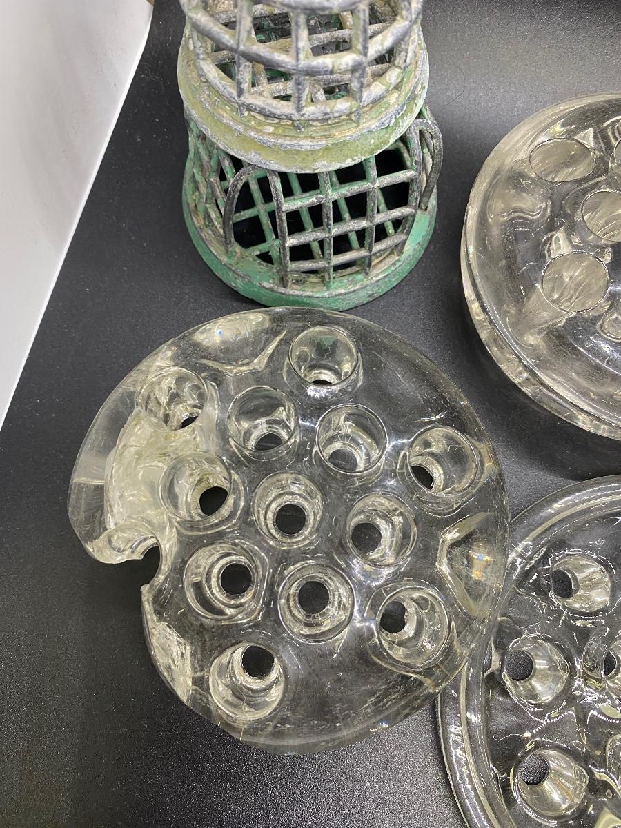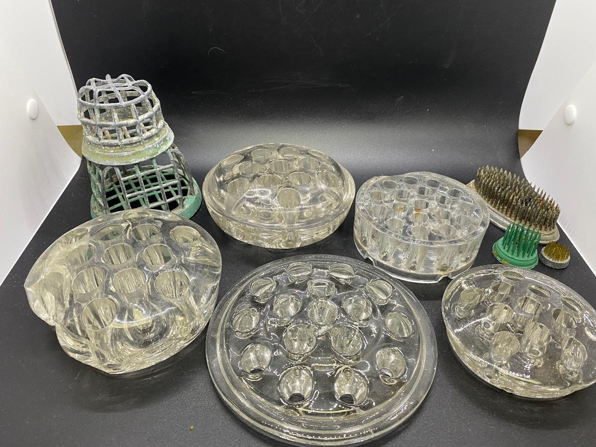 Mixed lot of floral frogs. Different size clear glass holders, two different size metal cage styles, and three metal pin frogs. One of the glass frogs does have a piece chipped off the edge but in useable condition.