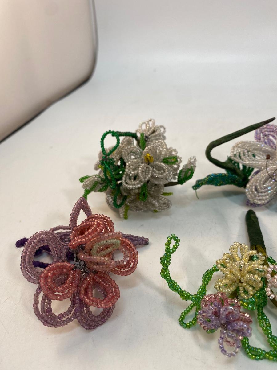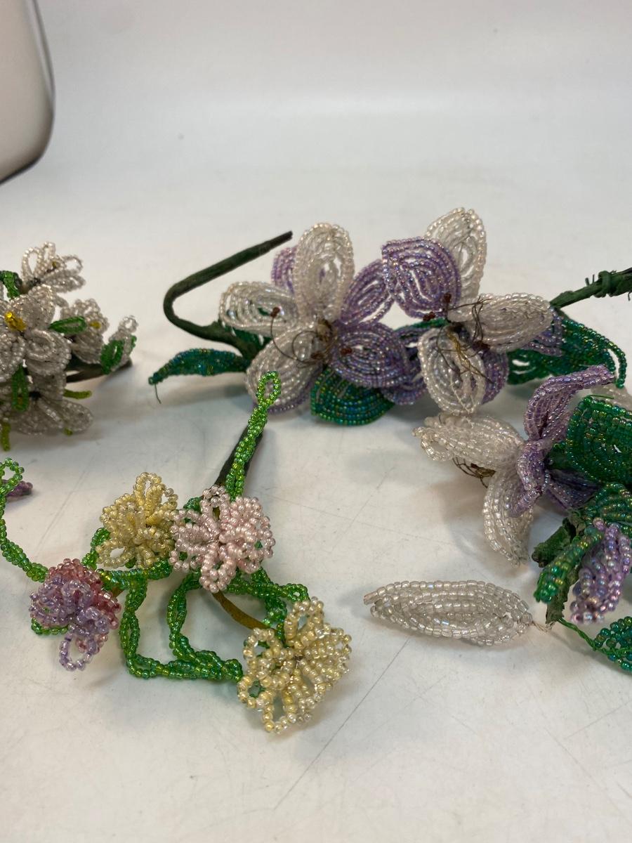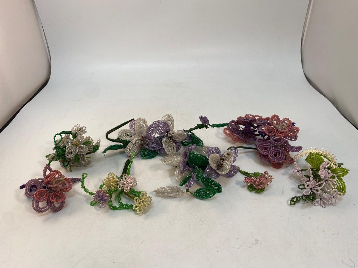 Mixed Lot of Glass Seed Bead Flowers. Made with wire and beads. Dusty from display, could probably clean with soapy water and toothbrush. See photos for different styles included.