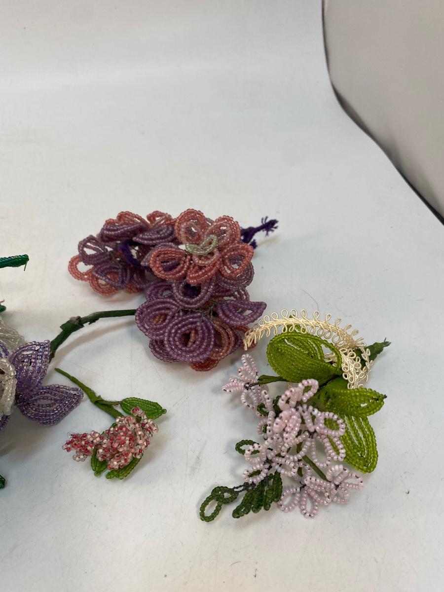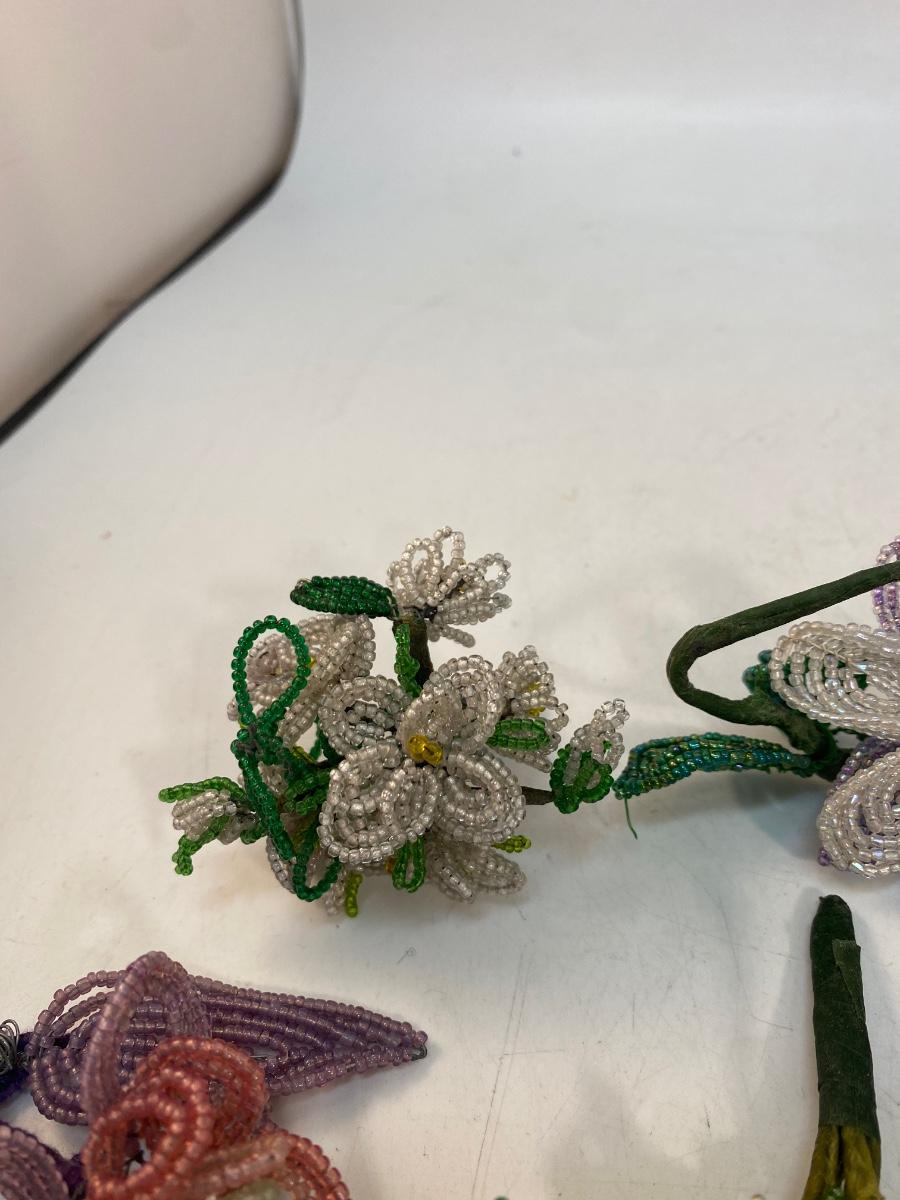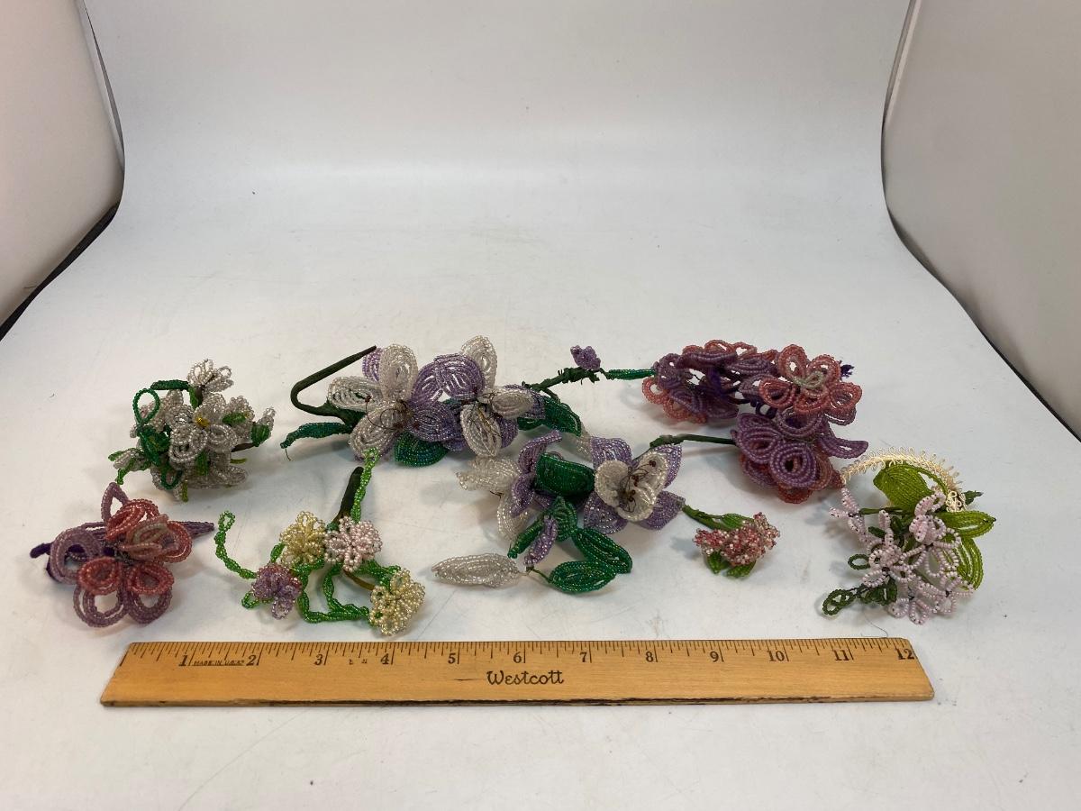 Mixed Lot of Glass Seed Bead Flowers. Made with wire and beads. Dusty from display, could probably clean with soapy water and toothbrush. See photos for different styles included.
