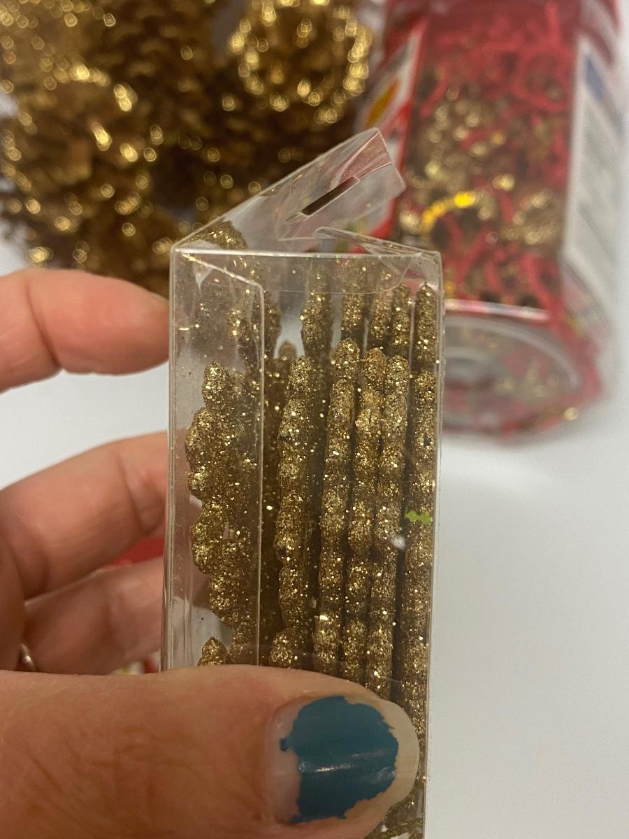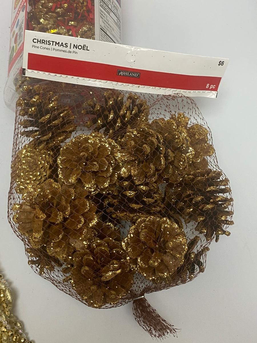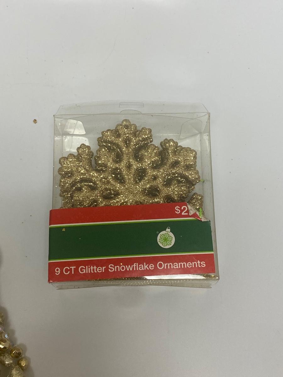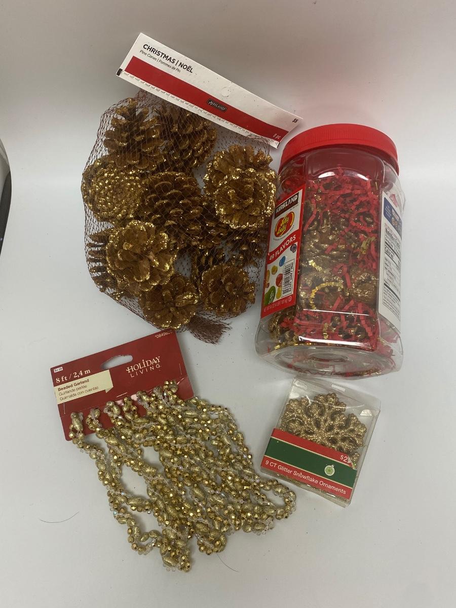 Mixed lot of glittery gold Christmas tree ornaments. Beaded garland, snowflakes, and gold painted pinecones. Good condition. Great for holiday crafting also.