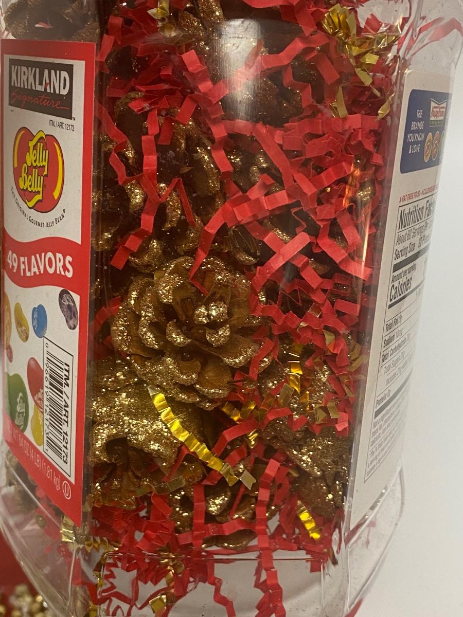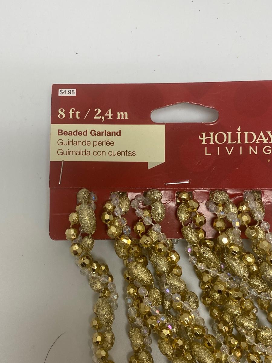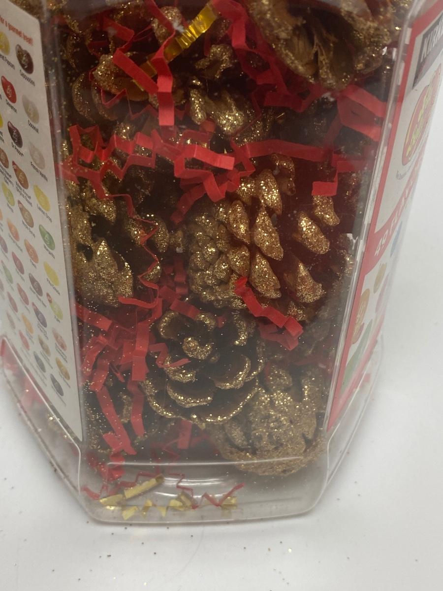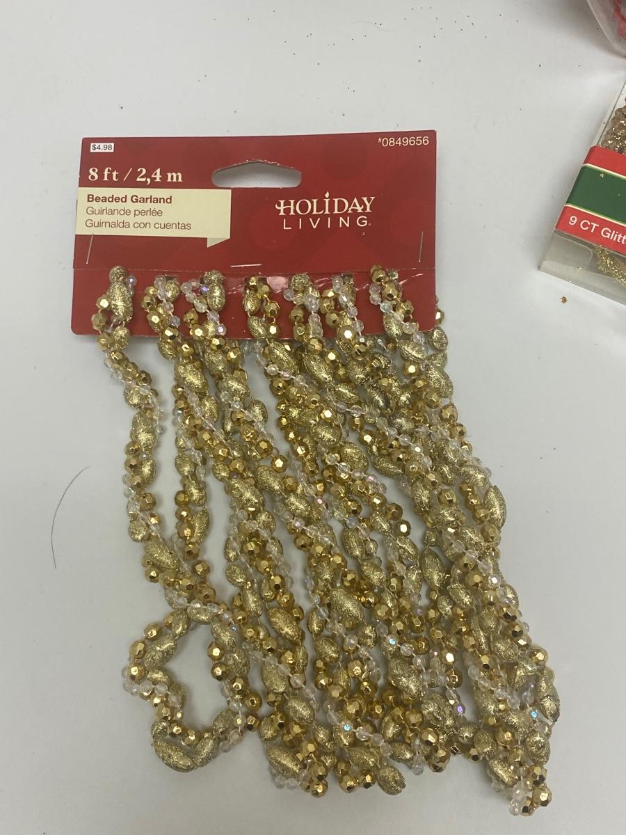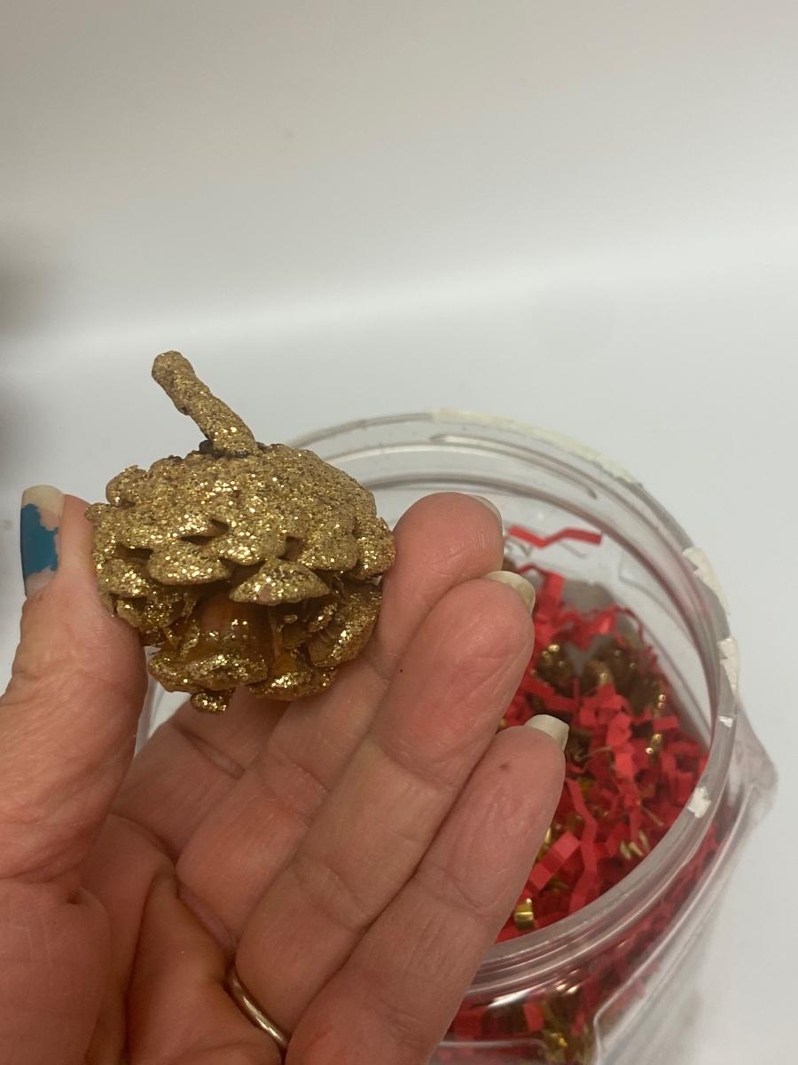 Mixed lot of glittery gold Christmas tree ornaments. Beaded garland, snowflakes, and gold painted pinecones. Good condition. Great for holiday crafting also.