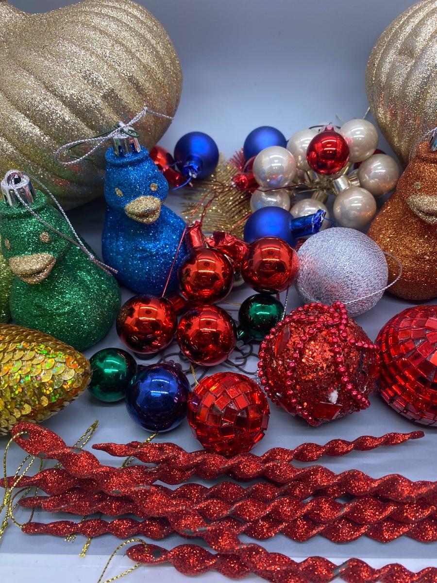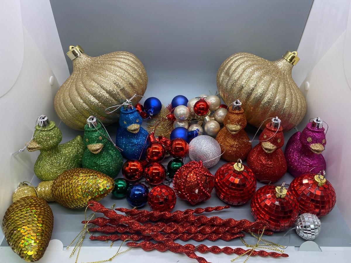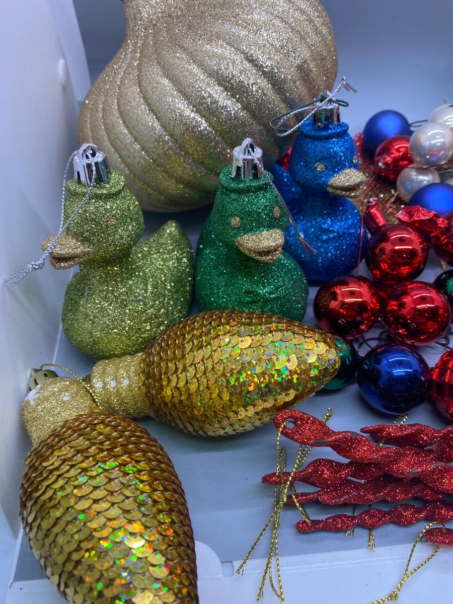 Mixed lot of Christmas ornaments. Plastic ornaments covered in glitter, sequins, mirrored, or shiny. Different shapes and sizes including some like rubber duckies.