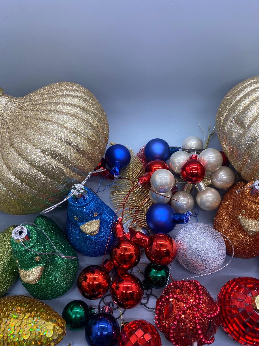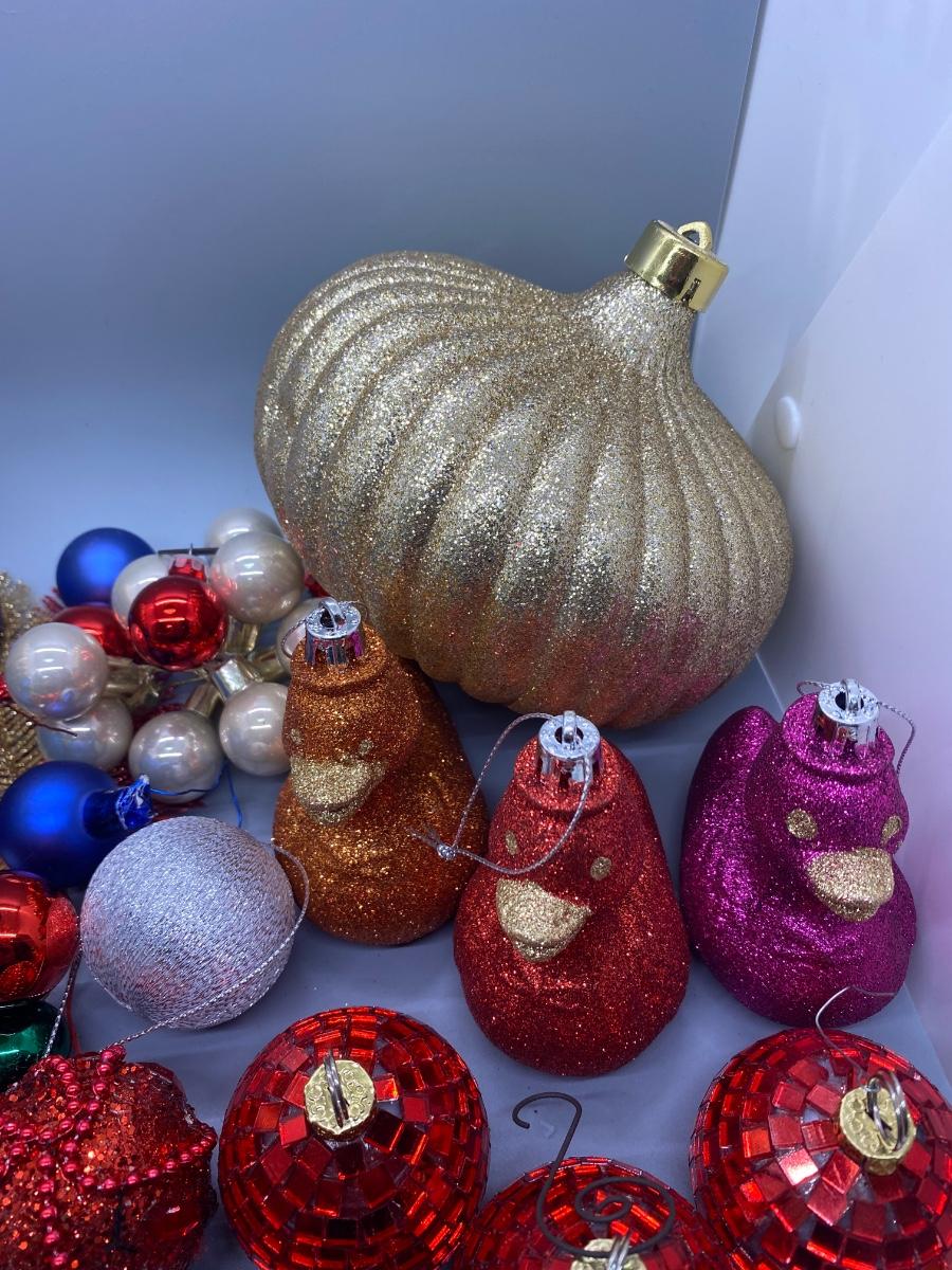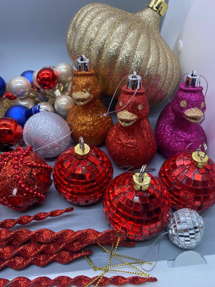 Mixed lot of Christmas ornaments. Plastic ornaments covered in glitter, sequins, mirrored, or shiny. Different shapes and sizes including some like rubber duckies.