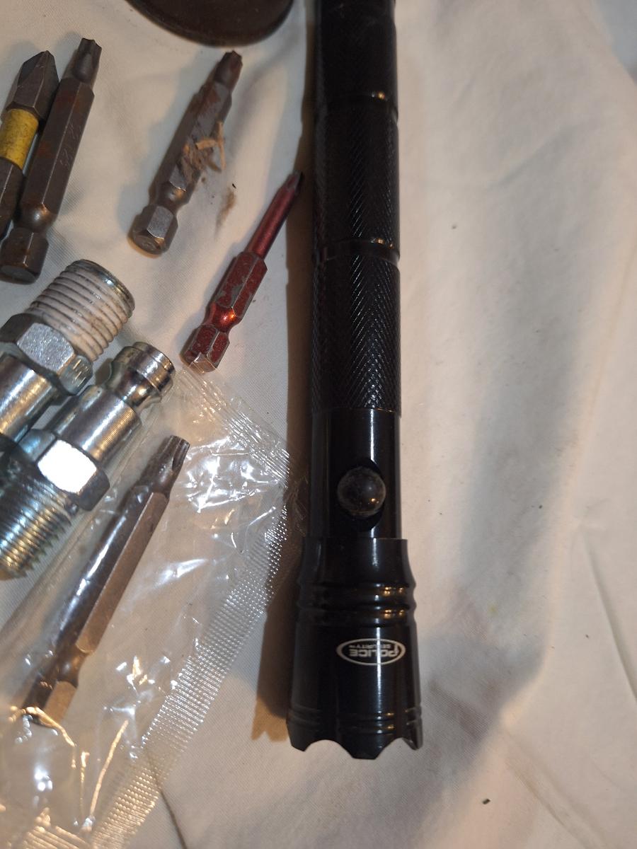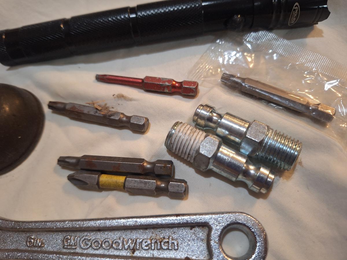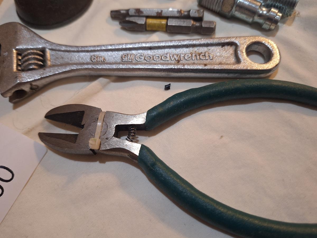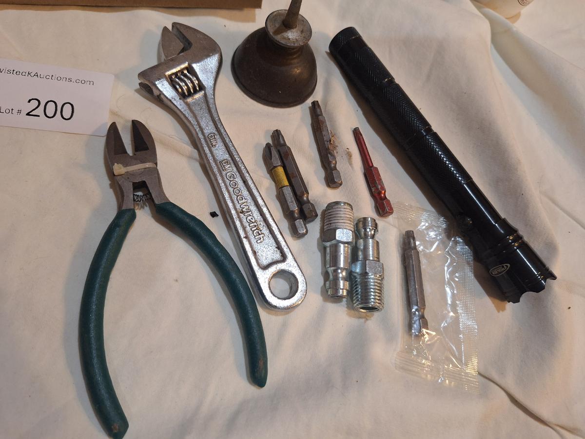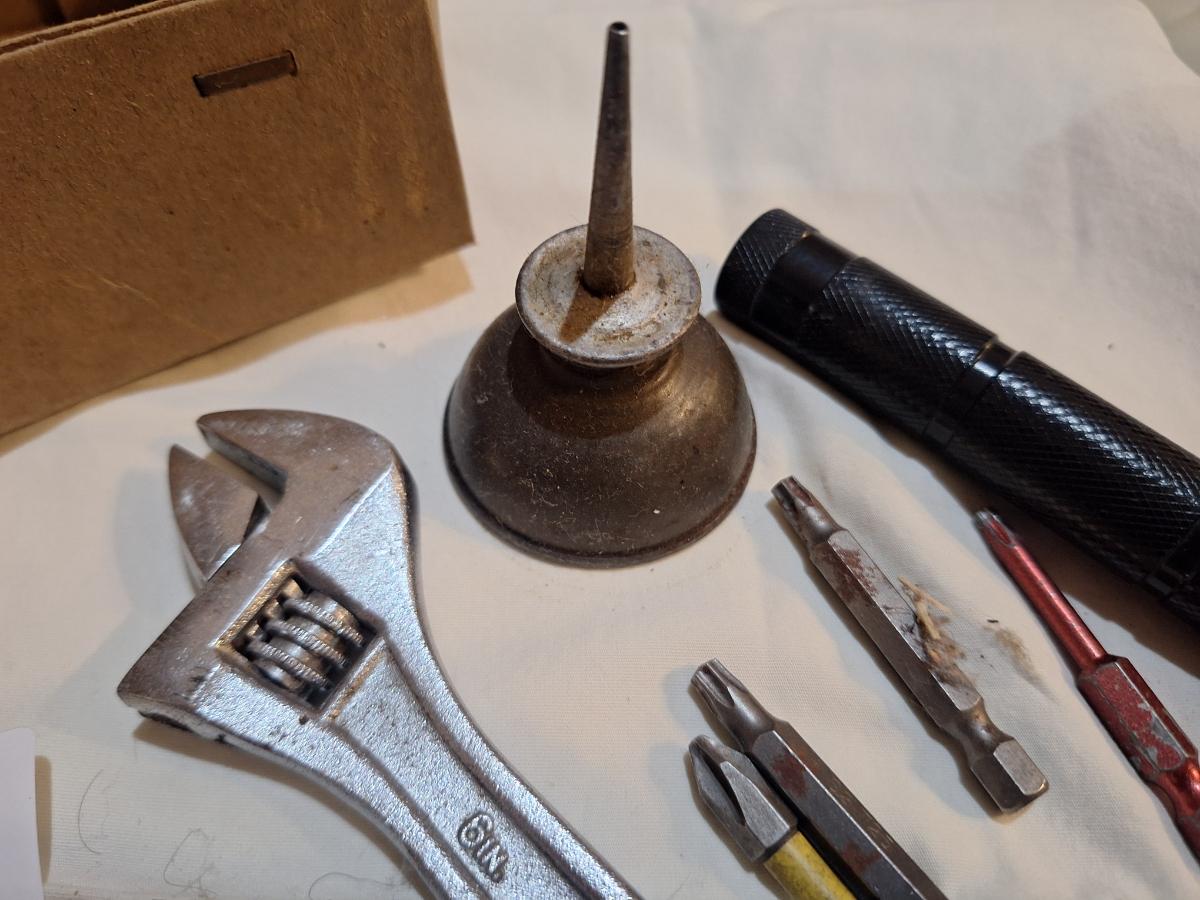 mixed lot of hand tools, crescent wrench, snips, flashlight, oil can and bits