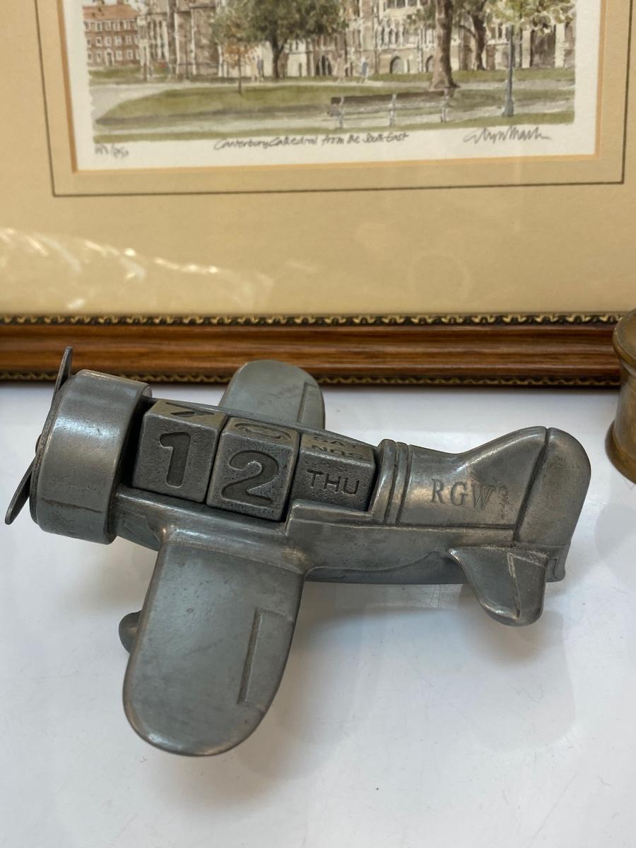 Mixed Lot of Home Decor Wall Art Brass Pewter. Everything in good condition. The airplane is a calendar, with day of week and date. Art is numbered and signed.