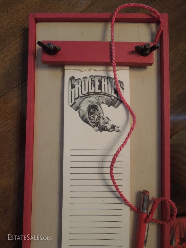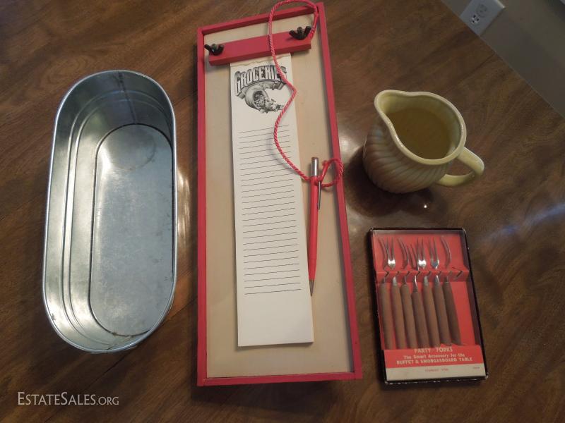 Small galvanized tub, grocery list hanging board (part of paper pad used) , small yellow ceramic creamer, set of 7 wood handled party forks.