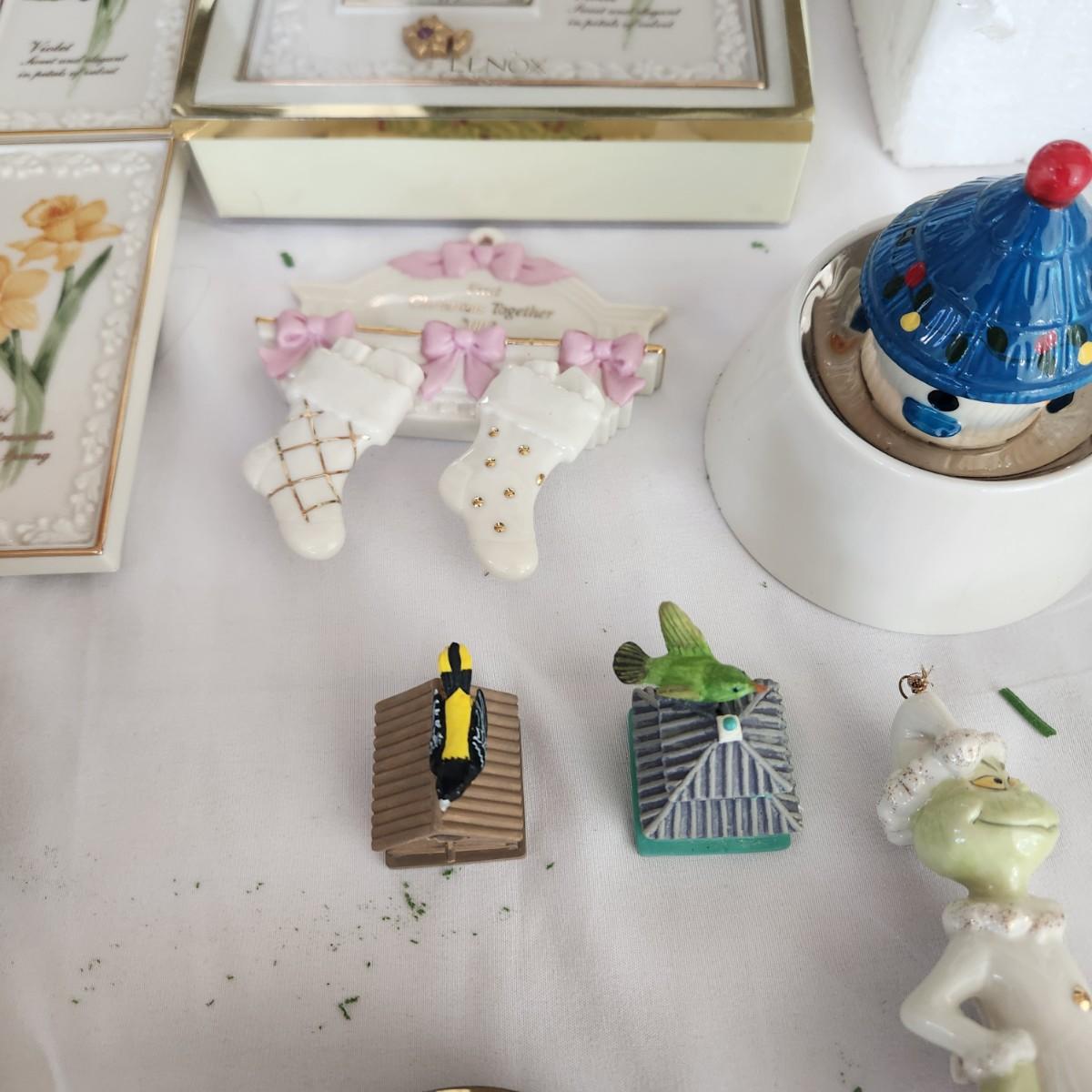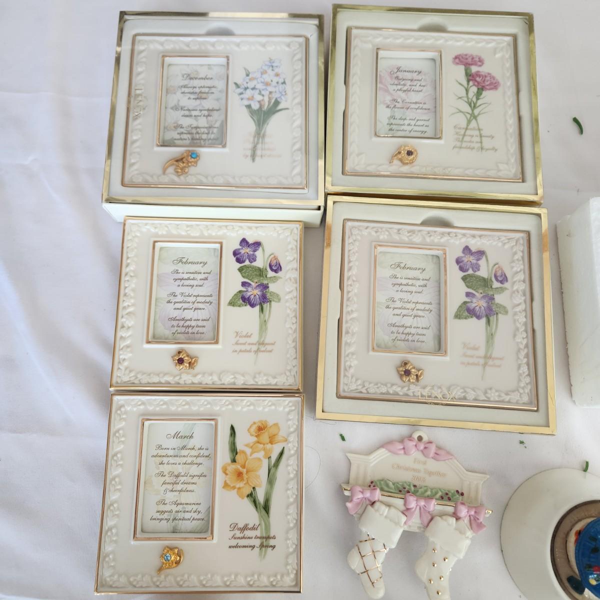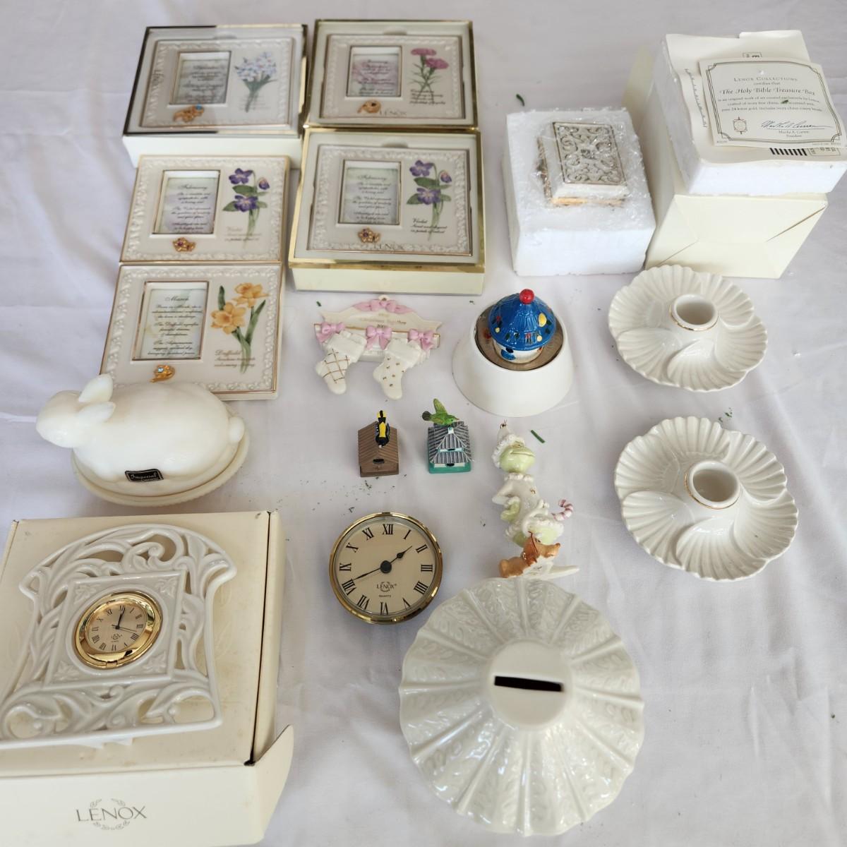 Mixed lot of Lenox , Bible Trinket, Candle holder, Heirloom Bank, Grinch, Clock, Picture Frames