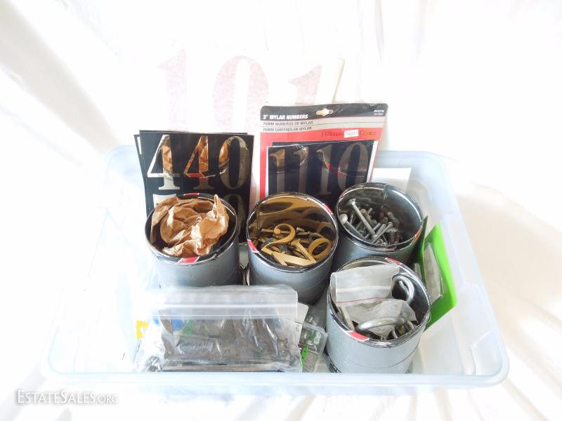 Plastic numbers and letters, Rub on letters, nuts and bolts of various sizes. 4 tobacco cans that have been duct taped with lids. Includes plastic storage bin with lid.