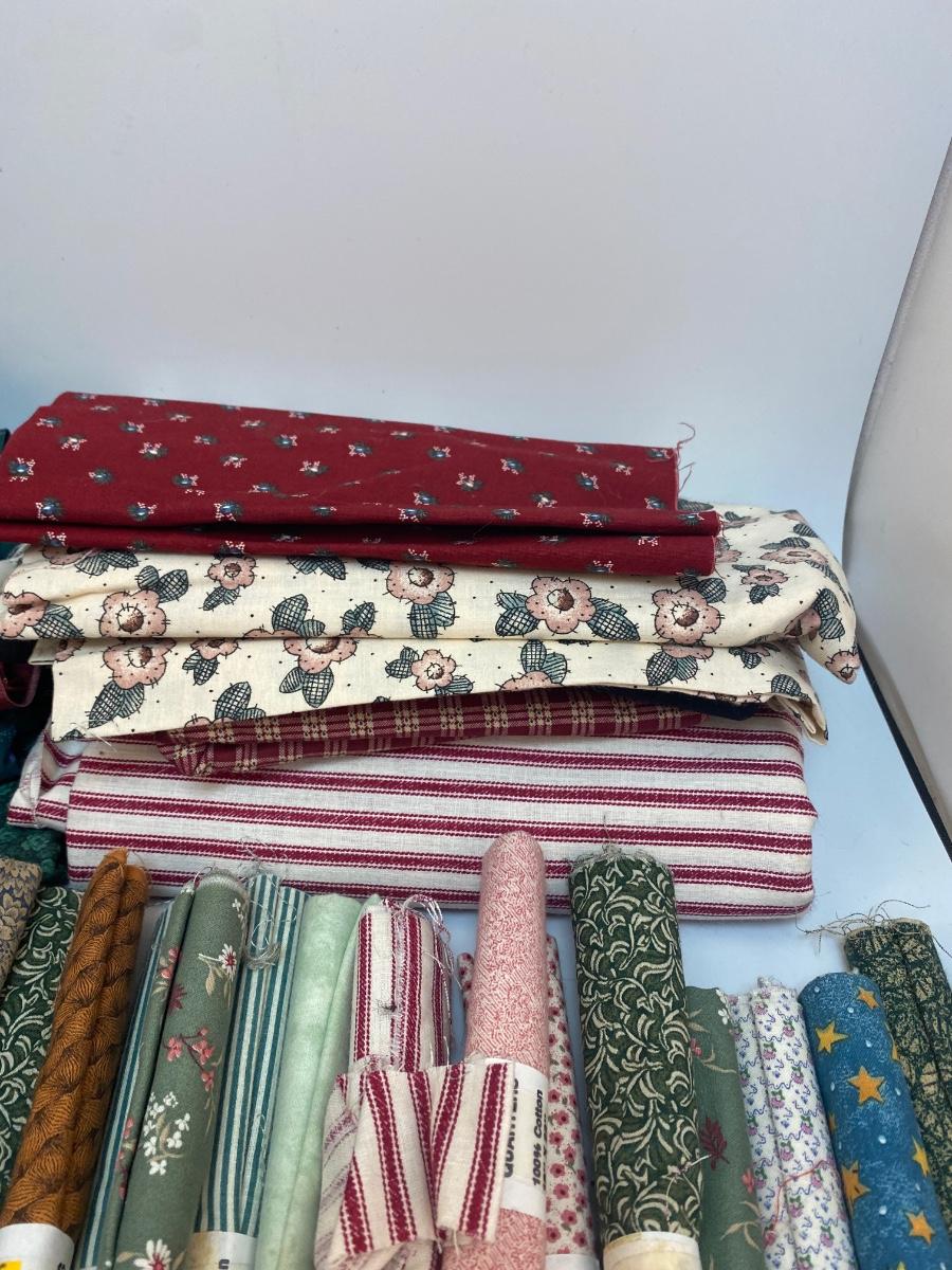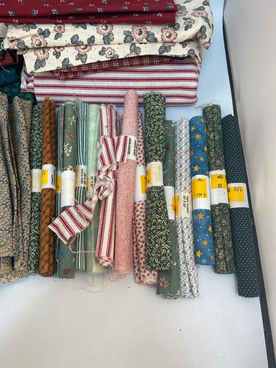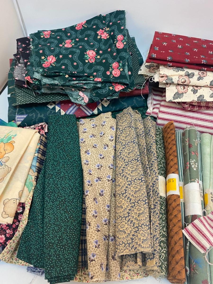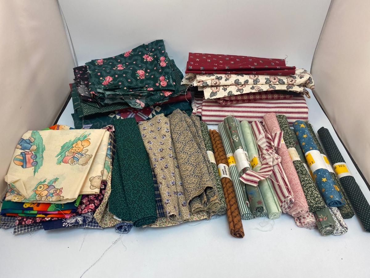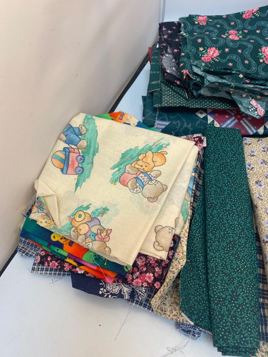 Mixed Lot of Miscellaneous Fabric Square Remnants. Many different fabric patterns. In good condition. Pieces are about the same size but they do vary.