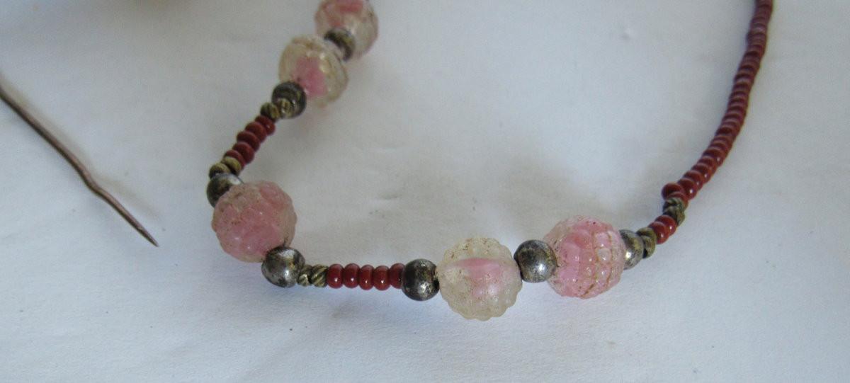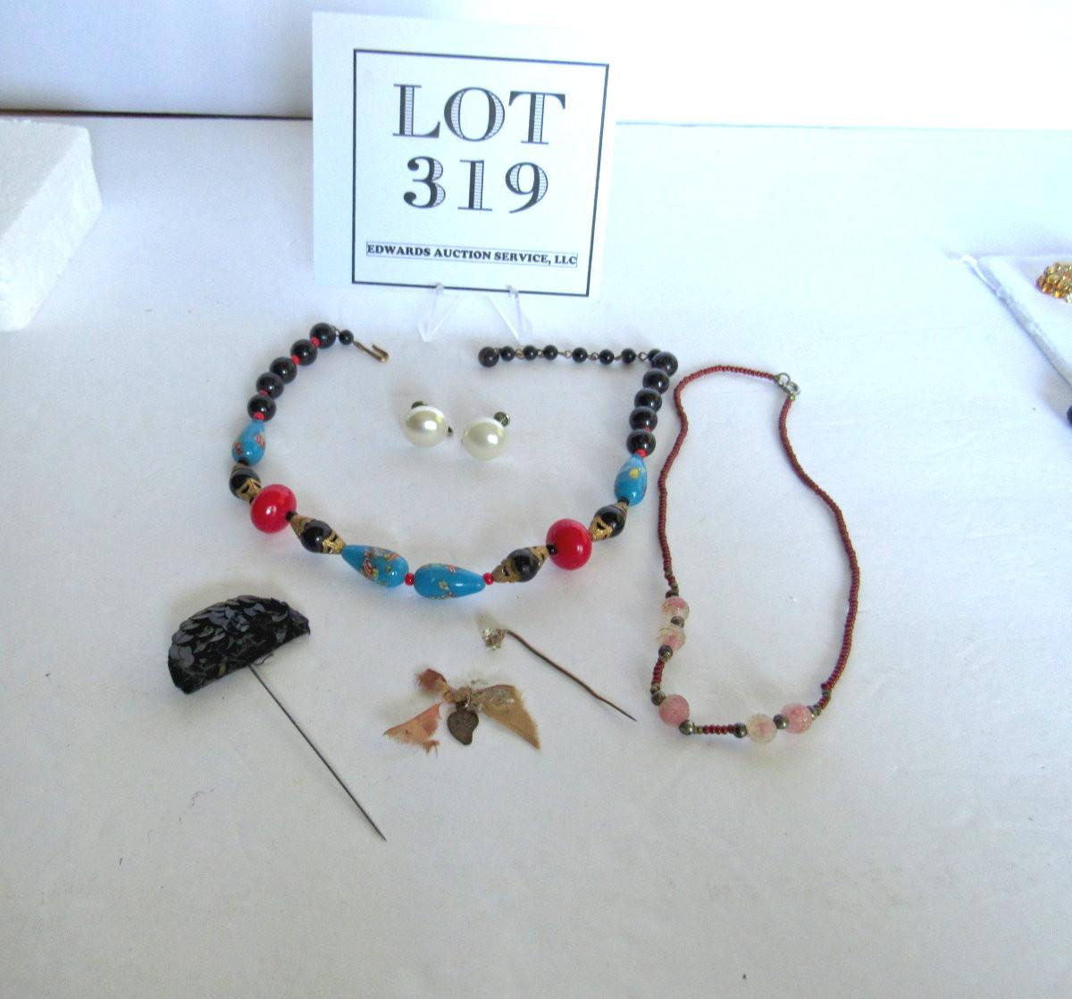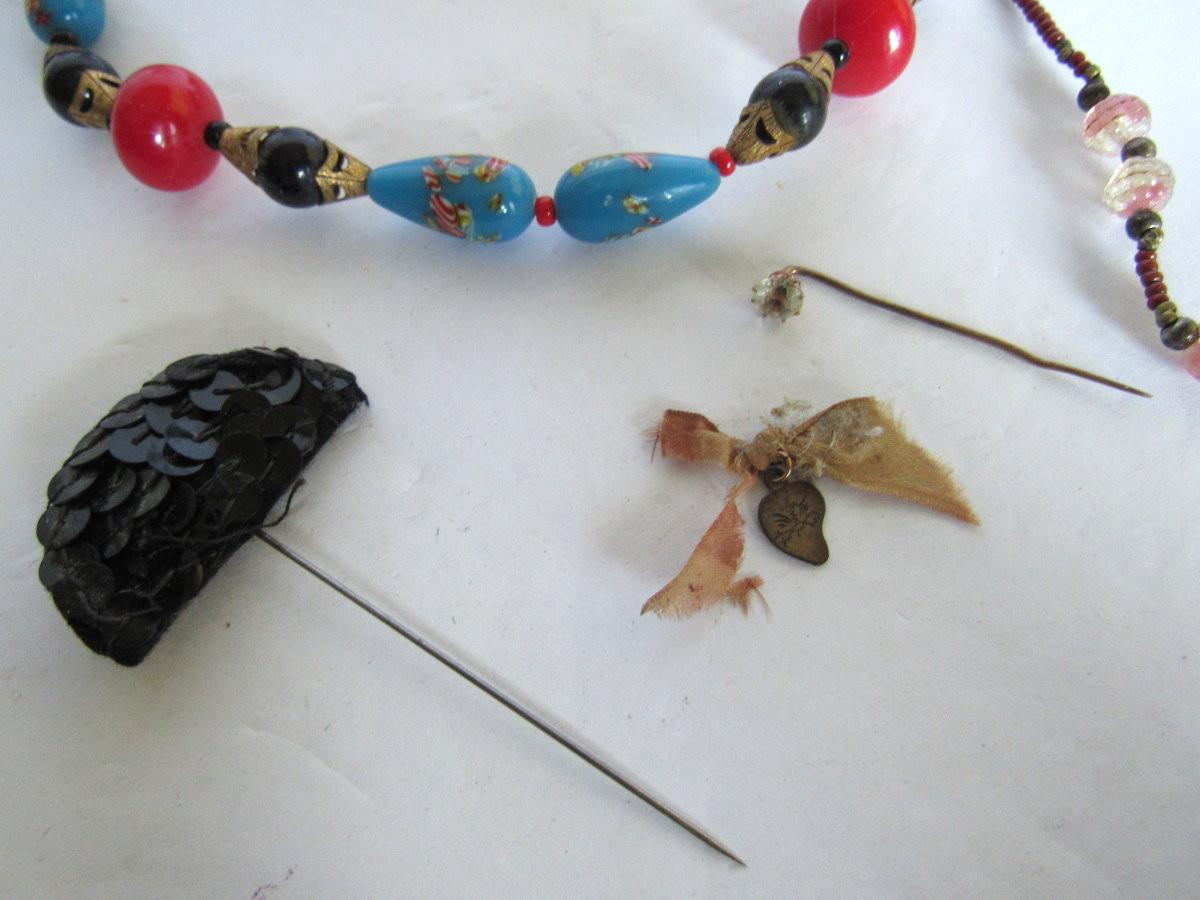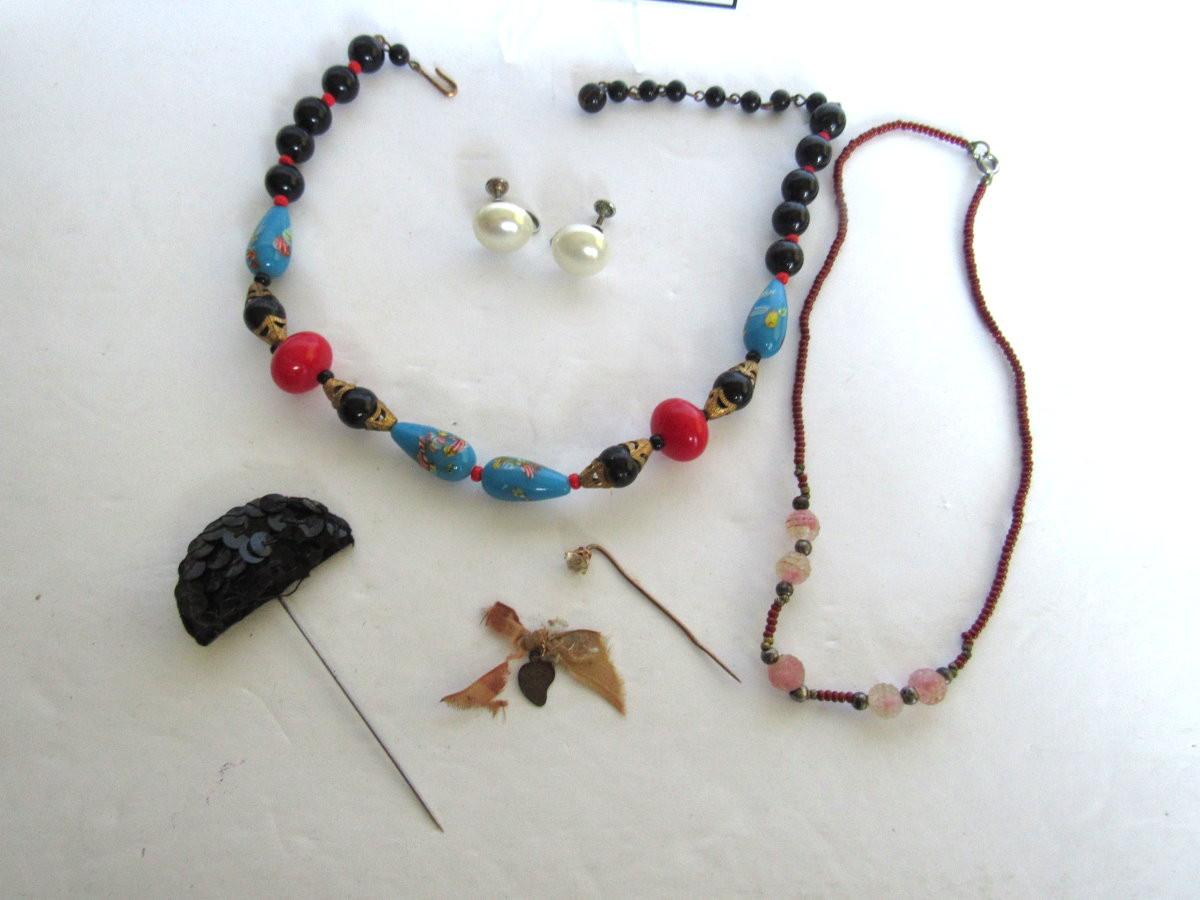 The small beaded necklace has Sterling beads. Two tiny hat or lapel pins, not sure if the large necklace is glass or plastic. Shipping is available on this lot at USPS cost plus handling fee for each box shipped out. See our terms for details.