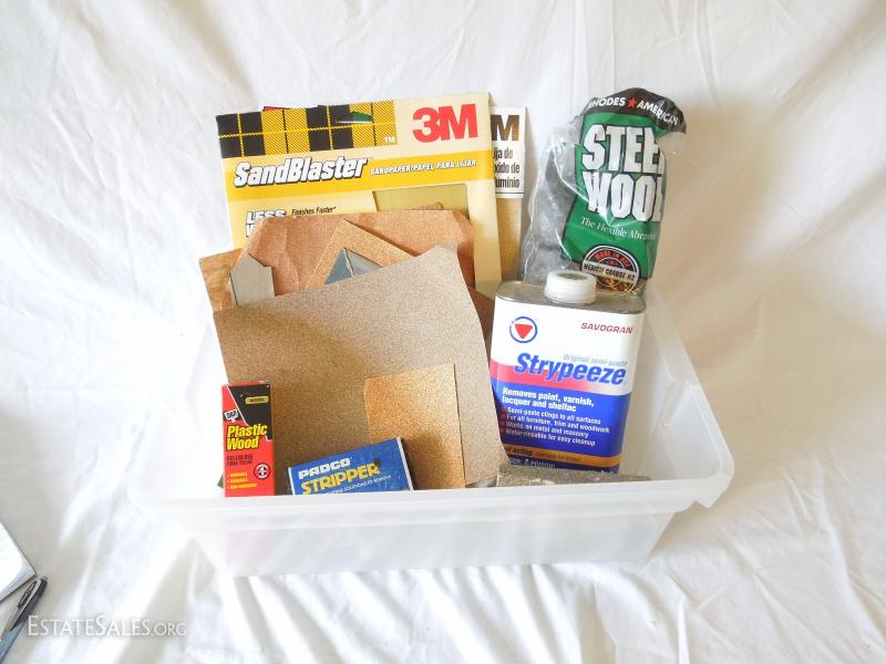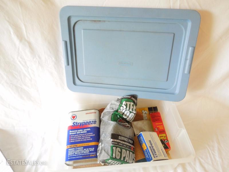 Various grit sand paper, steel wool, near full can of Stripeeze, sanding block. Includes plastic bin with lid.