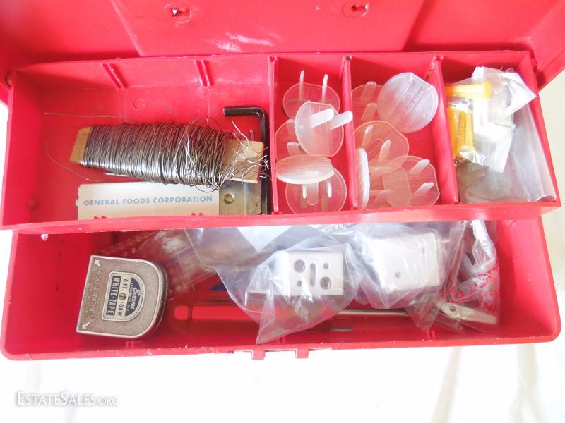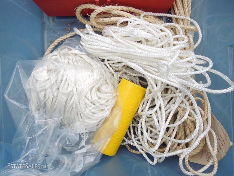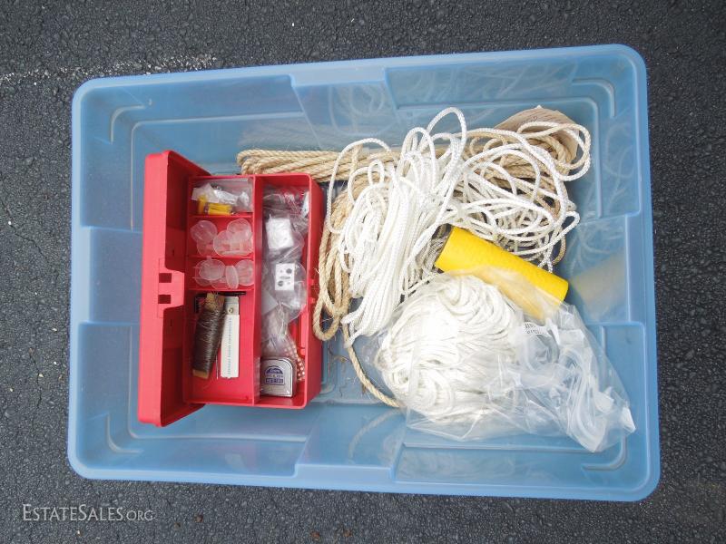 Rope, cord, tackle box and all contents. Plastic bin with lid included.