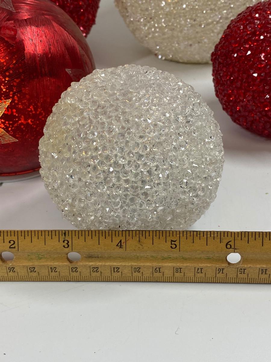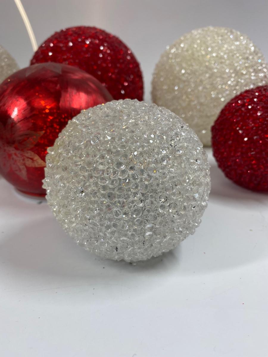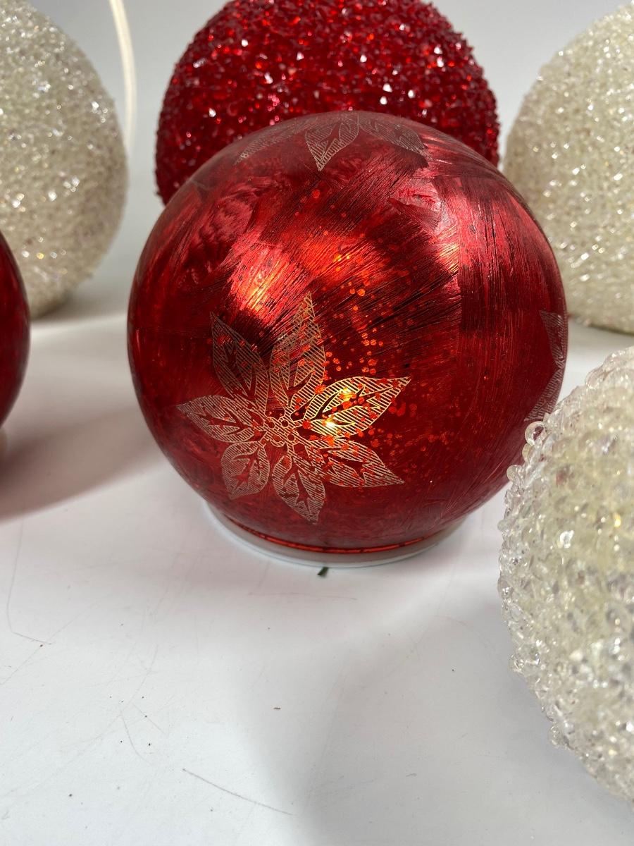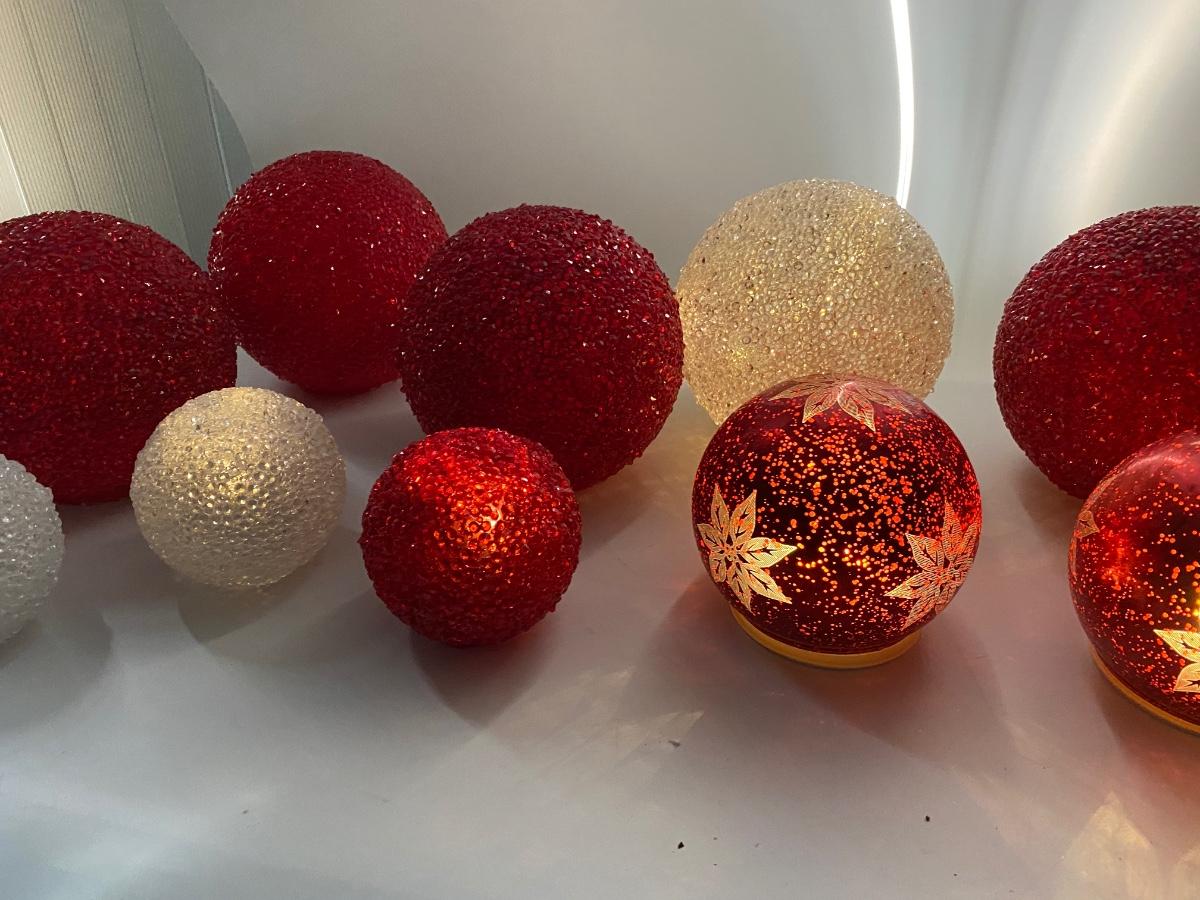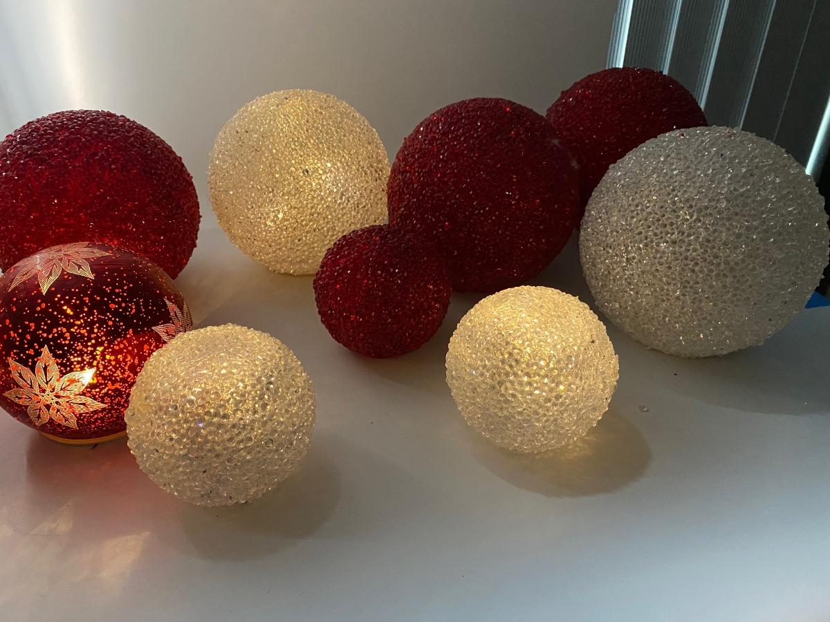 Mixed lot of light orb lanterns. Red and white crystal covered orbs, two sizes. Some have batteries and are working, others untested probably just need batteries. Two small orbs are red with gold snowflake pattern. Great for outside mood lighting.