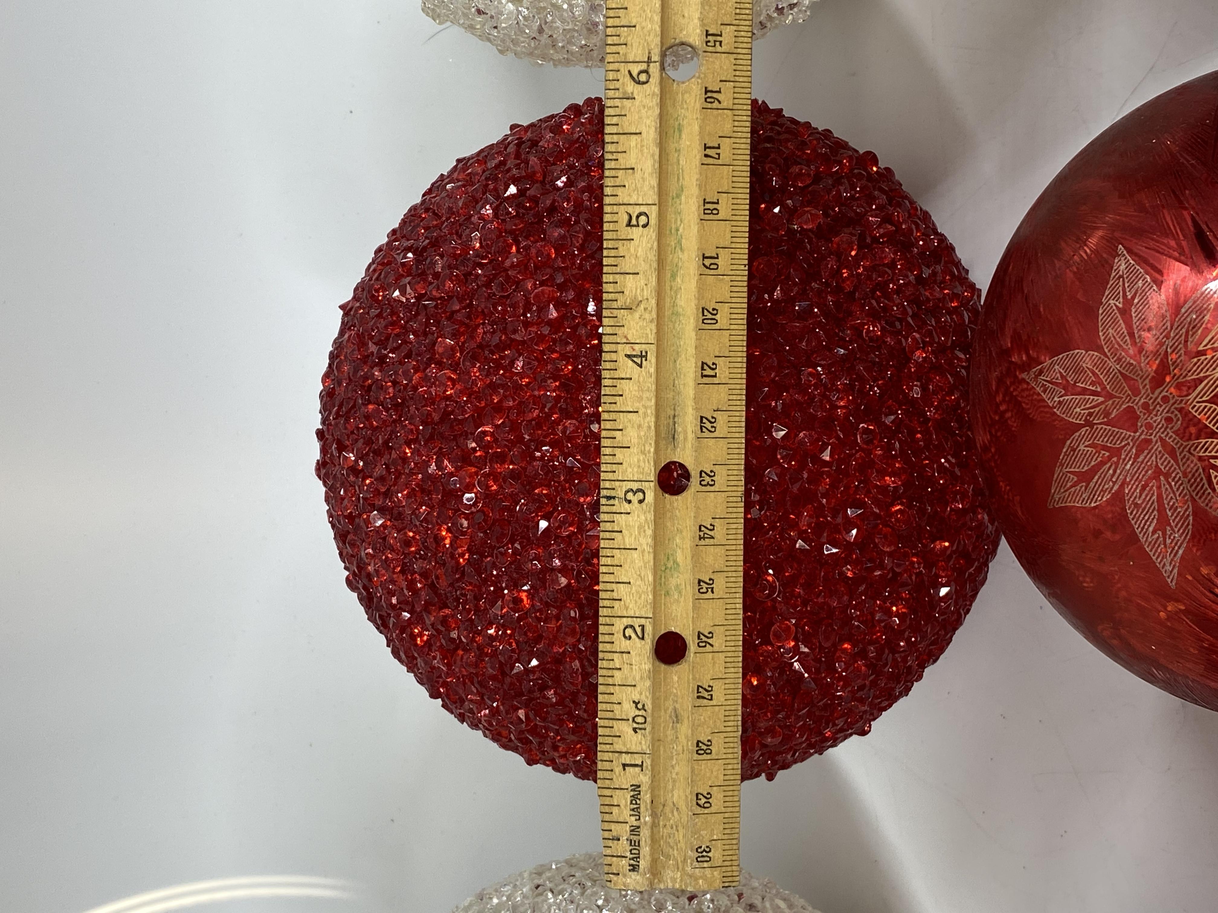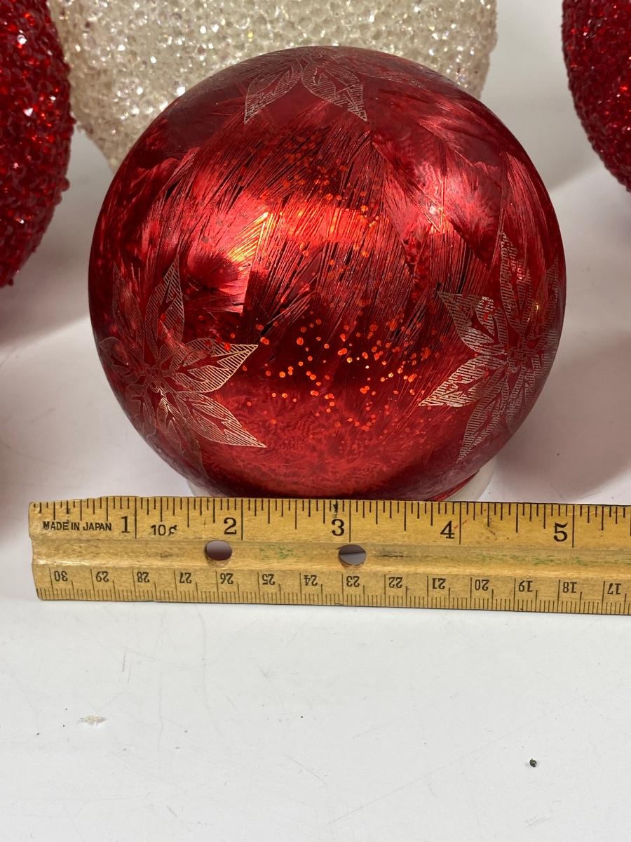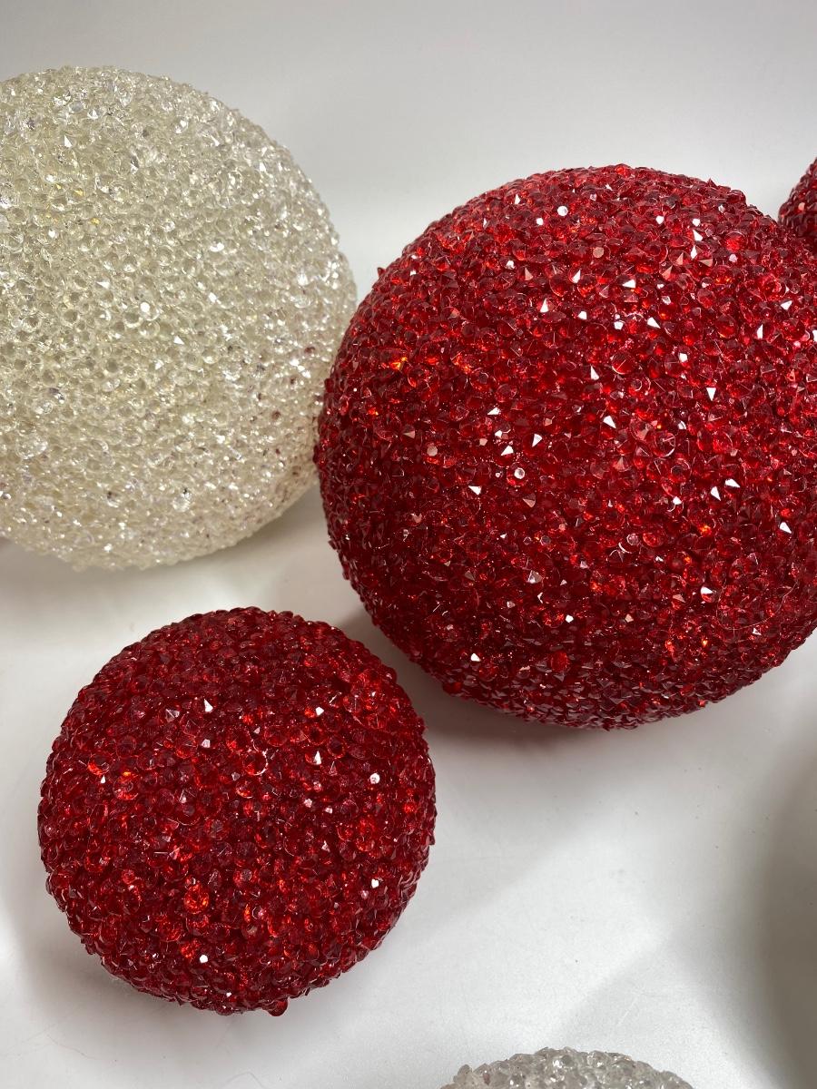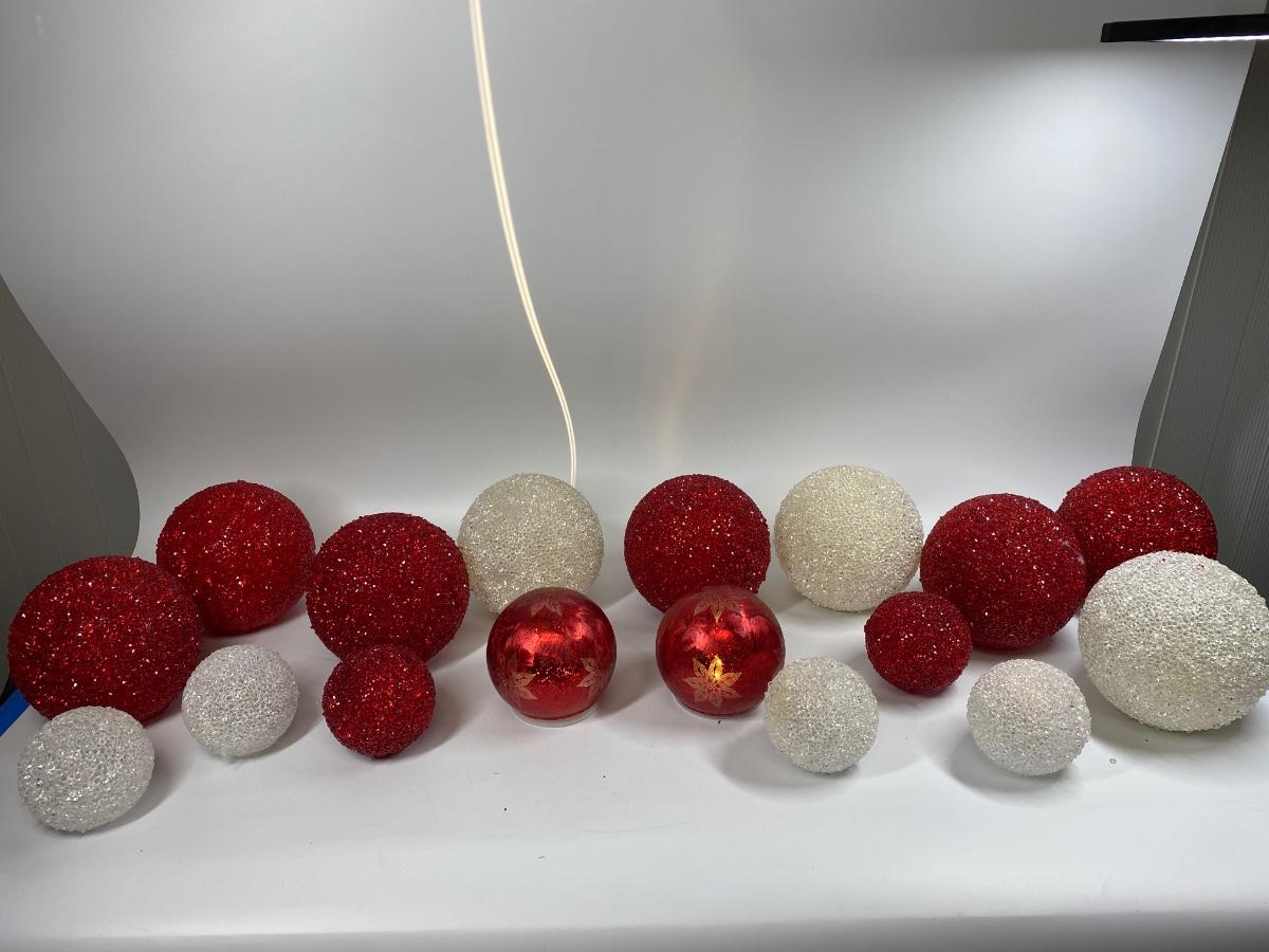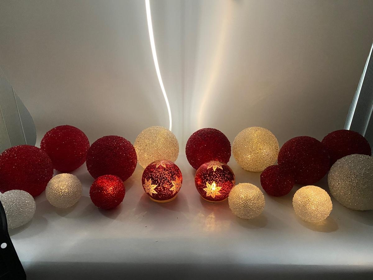 Mixed lot of light orb lanterns. Red and white crystal covered orbs, two sizes. Some have batteries and are working, others untested probably just need batteries. Two small orbs are red with gold snowflake pattern. Great for outside mood lighting.