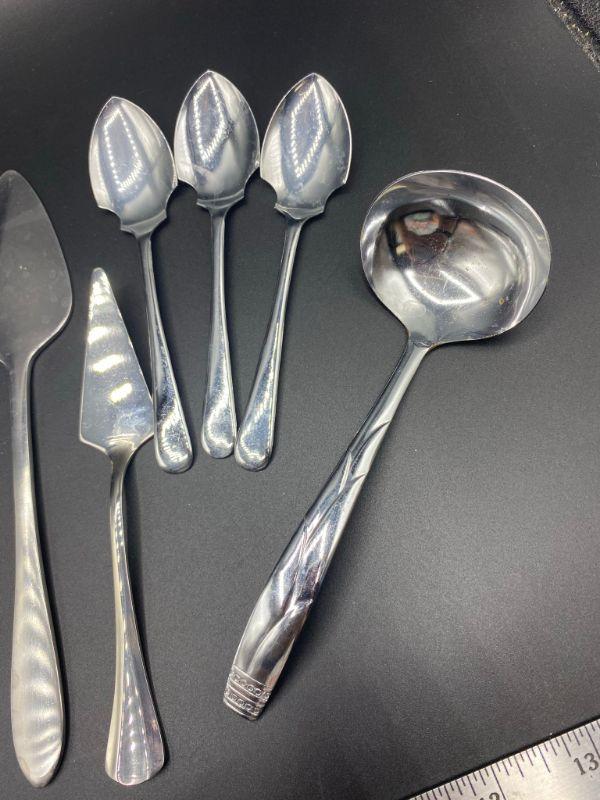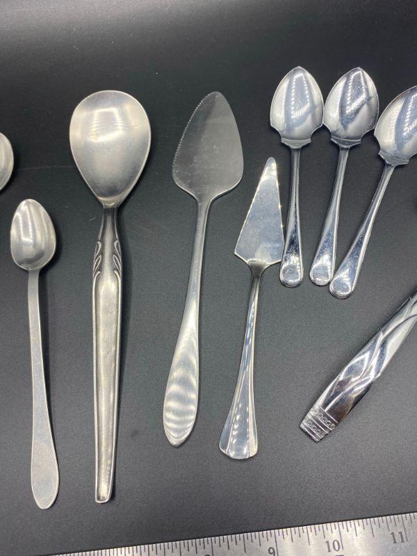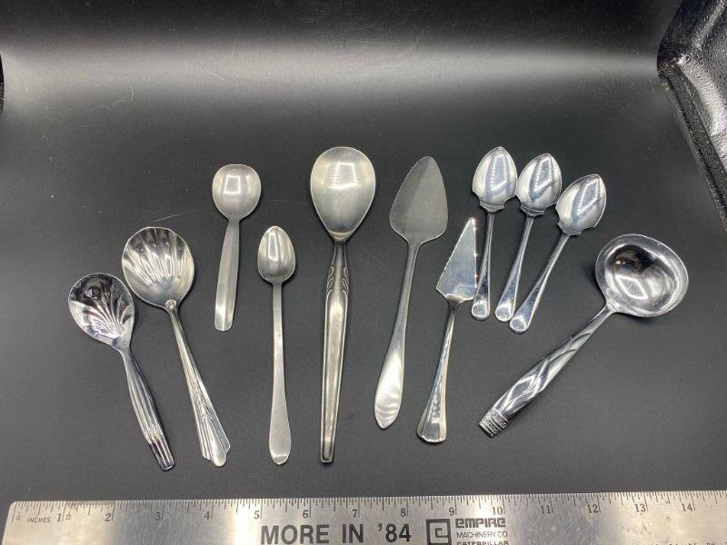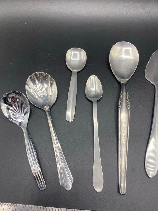 Mixed pattern lot of small serving pieces. Small specialty spoons and a couple larger pieces. Stainless steel, good conditions.
