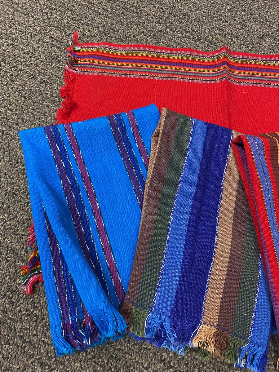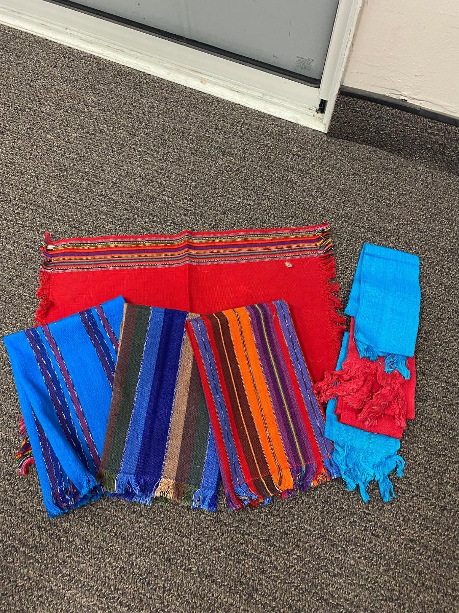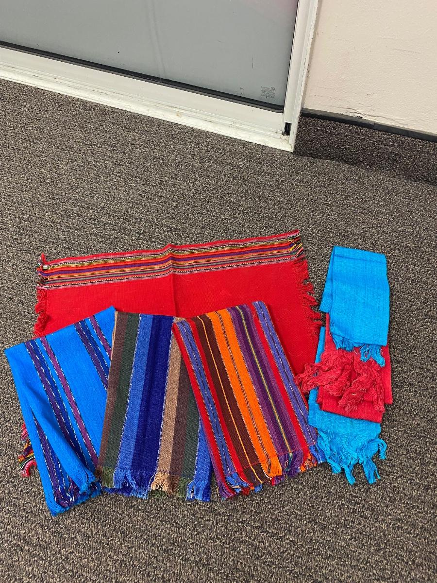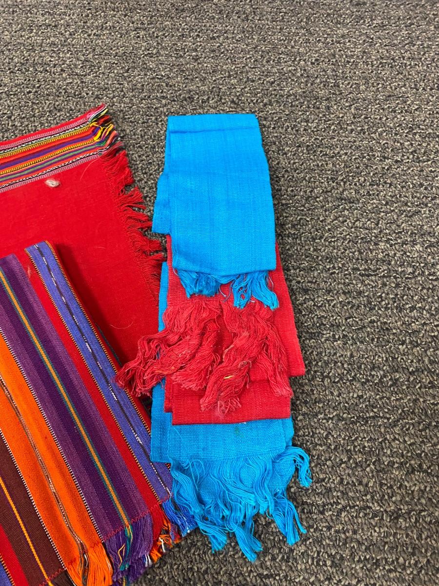 Mixed lot of Southwestern fabric accents. Striped pieces are closer to hand towel size. The solid pieces are small and narrow. Good condition.