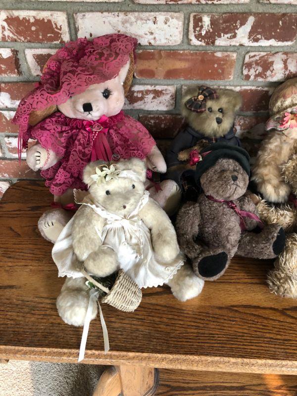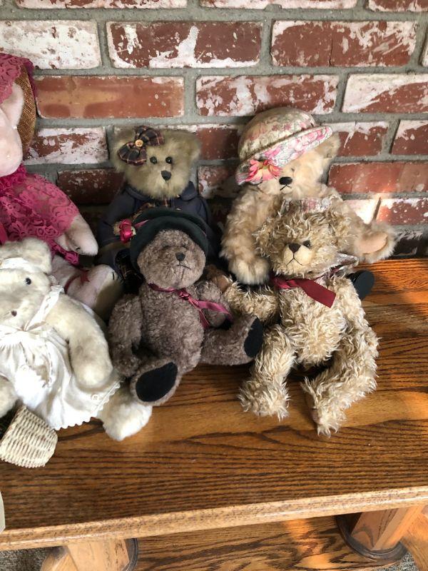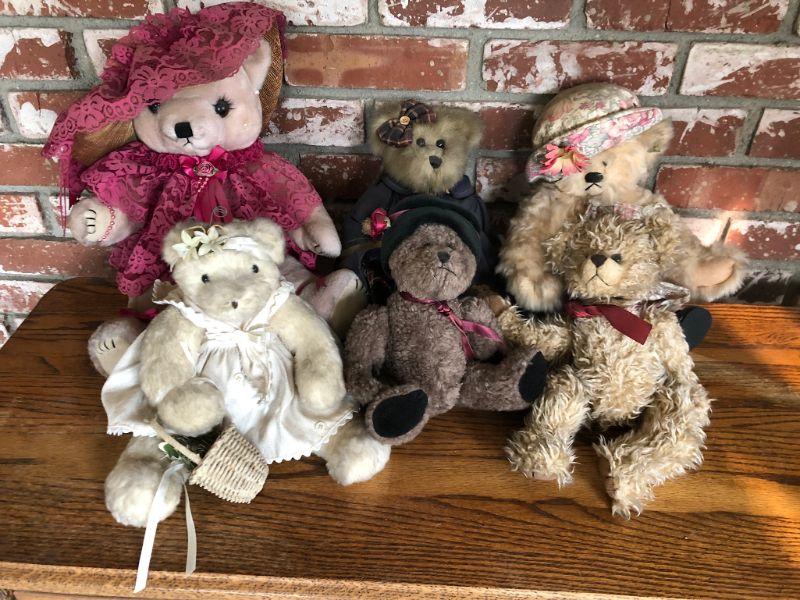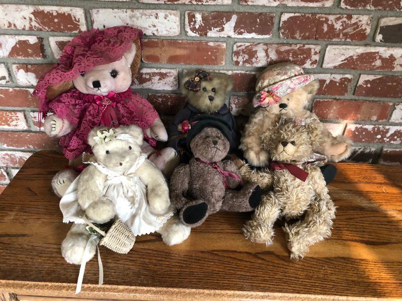 Wonderful mix of 6 teddy bears. Each different from the other. Various sizes, materials, styles. Displayed Condition so they may be dusty.