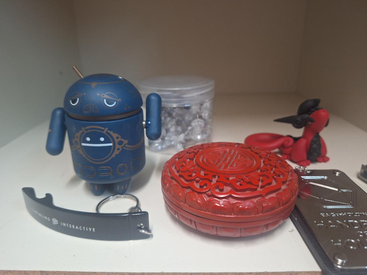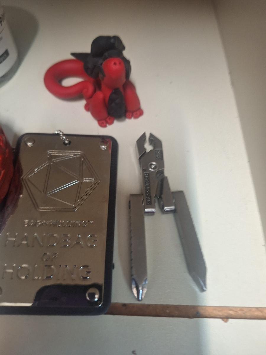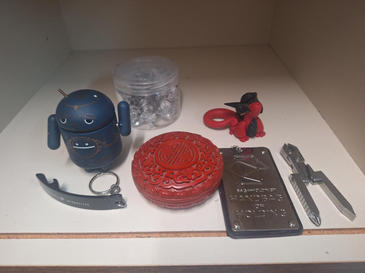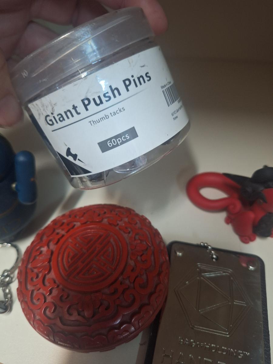 mixed lot of things, red cinna bar trinket box, key chain, Swiss tech multi tool, handbag of holding token- Dungeons & Dragons thing, jar of large push pins and mini android figure