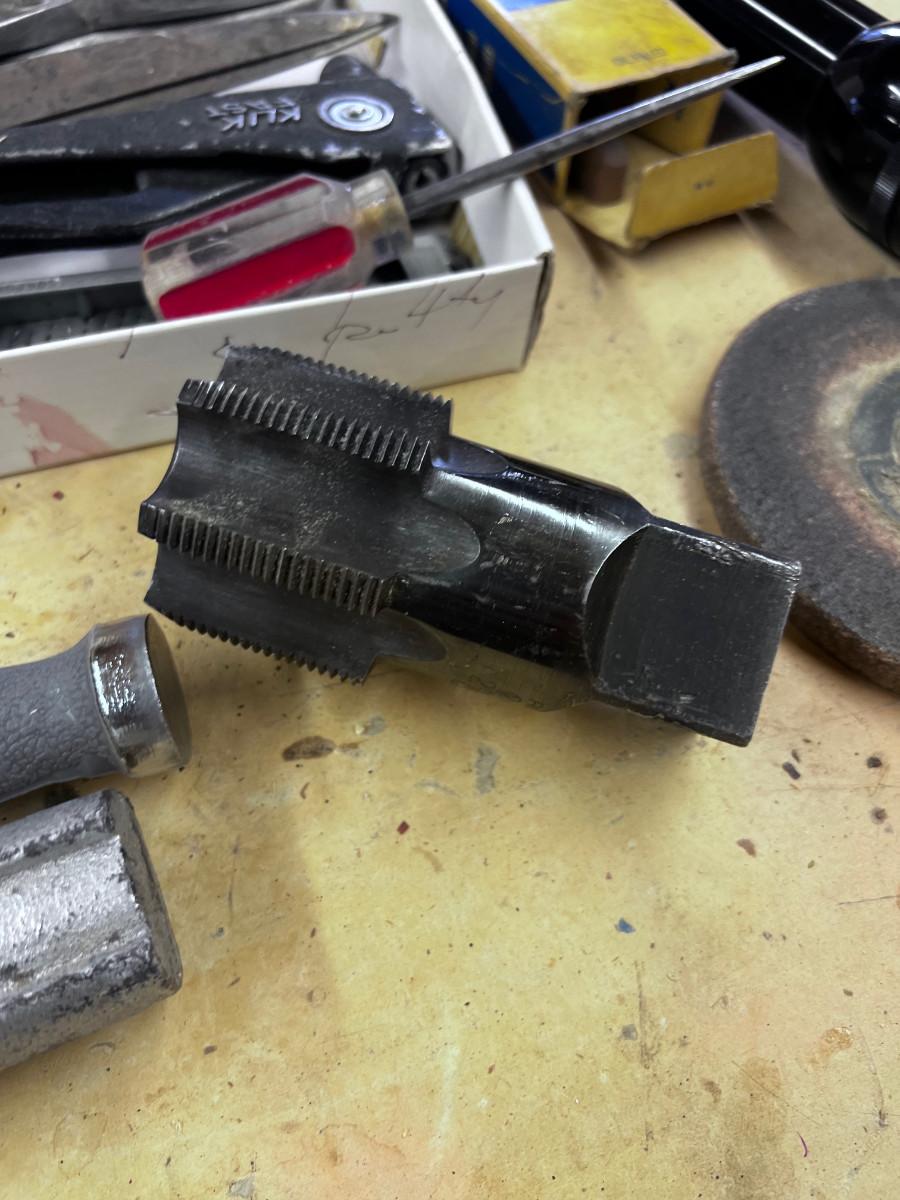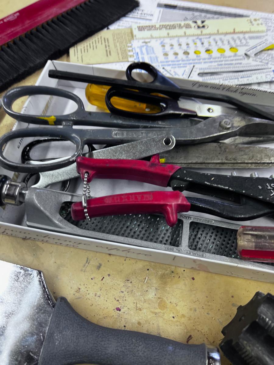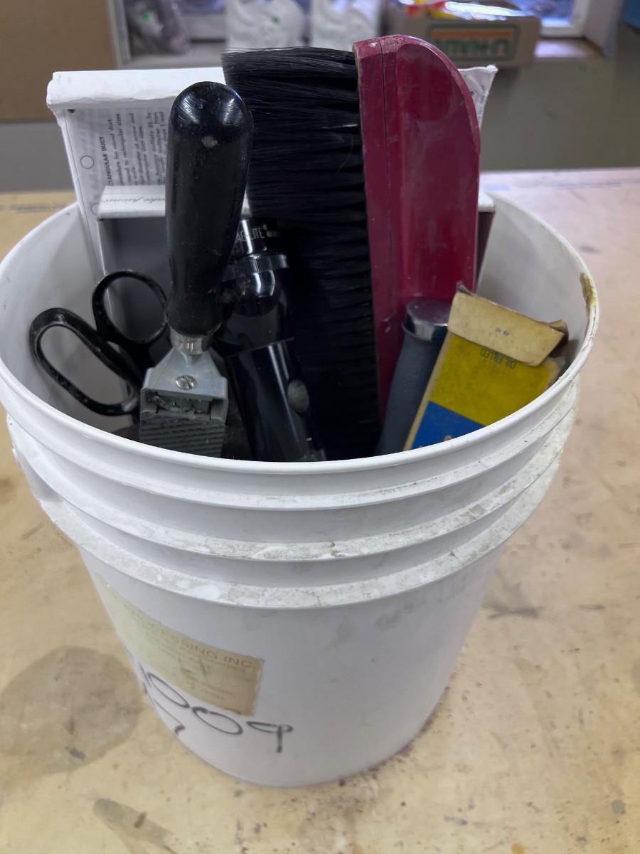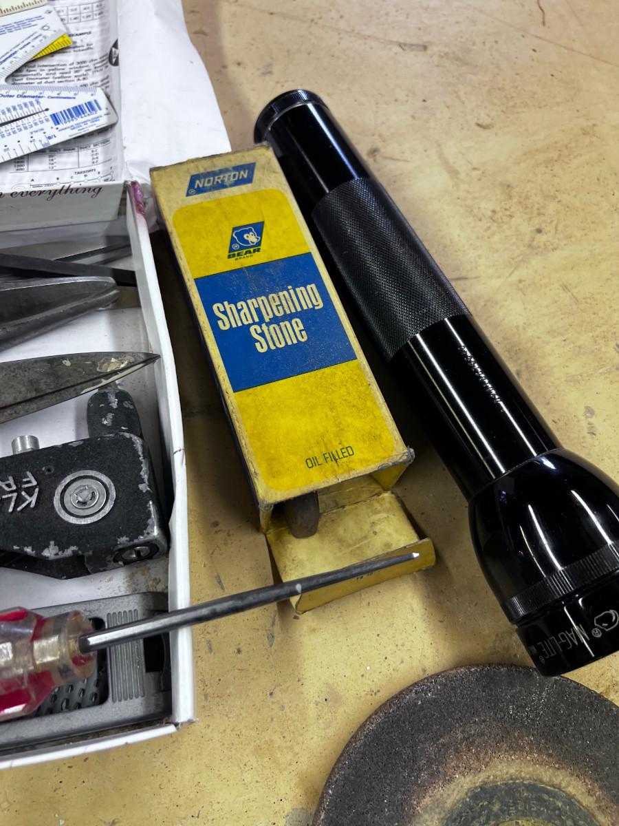 Mixed LOT Of Tools: Flash Light, Tin Snips, Sharpening Stone, includes bucket