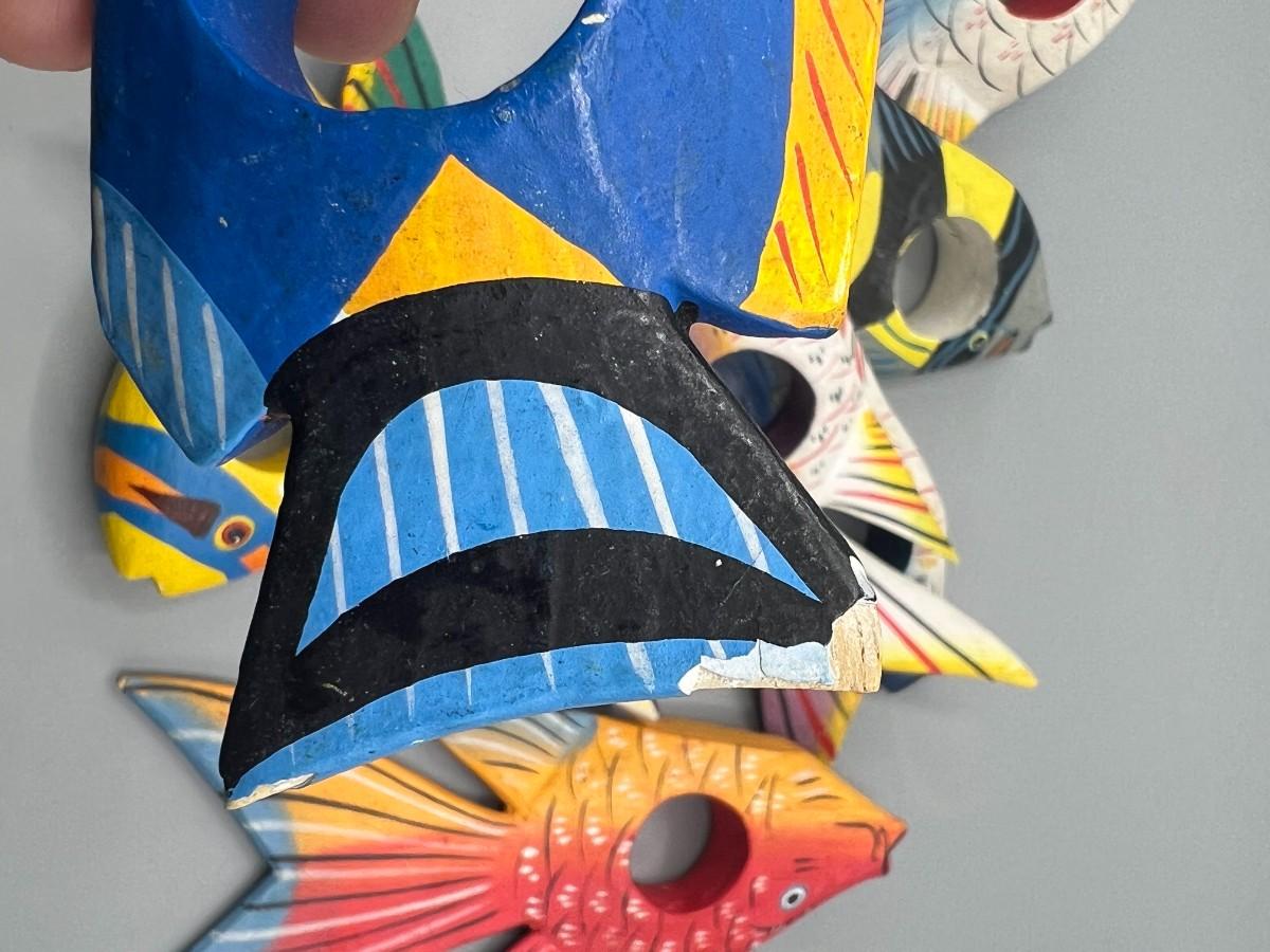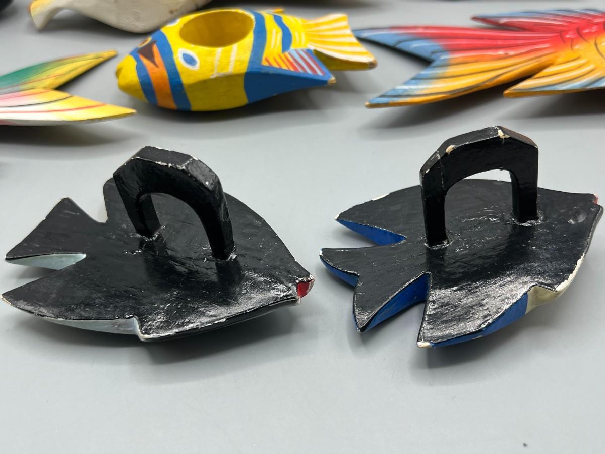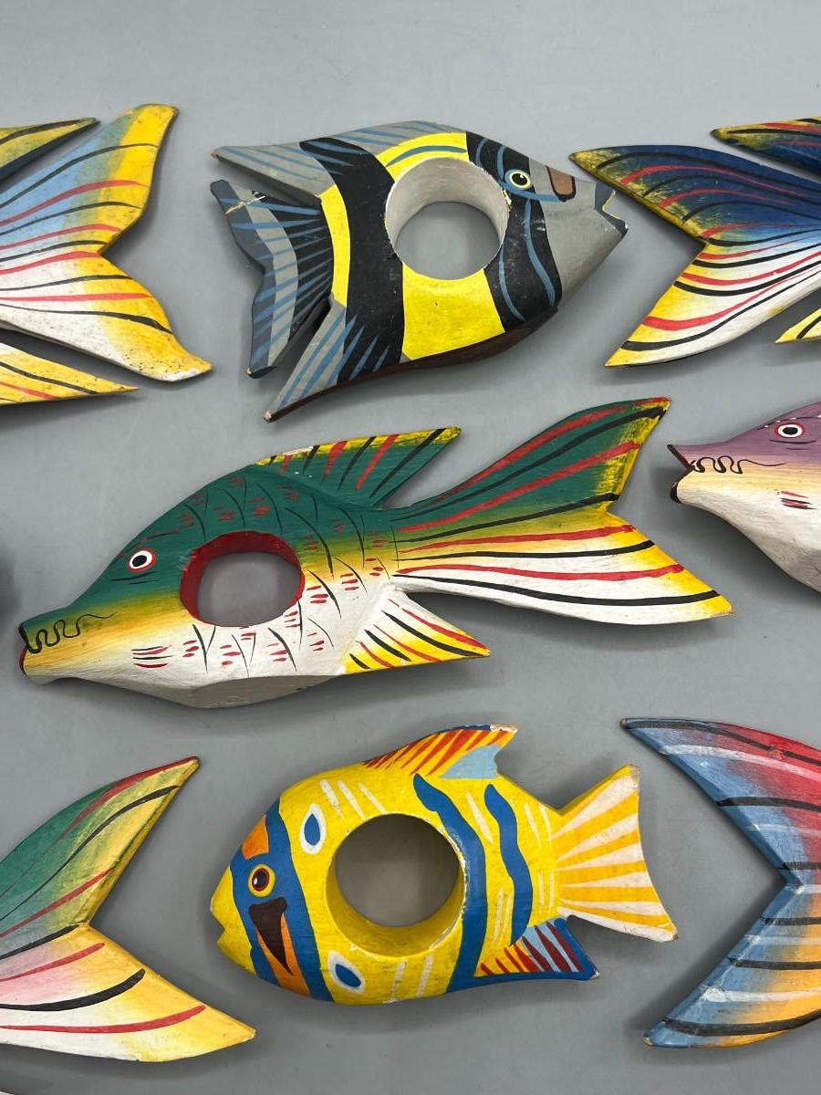 Mixed Lot of Tropical Colorful Painted Wood Fish Napkin Rings. Colorful mix of tropical fish. Did notice a few chips along edges in paint but all seem to be in useable condition. Display great. Sizes vary.