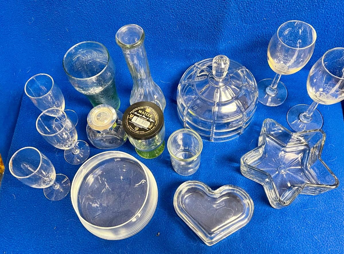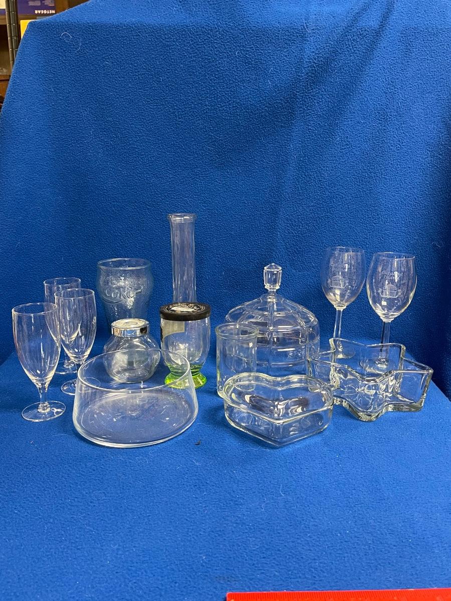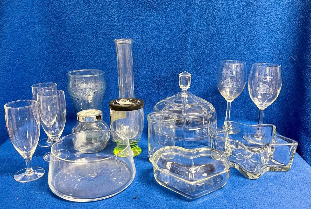 Mixed Lot of Various Clear Glass Decor Pieces, Drink Glasses, & Trinket Dishes. All pieces are in good condition.