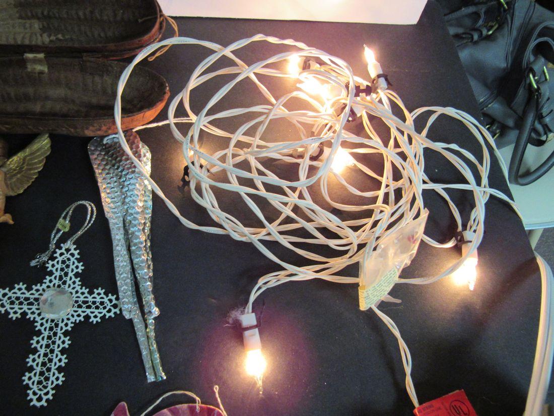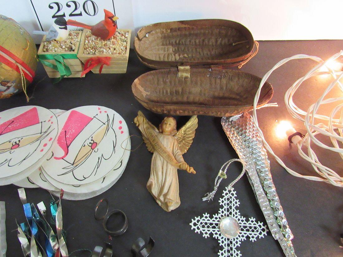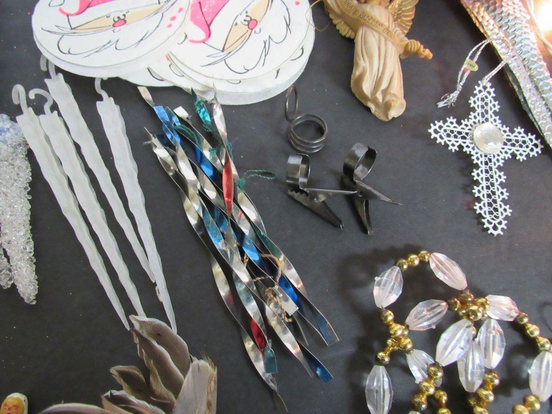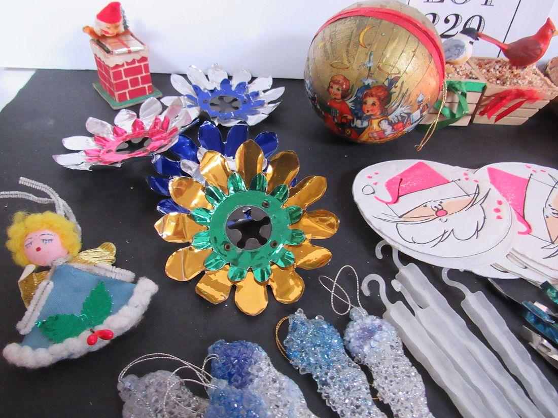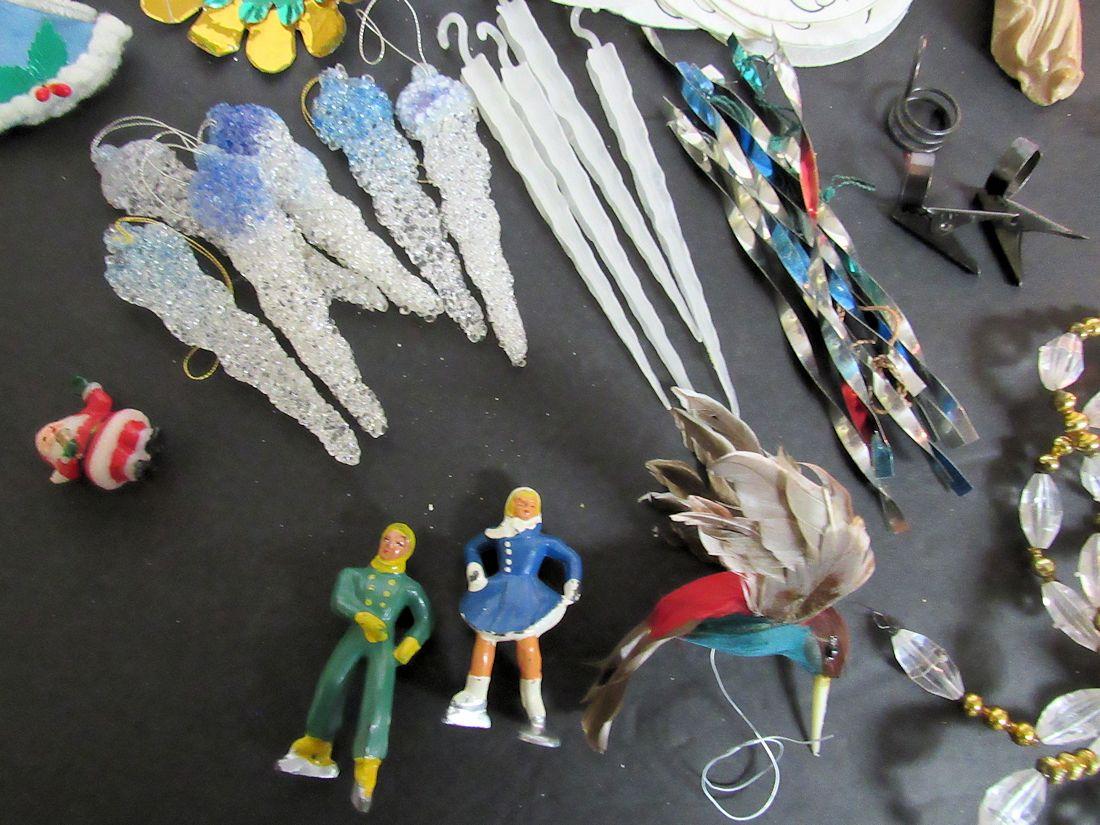 Most are in good shape. The peanut candy container is stained and one flap is torn. The ball candy container is good. Lights work. Paper coasters bottom paper piece is coming off of some. Plastic and tin icicles are good. Shipping is available at shipping cost plus $5.00 handling fee on up to 6 lots, $10.00 handling fee on 7 or more lots or two boxes. $15.00 handling fee on 3 boxes. Helps cover shipping materials and labor cost.