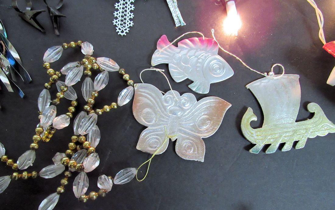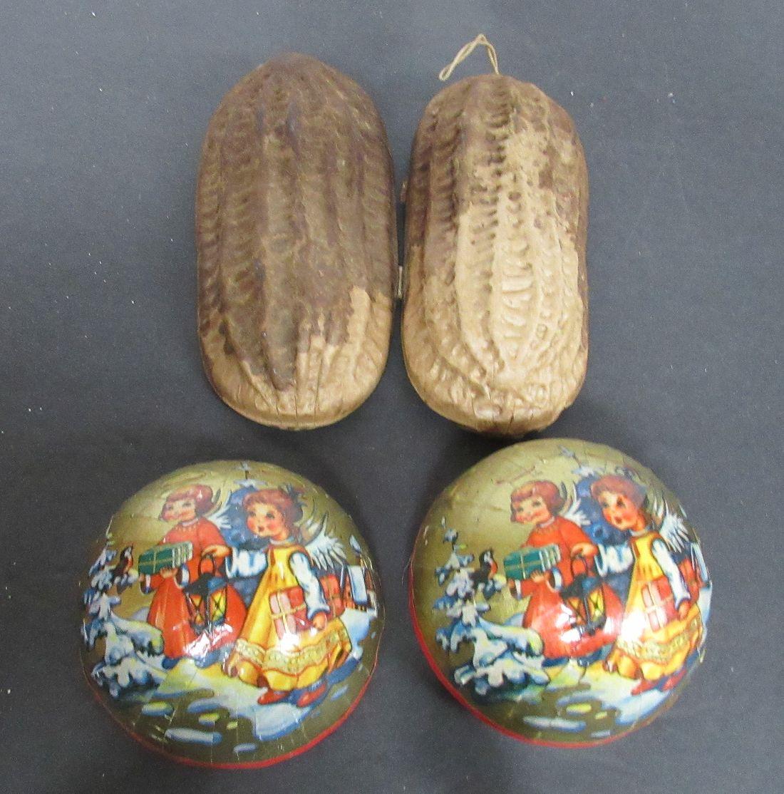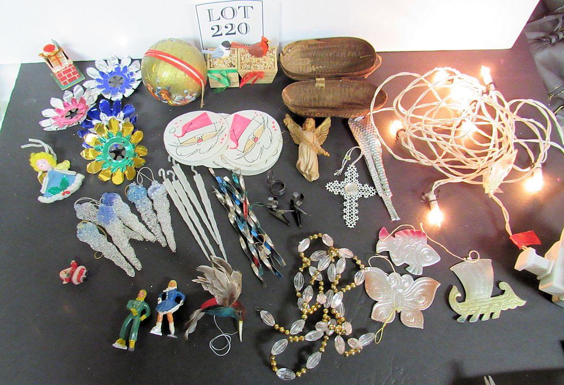 Mixed Lot of Vintage Christmas Stuff: Lead Skaters, Foil Reflectors, 2 Candy Containers, Russian Cardboard, More