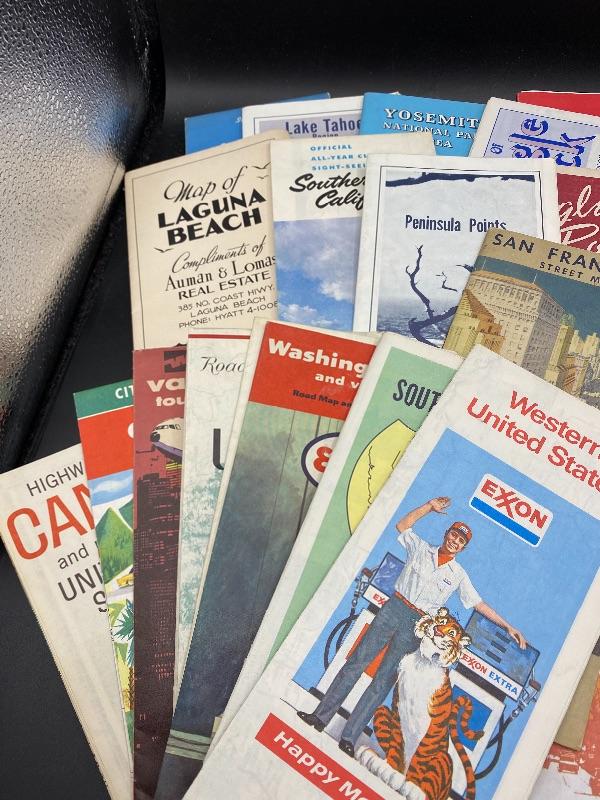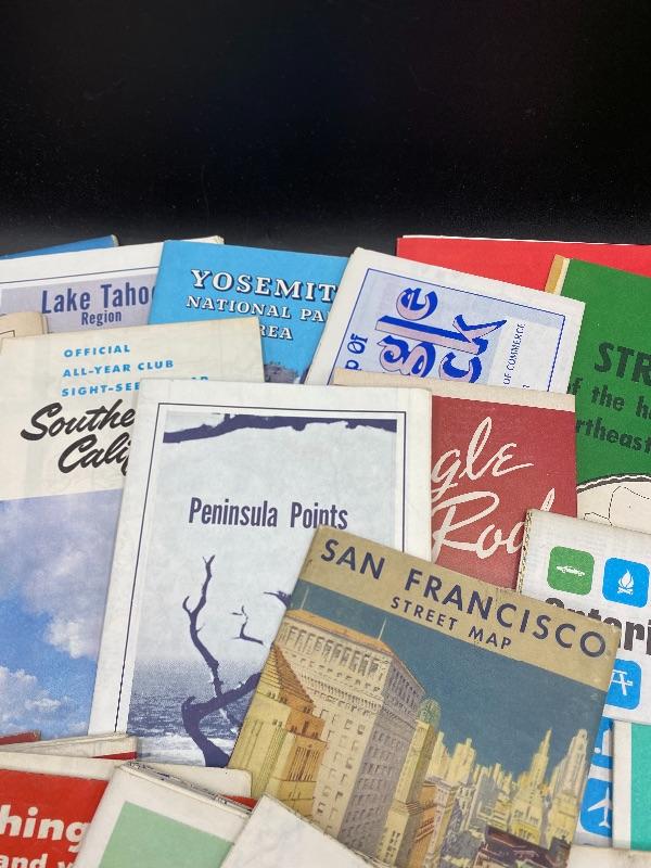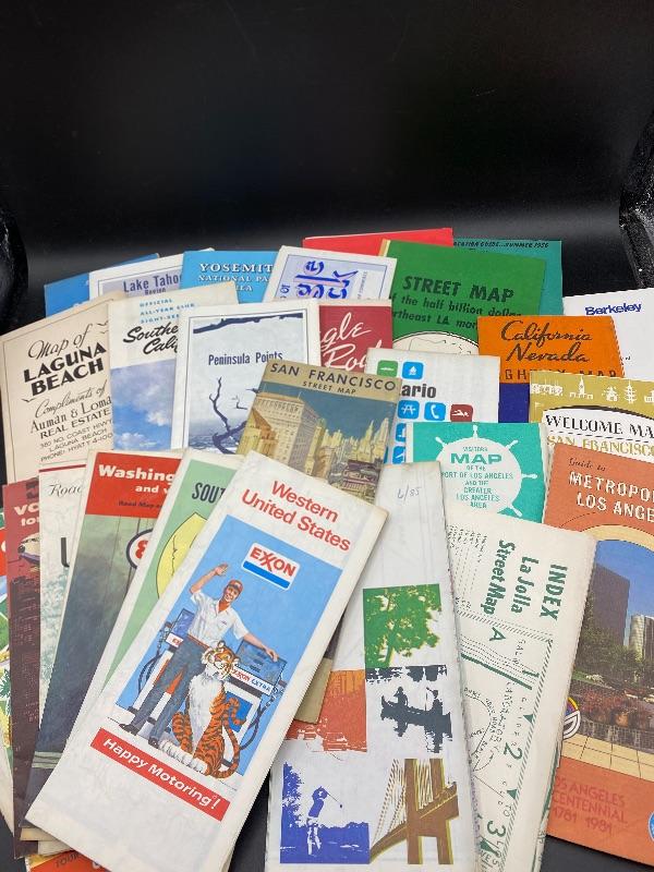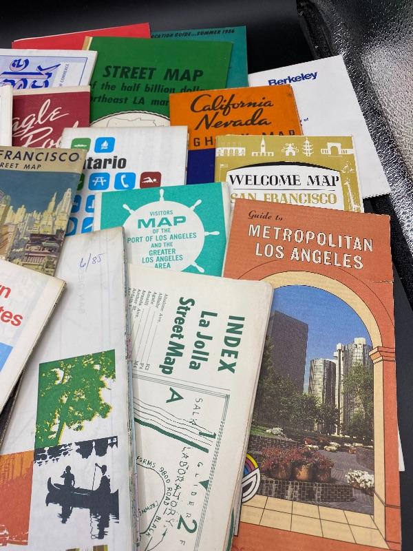 Mixed lot of vintage maps of California and other US points of interest. Most are area maps of California. Maps are from AAA, various gas stations, and small local prints. Date back to the 1950s. Good used conditions.