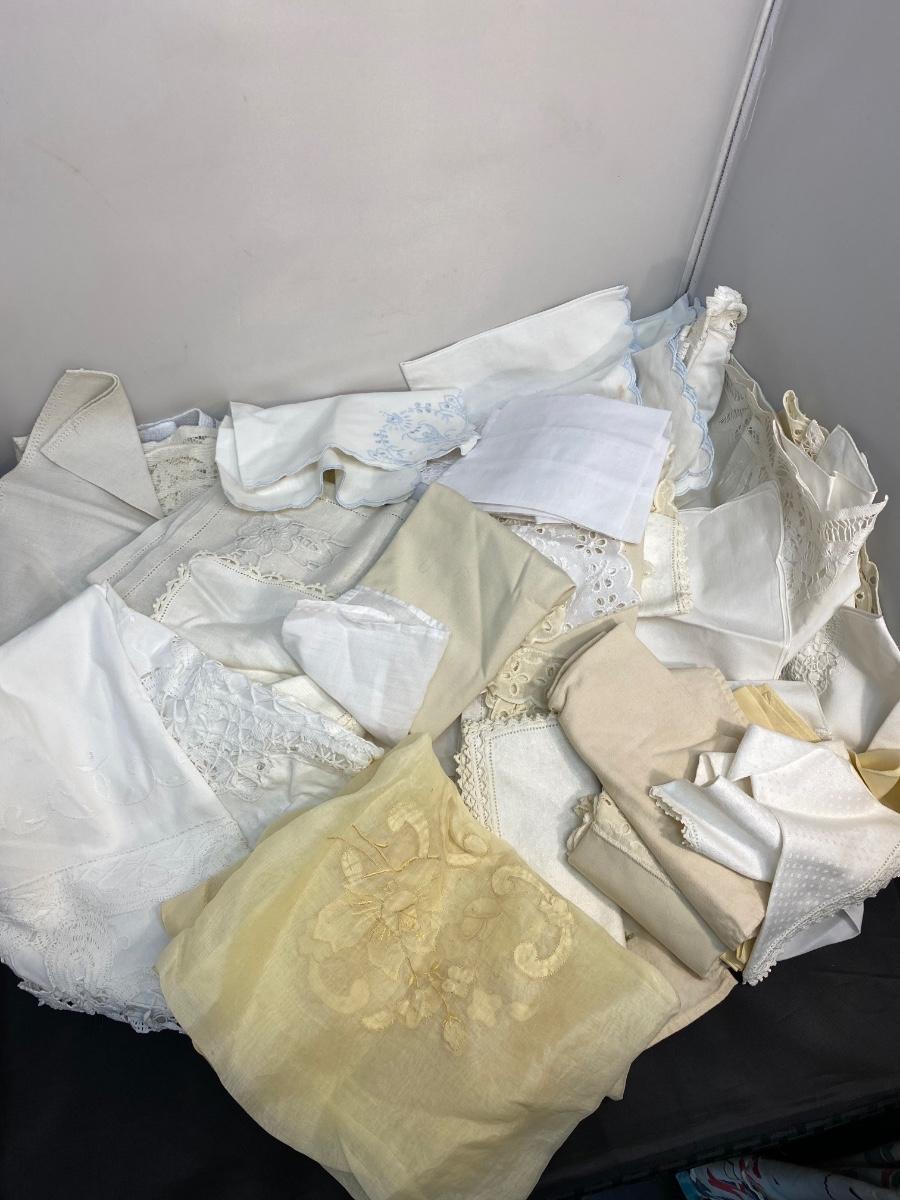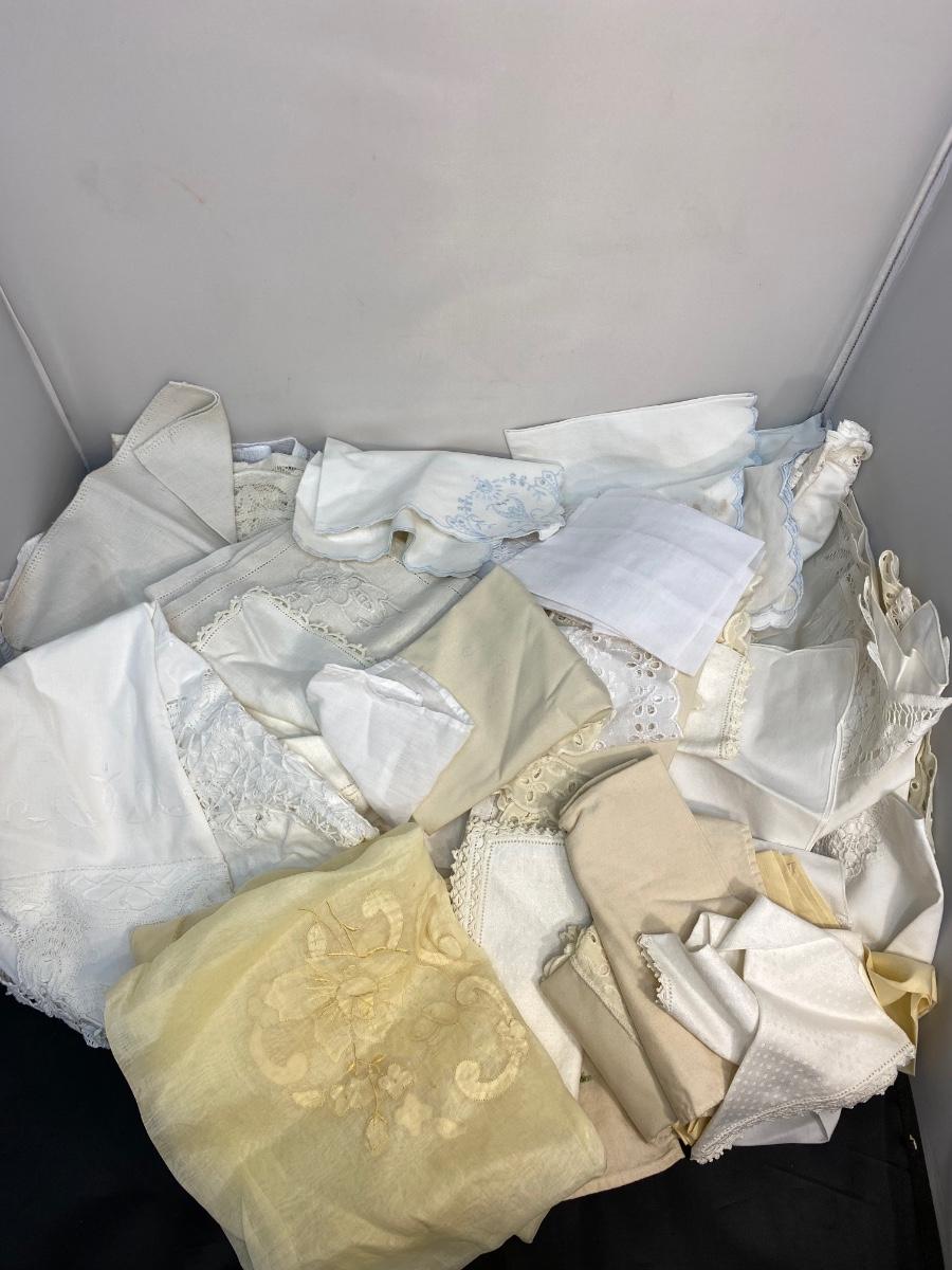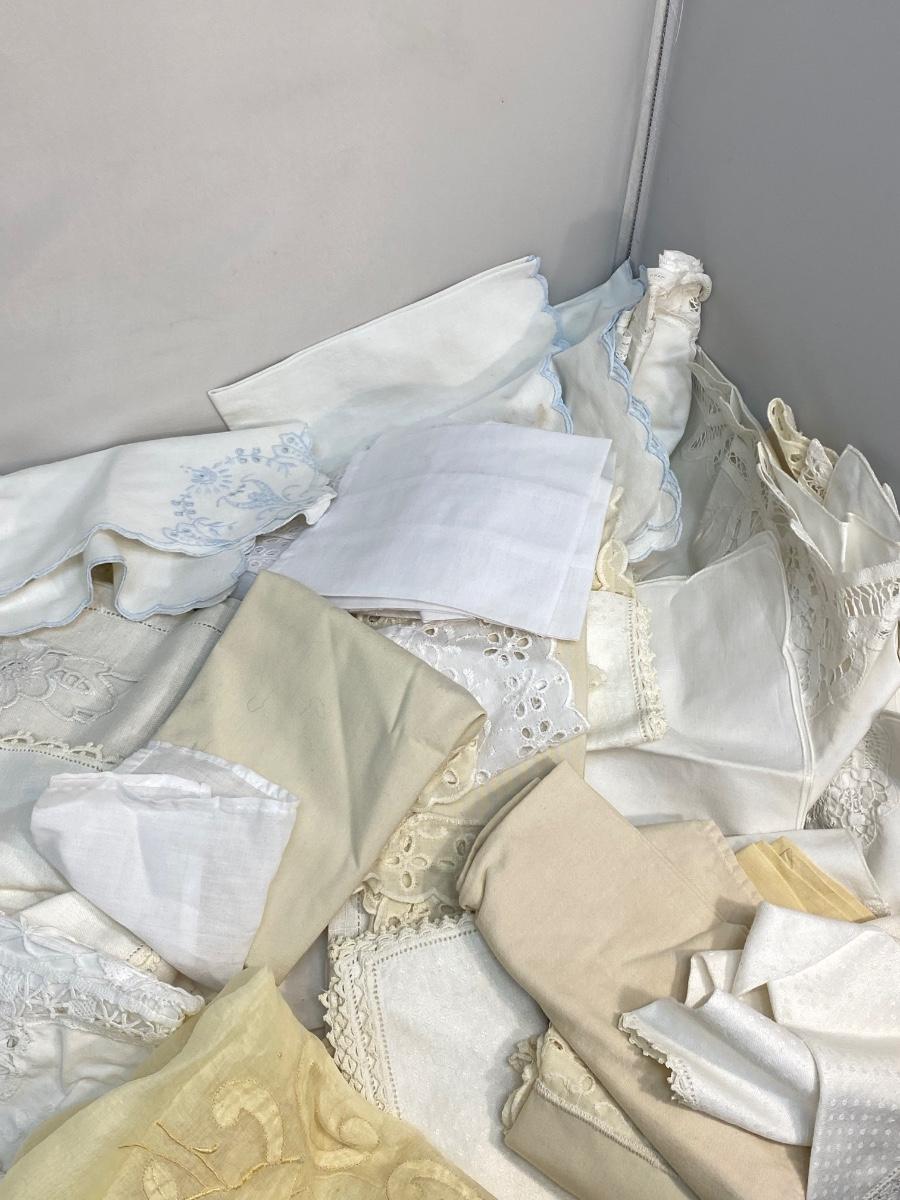 Mixed lot of vintage linens. Mostly cloth napkins. Large lot of various styles.