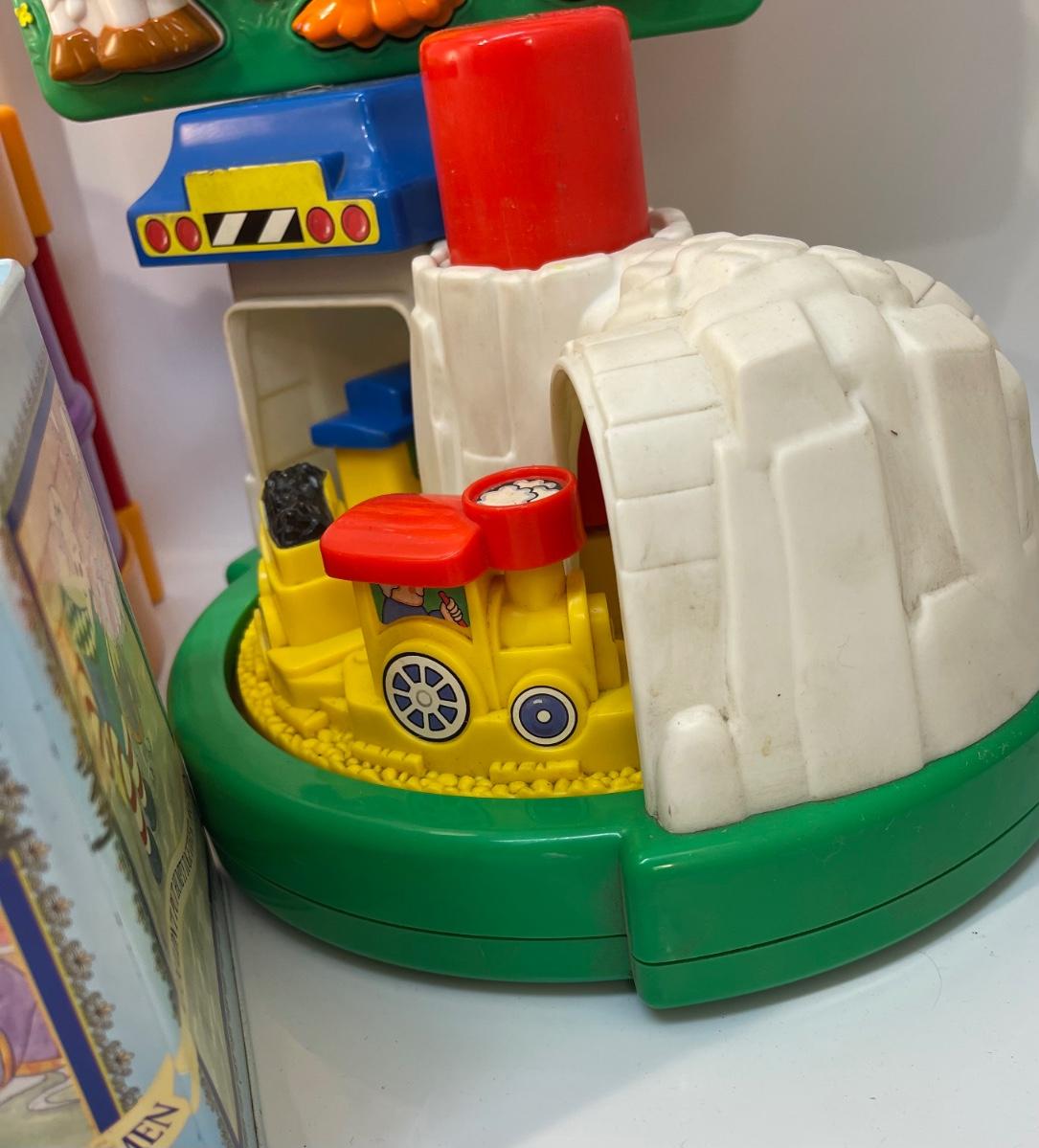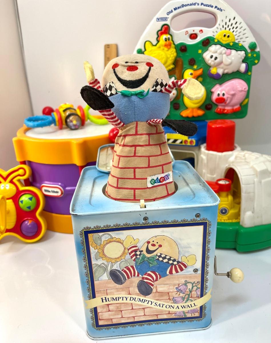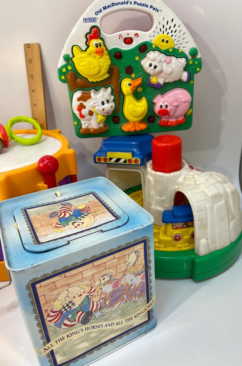 Mixed lot of vintage preschool toys -Train, drum, farm, pop the weasel, rattles