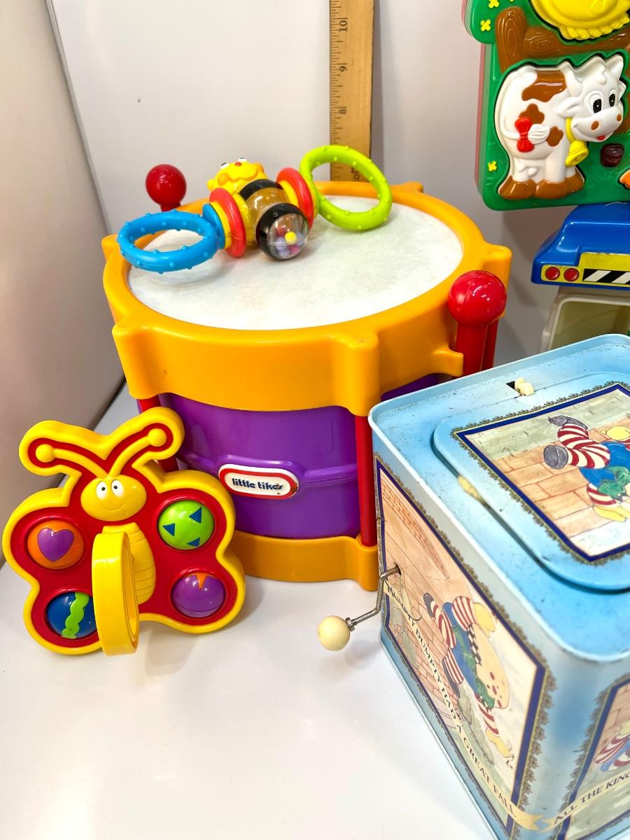 Train, drum, farm, pop the weasel, rattles in good used condition. Little tykes, the tech, Eden, and etc.