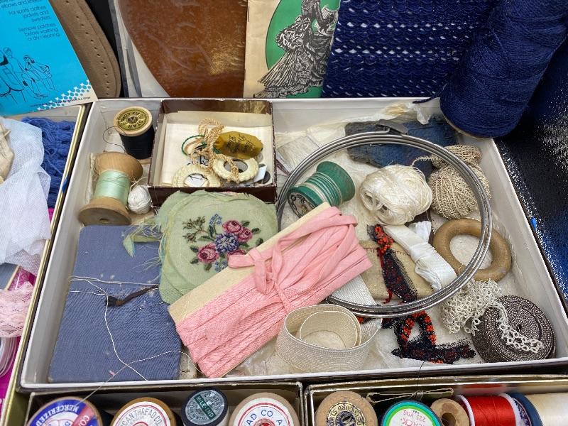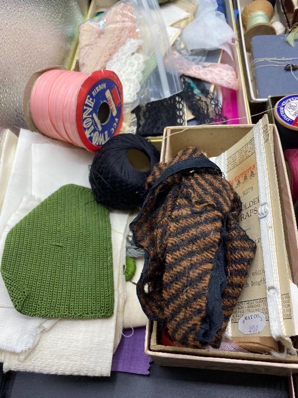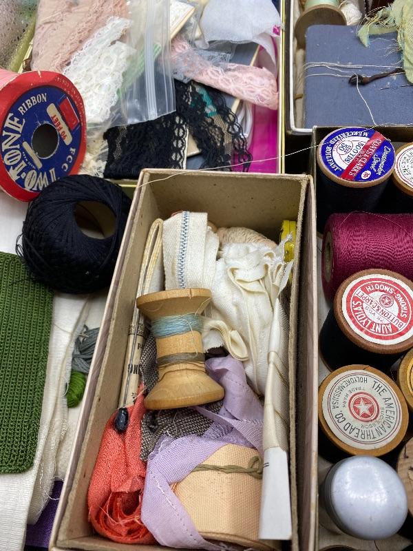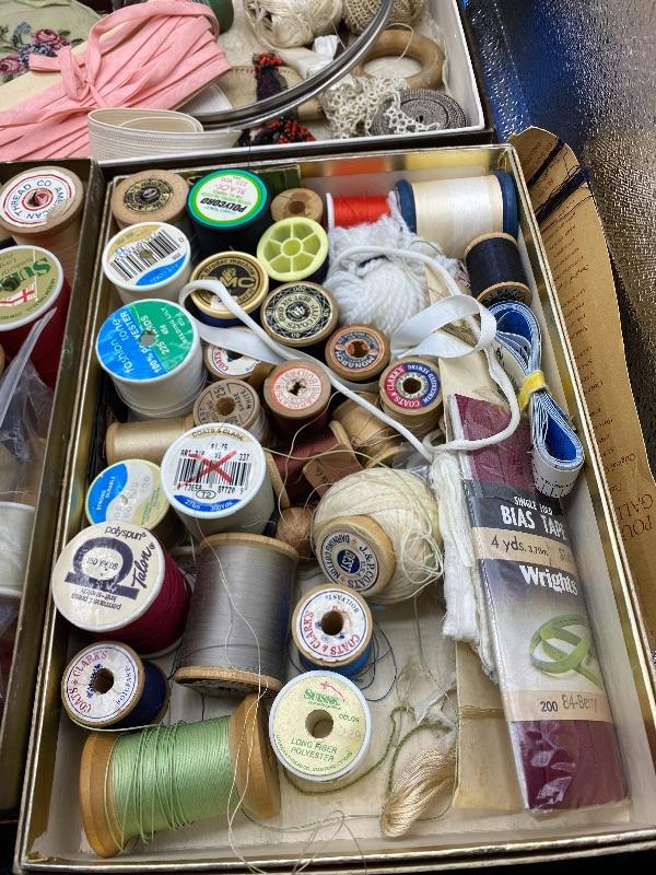 Mixed lot of vintage sewing supplies. Various threads, lace, and other odds and ends. Everything photo'd included.